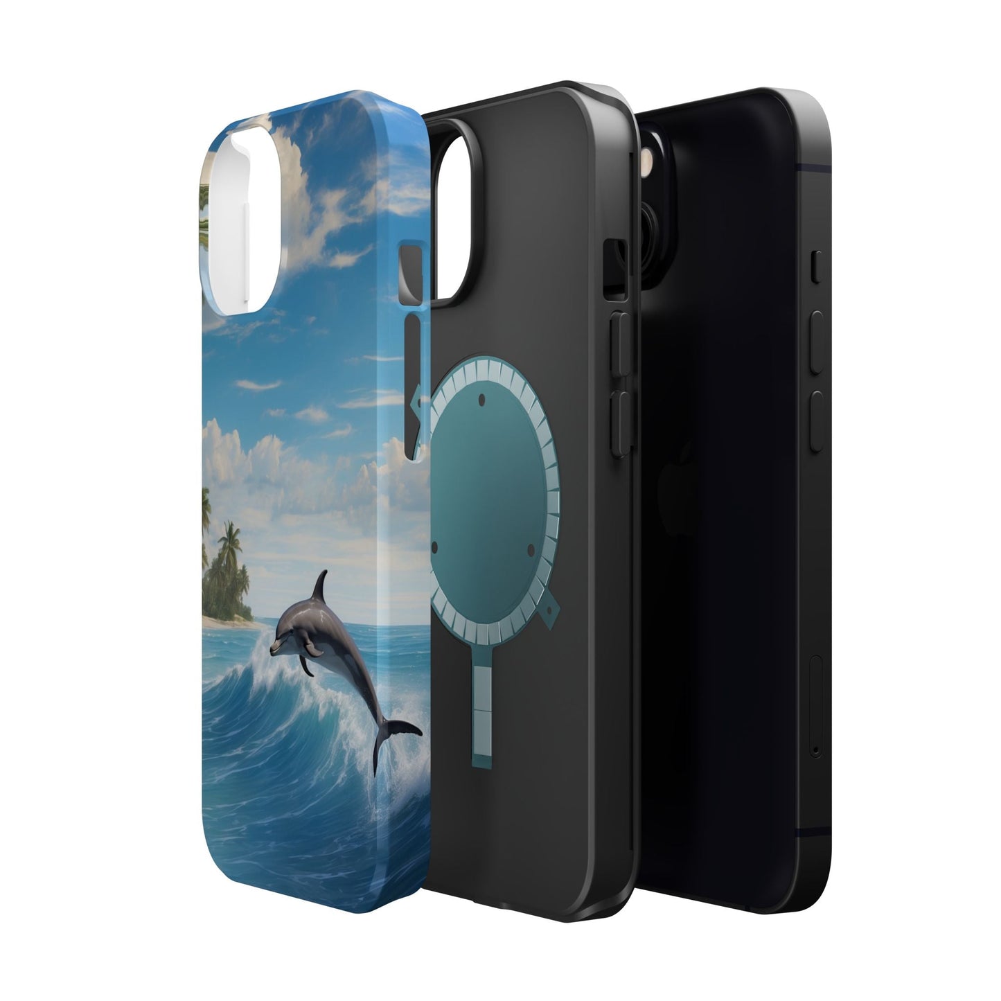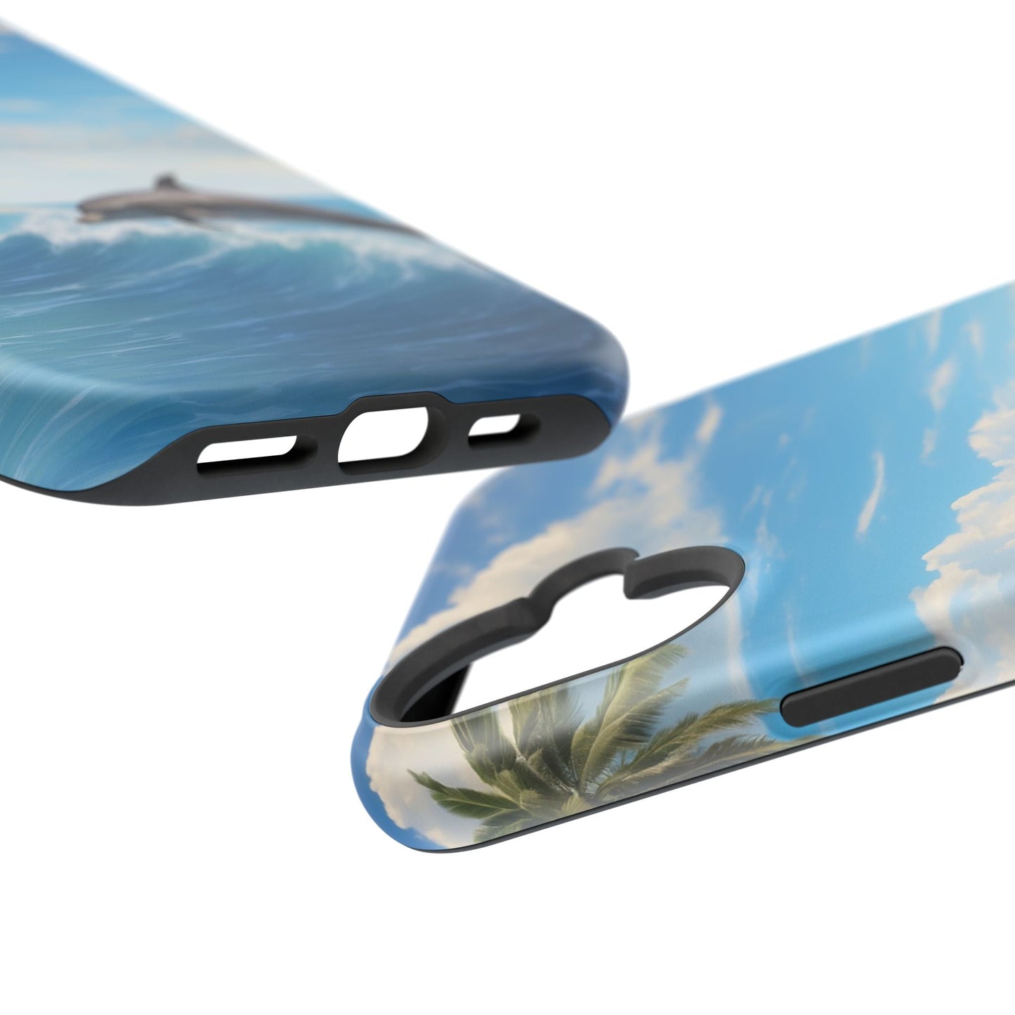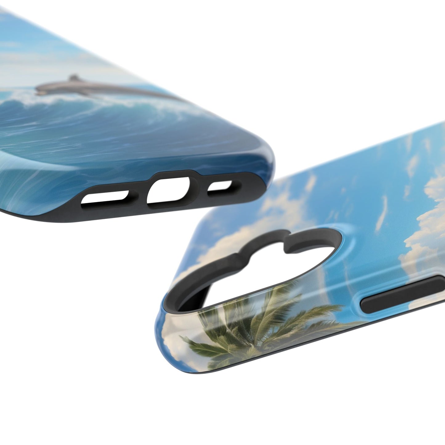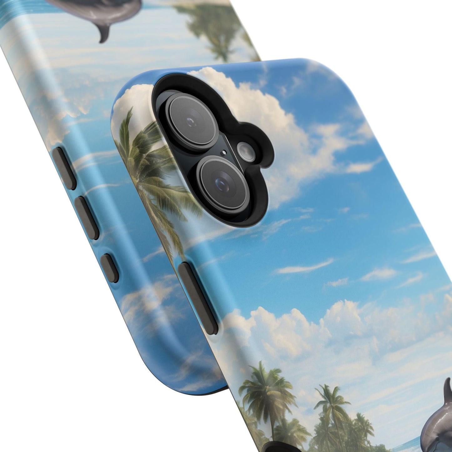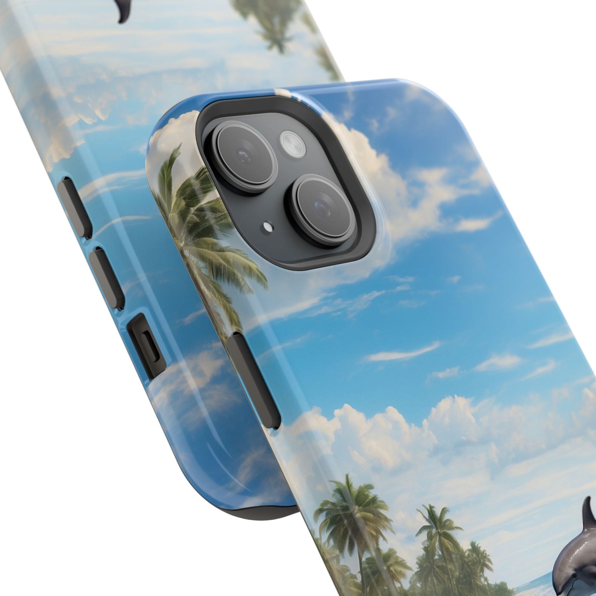 Ride the wave of convenience and style with this Tropical Surf Dolphin MagSafe Case! Featuring a majestic dolphin soaring over crystal-clear waves, this case brings a sense of freedom and ocean adventure to your device. With built-in MagSafe magnets for effortless wireless charging, plus a shockproof TPU bumper and hard polycarbonate shell, it’s both functional and stylish.
