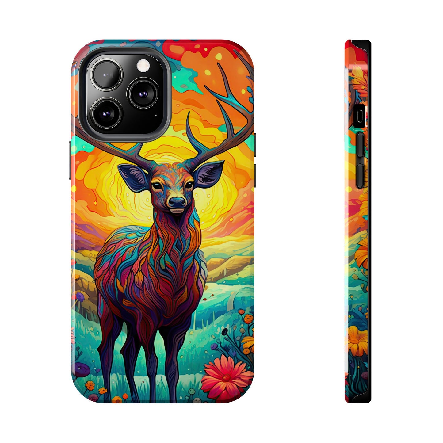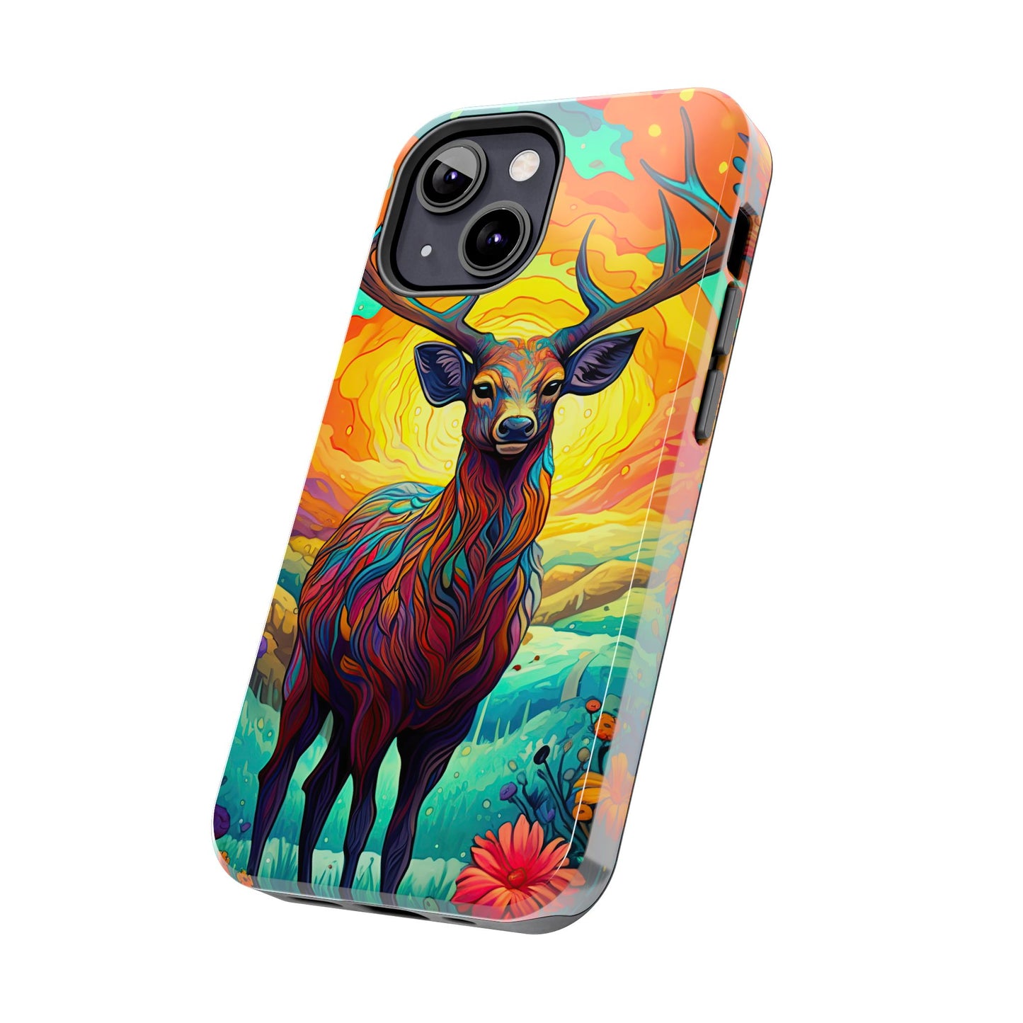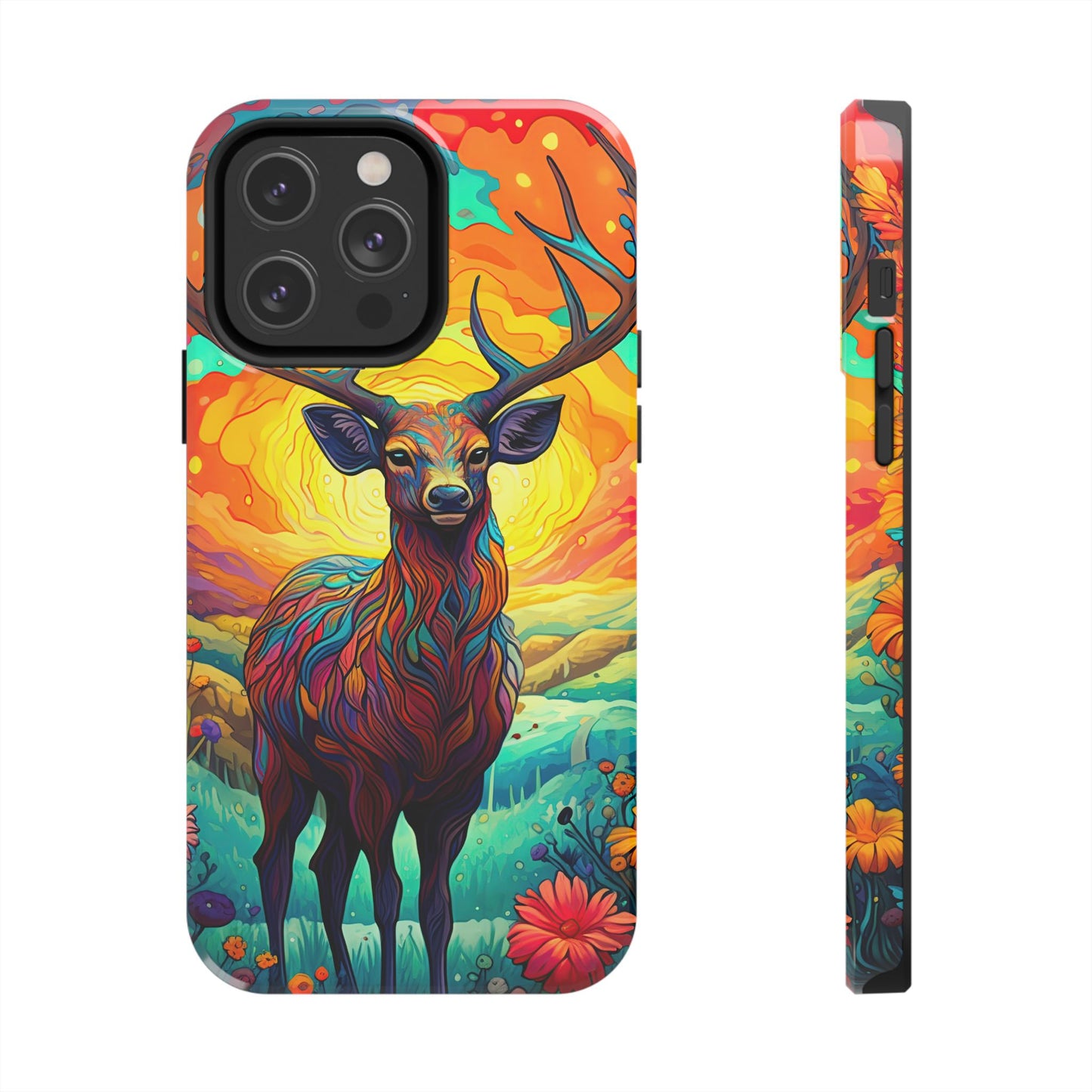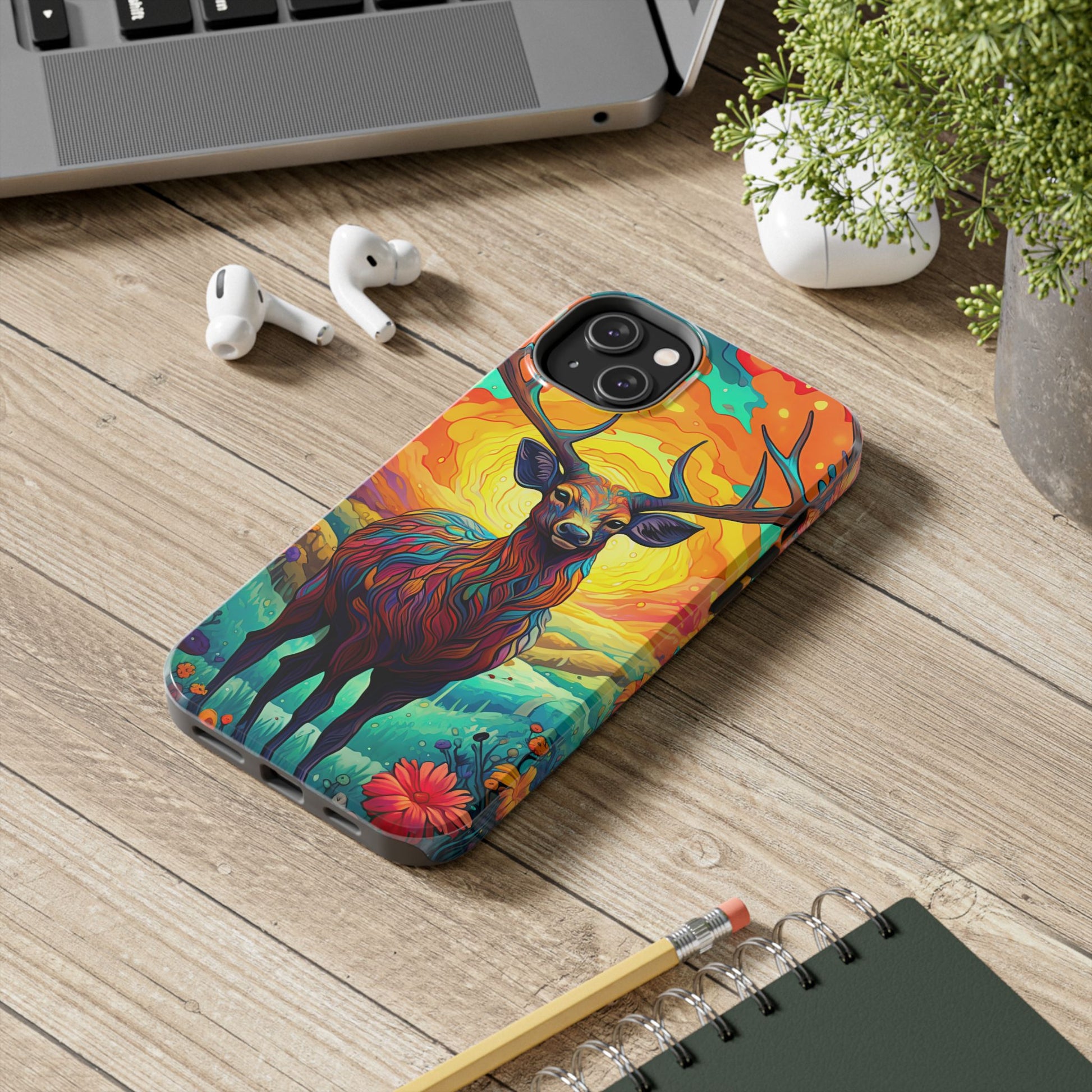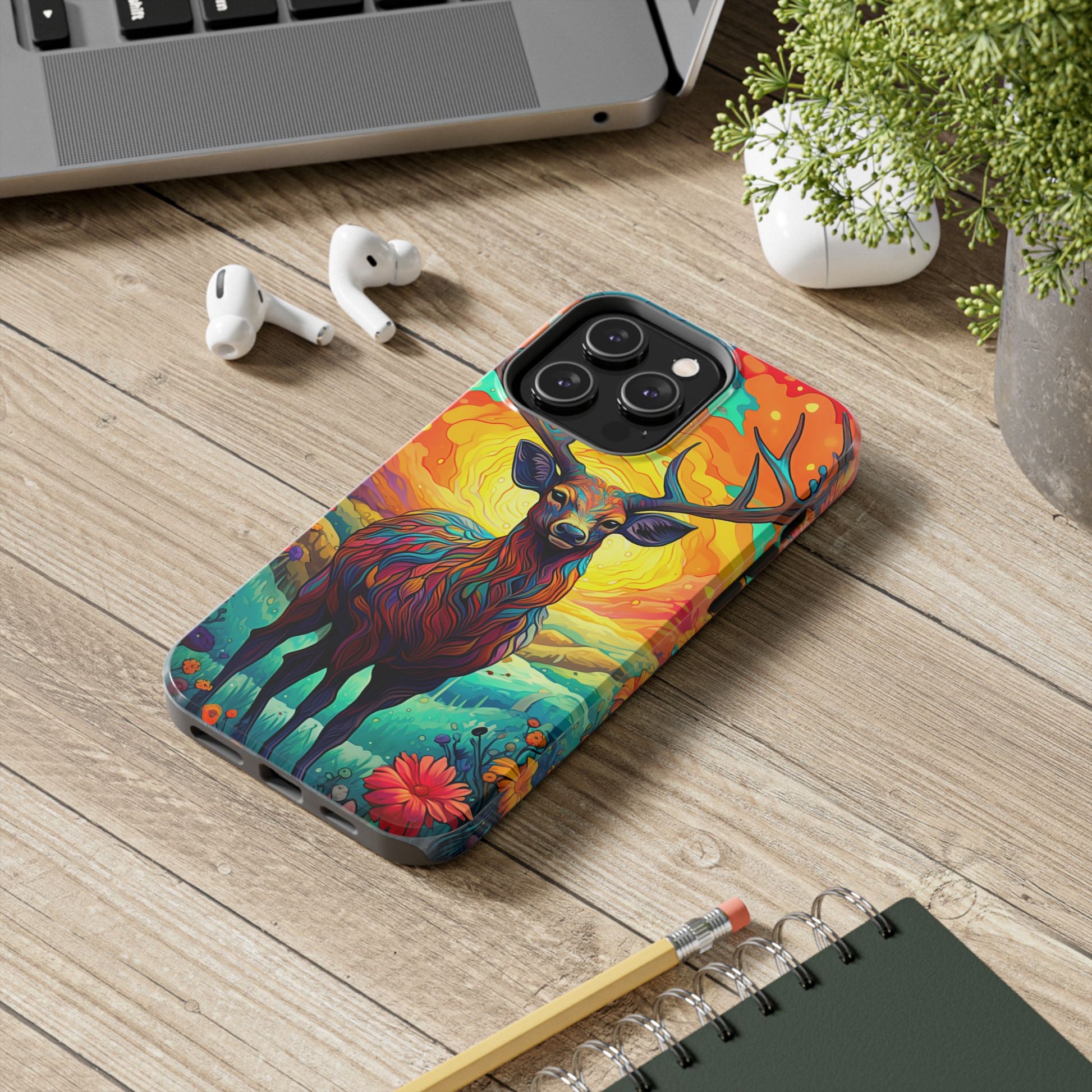 Show off your love for bold designs and nature with the Vibrant Stag in Bloom iPhone Case. This eye-catching artwork features a majestic deer surrounded by glowing wildflowers and a radiant sunset, all in a kaleidoscope of vivid colors. Perfect for combining artistry and practicality.
