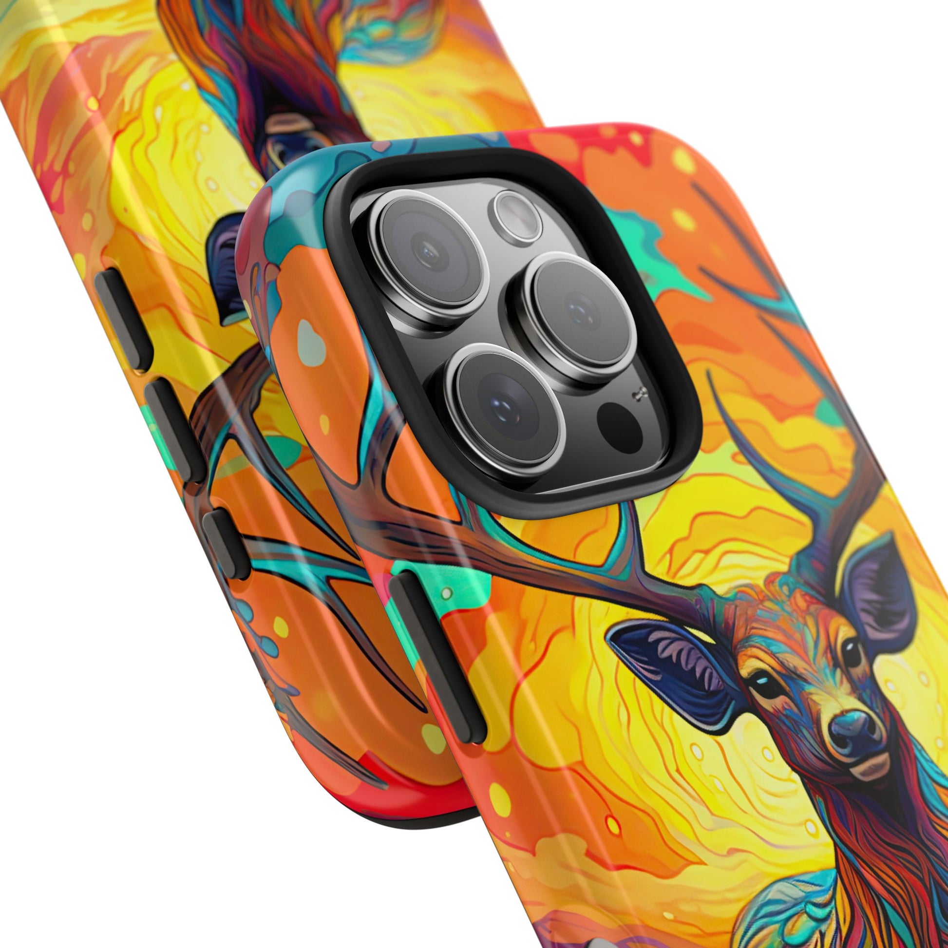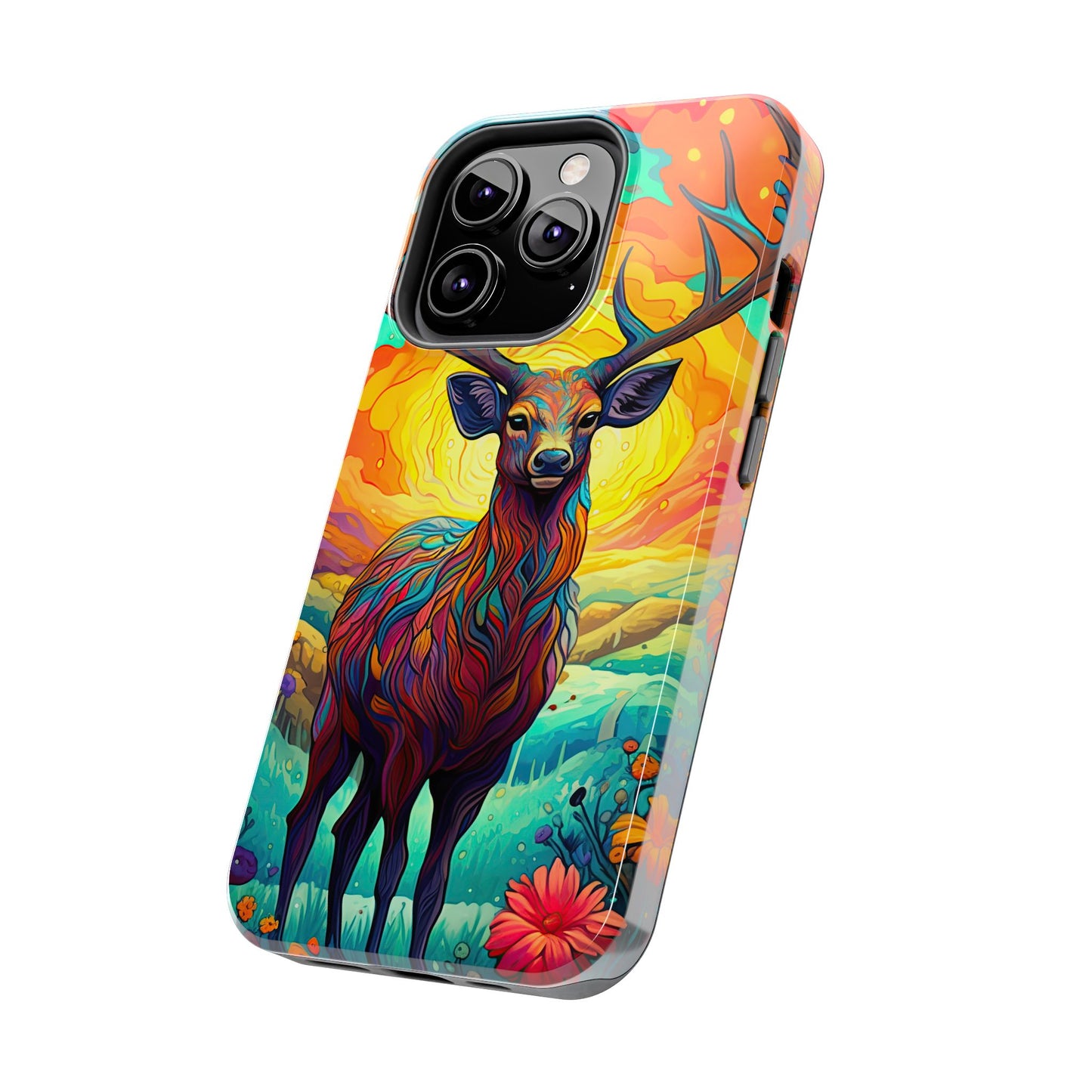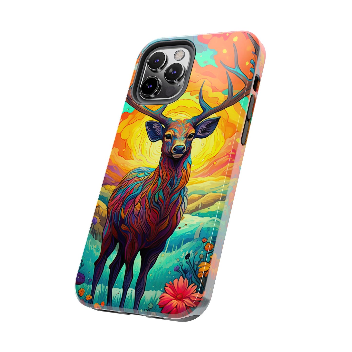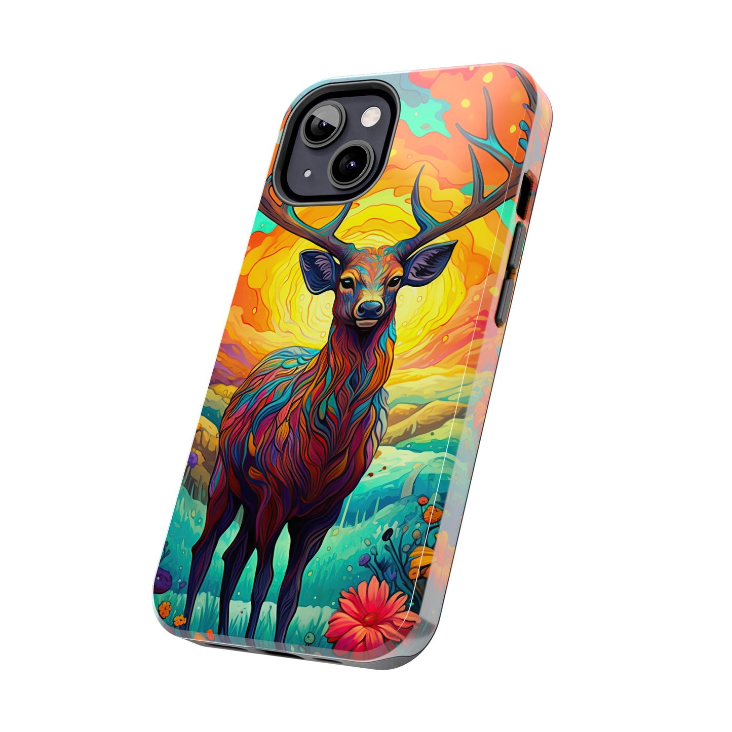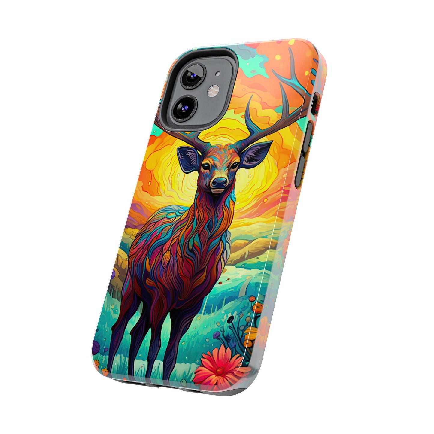 Show off your love for bold designs and nature with the Vibrant Stag in Bloom iPhone Case. This eye-catching artwork features a majestic deer surrounded by glowing wildflowers and a radiant sunset, all in a kaleidoscope of vivid colors. Perfect for combining artistry and practicality.