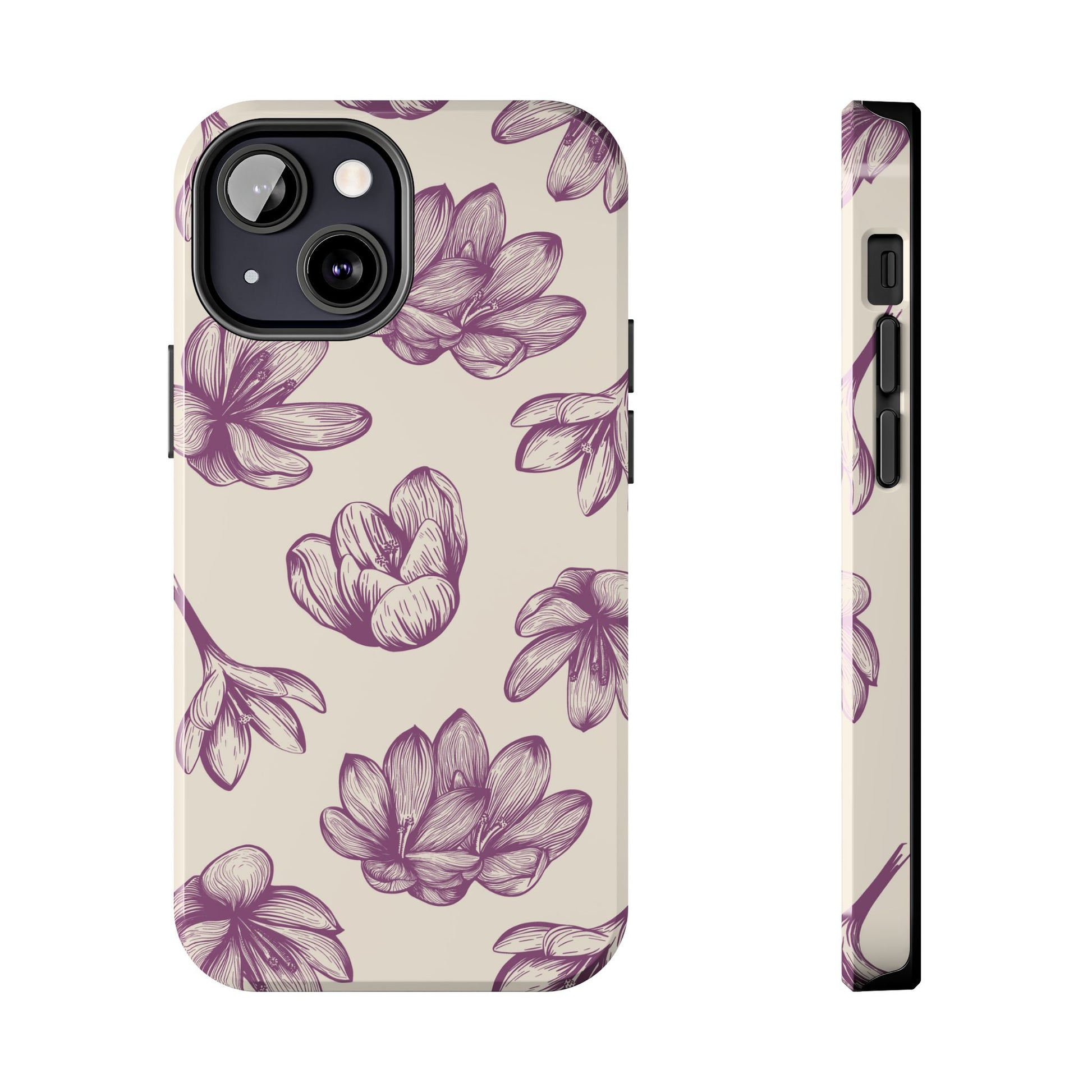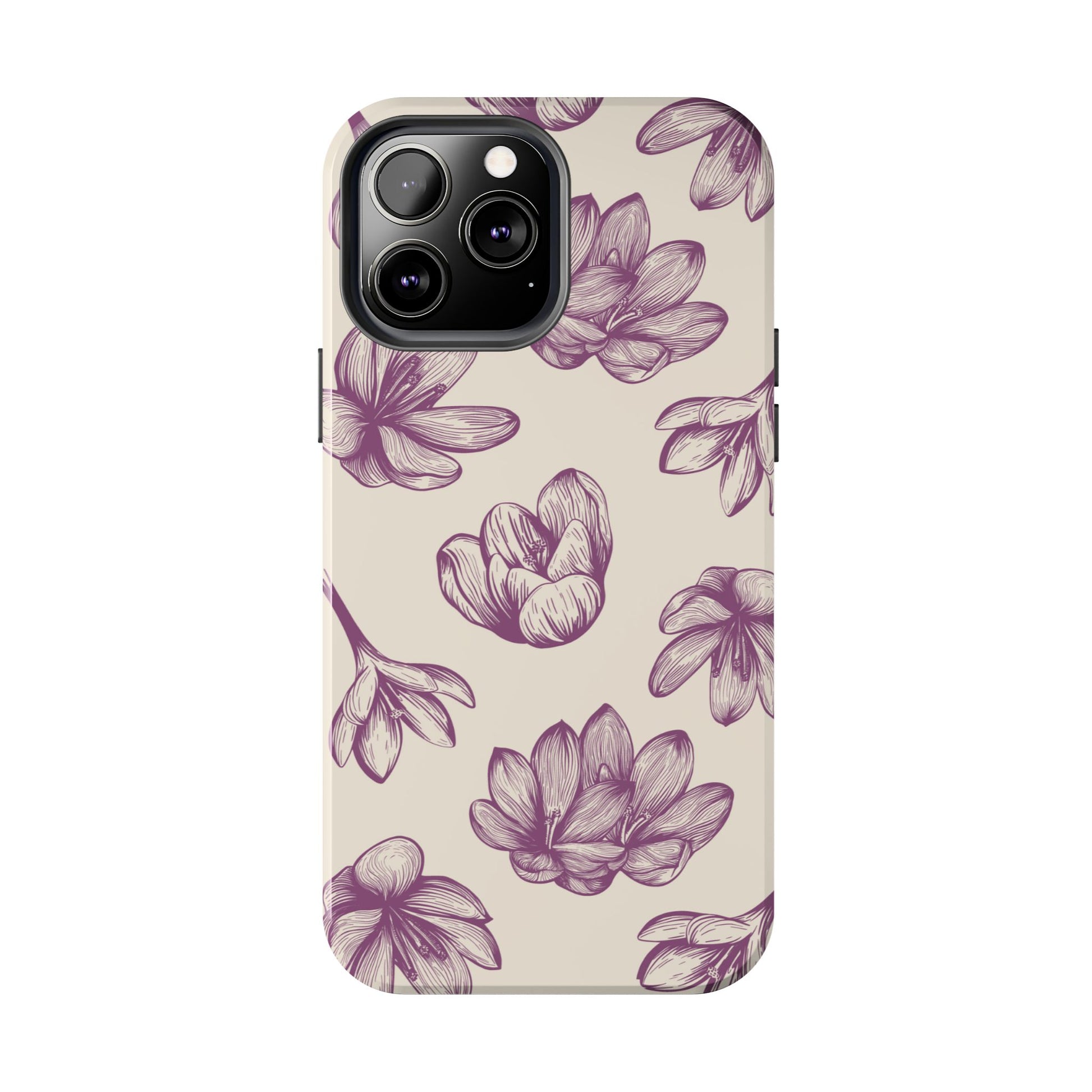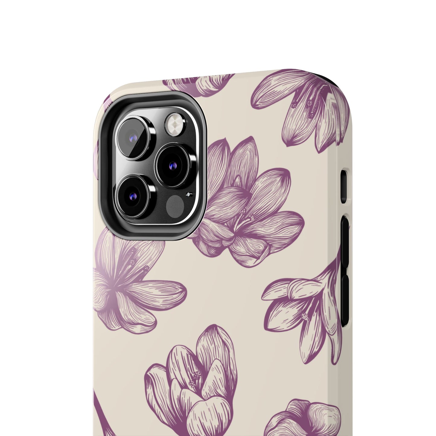 Vintage Botanical Floral Tough iPhone Case – Hand-Drawn Purple Flowers, Shockproof Design