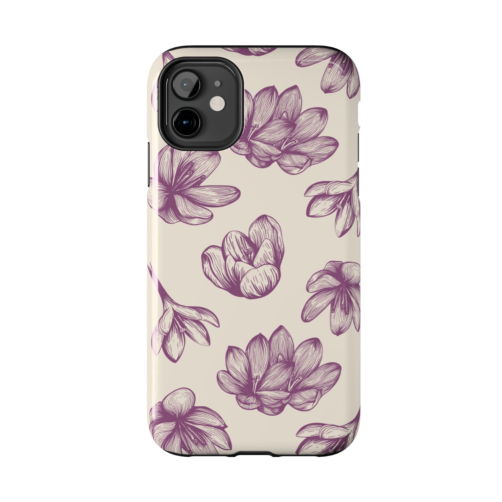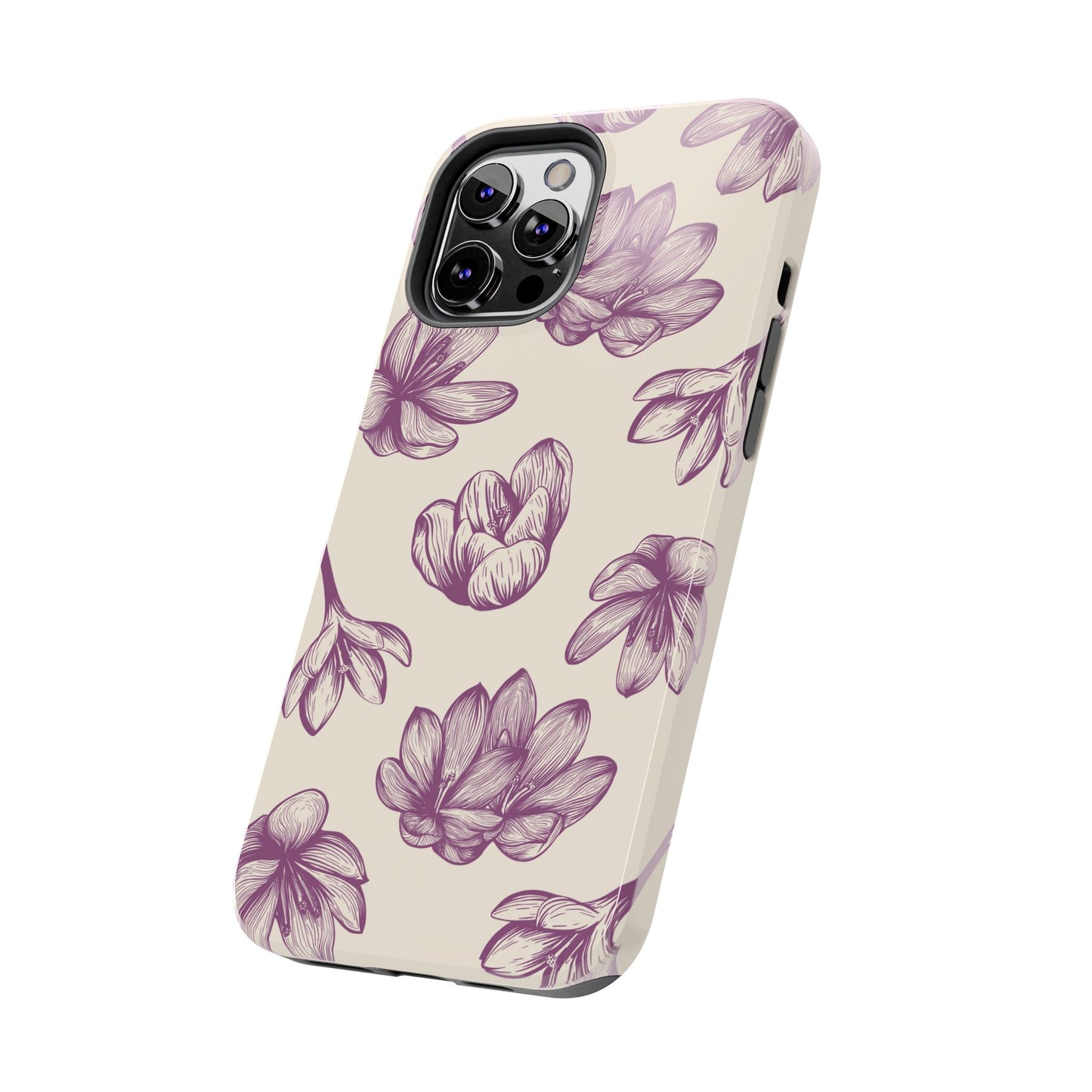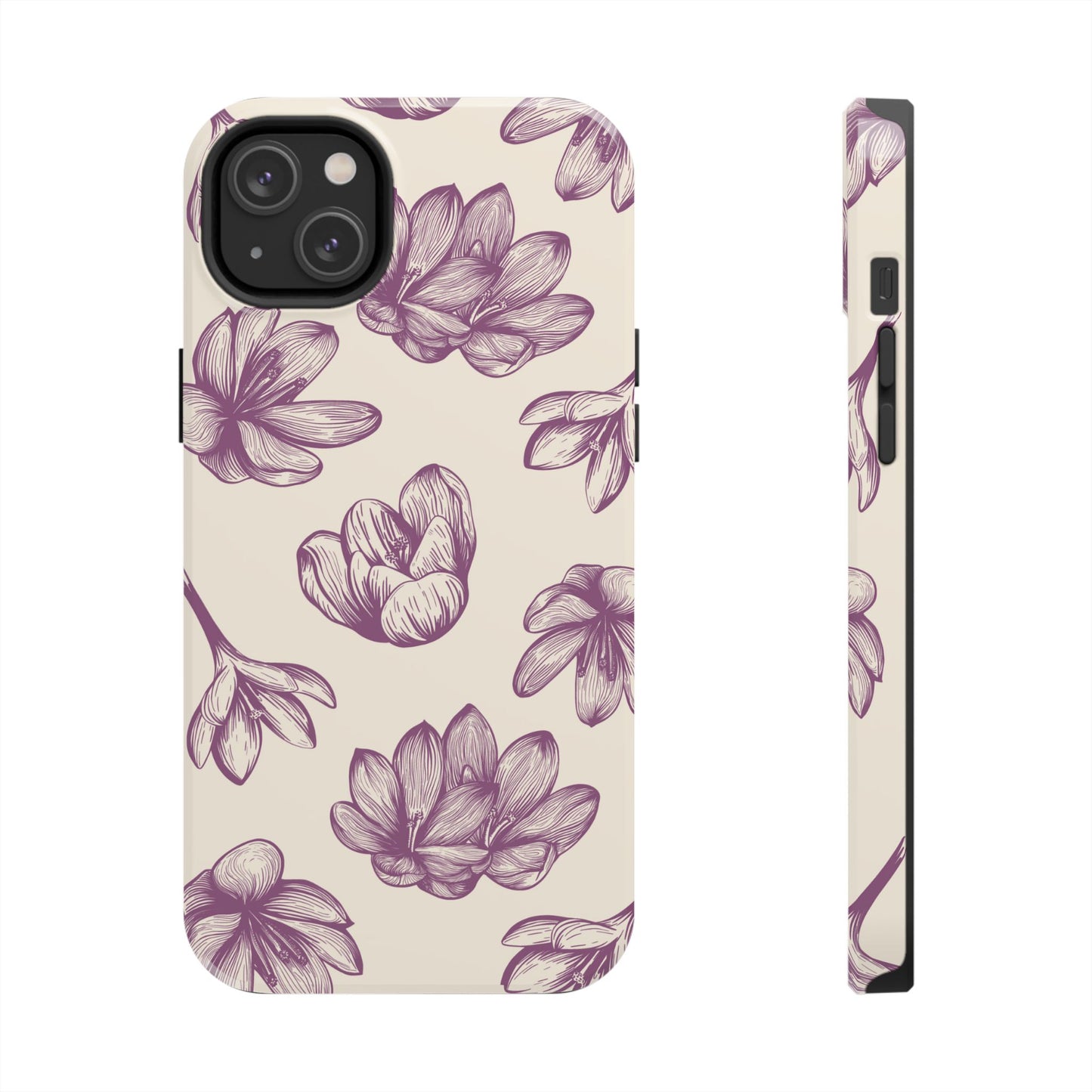 Vintage Botanical Floral Tough iPhone Case – Hand-Drawn Purple Flowers, Shockproof Design