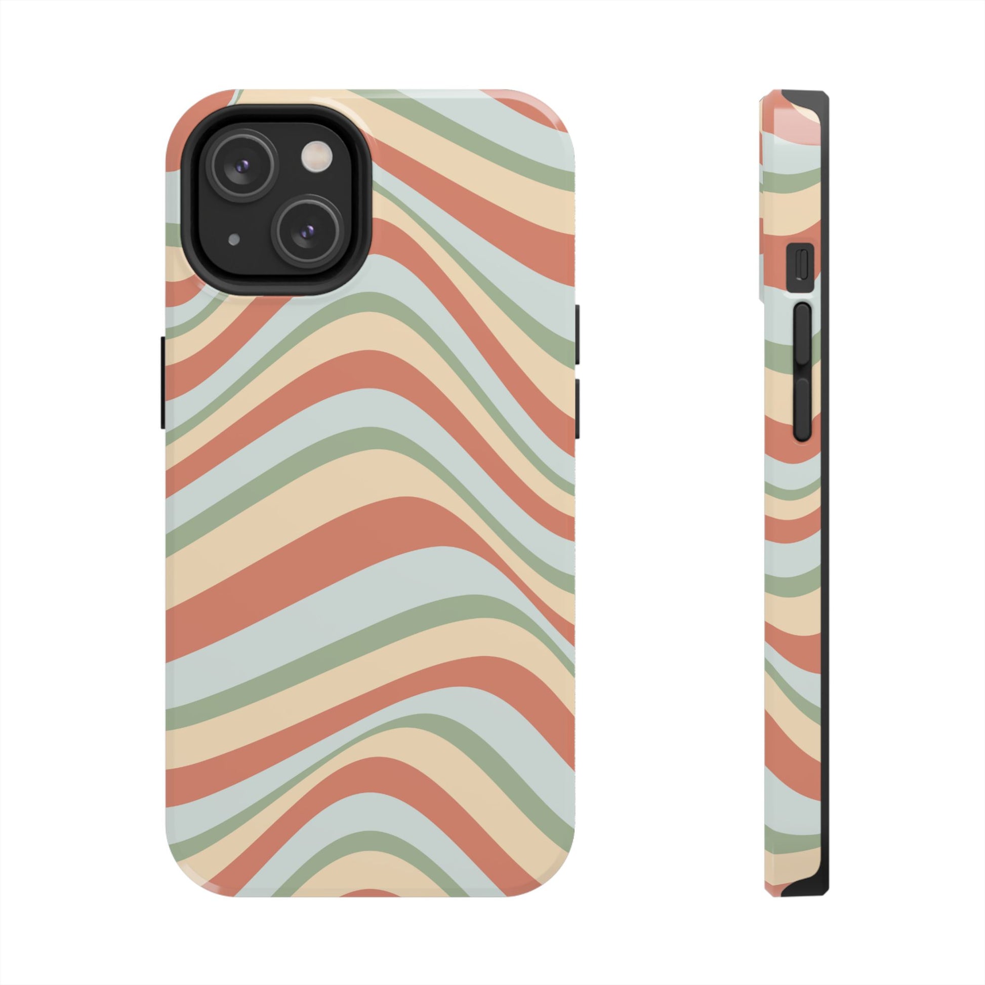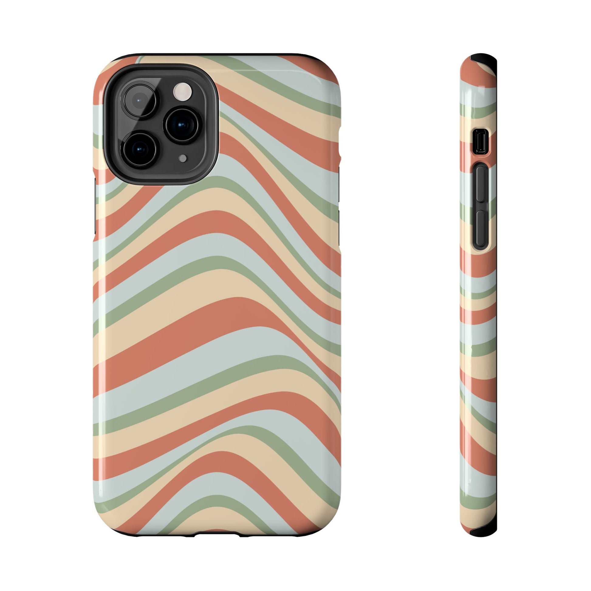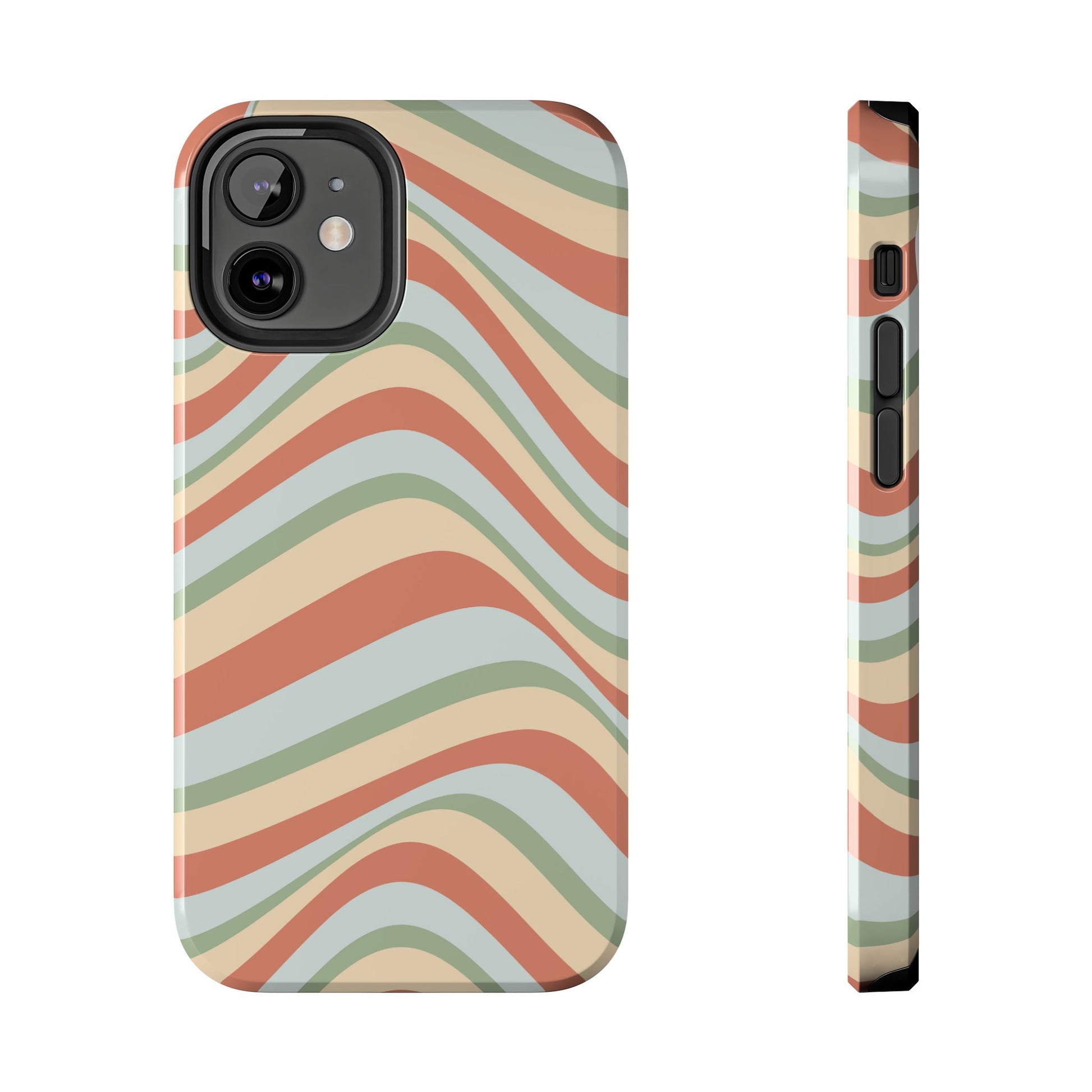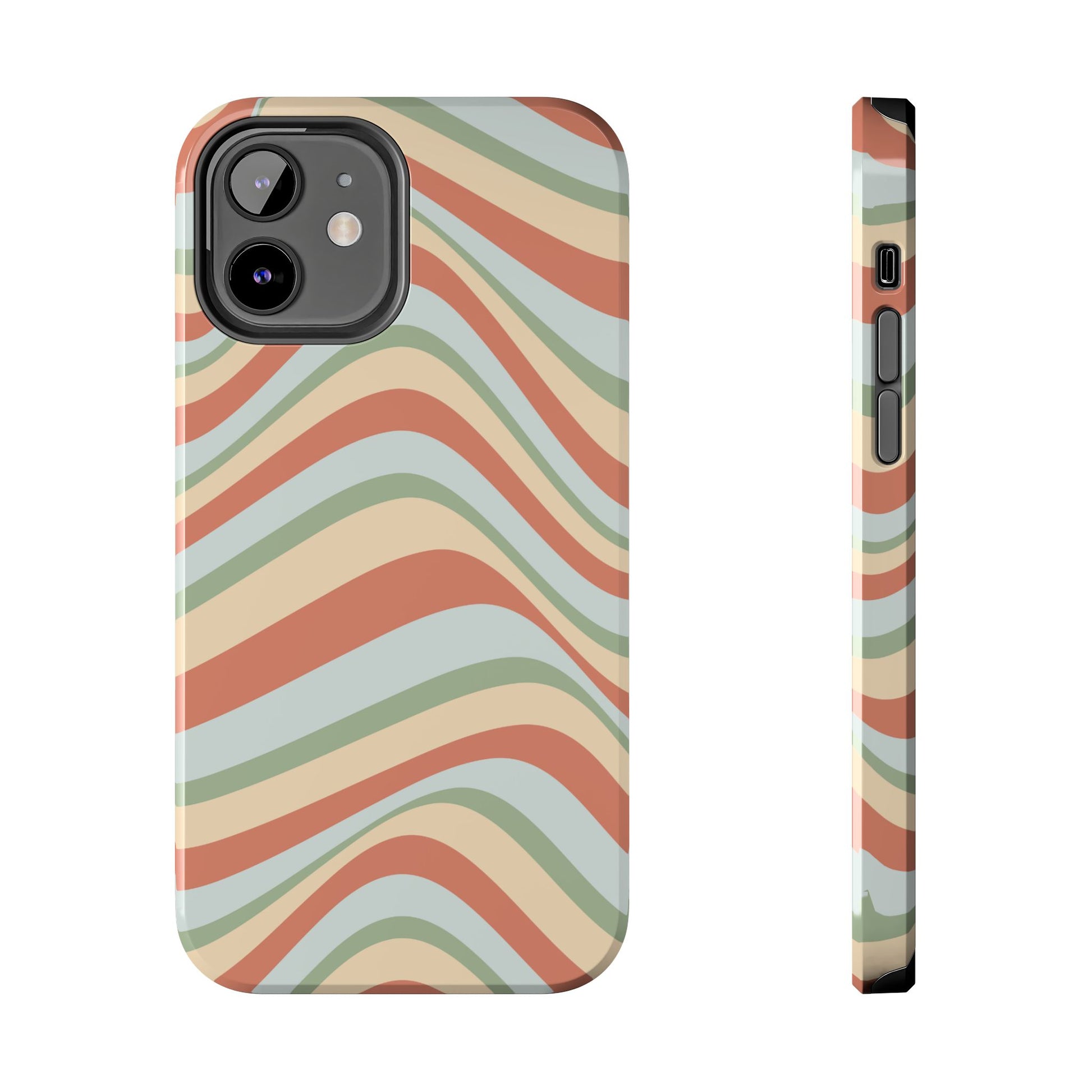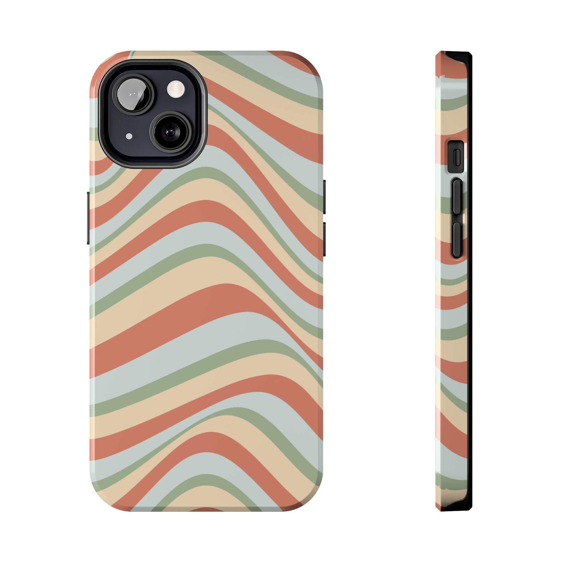 Embrace the retro vibe with our Vintage Earthy Waves iPhone Case, featuring a soothing, wavy stripe pattern in soft green, cream, and rust hues. This design brings a laid-back, earthy feel, reminiscent of the 70s, perfect for those who love a nostalgic yet modern aesthetic. The tough polycarbonate shell with a shock-absorbing inner layer ensures your phone is protected from everyday bumps and scratches, while its slim profile keeps your phone looking sleek. Ideal for adding a hint of vintage charm to your everyday accessories.