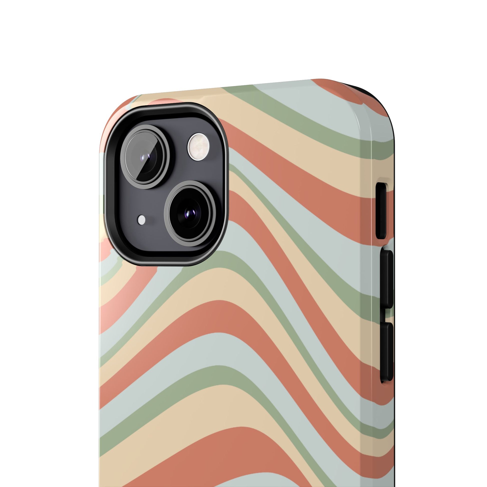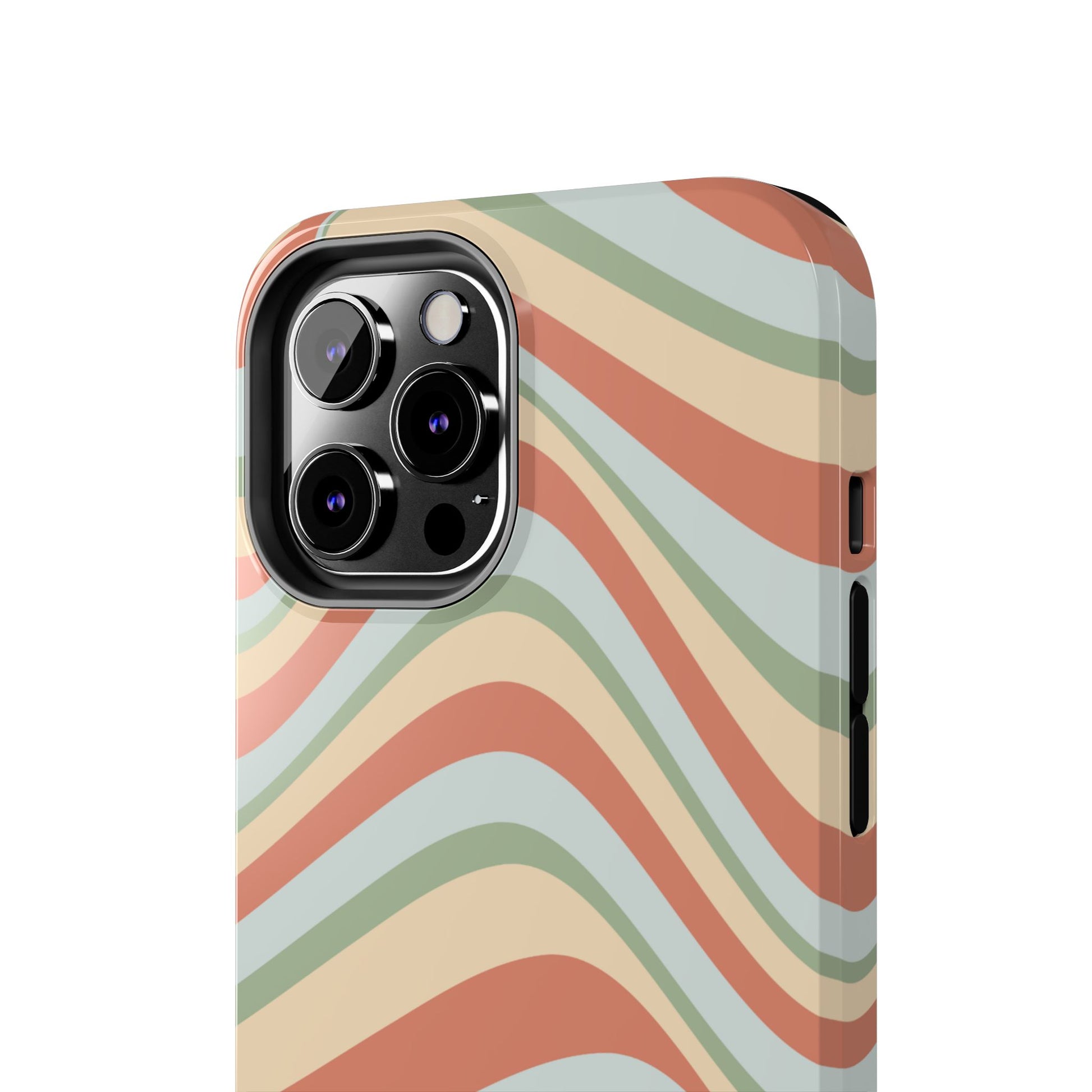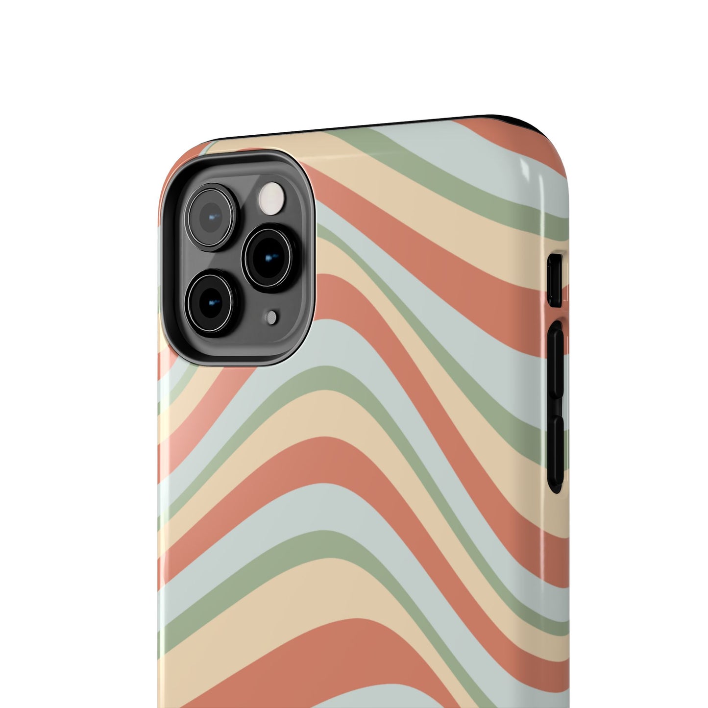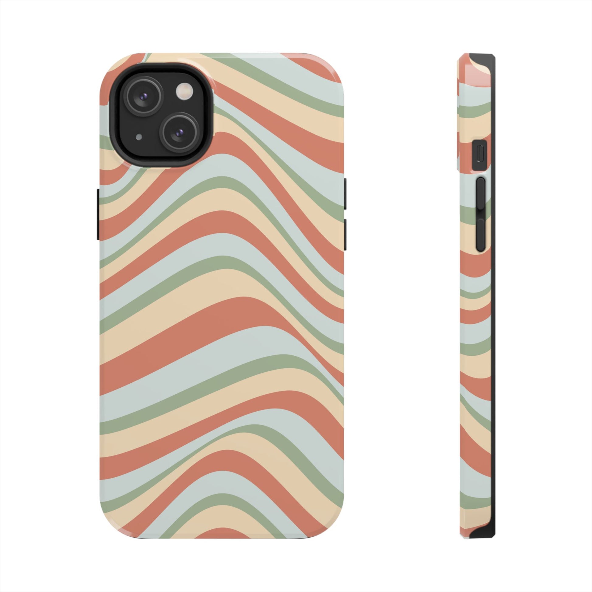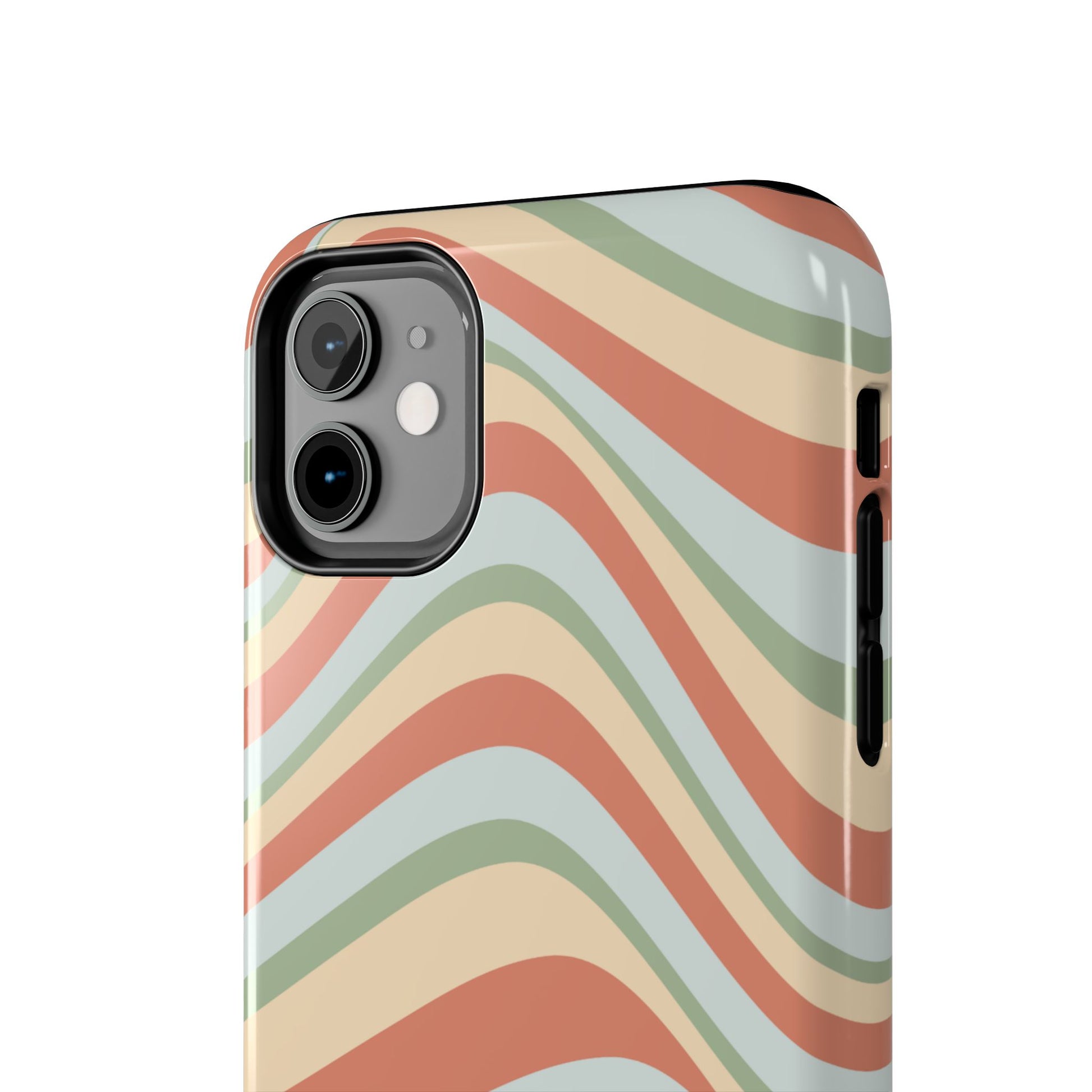 Embrace the retro vibe with our Vintage Earthy Waves iPhone Case, featuring a soothing, wavy stripe pattern in soft green, cream, and rust hues. This design brings a laid-back, earthy feel, reminiscent of the 70s, perfect for those who love a nostalgic yet modern aesthetic. The tough polycarbonate shell with a shock-absorbing inner layer ensures your phone is protected from everyday bumps and scratches, while its slim profile keeps your phone looking sleek. Ideal for adding a hint of vintage charm to your everyday accessories.