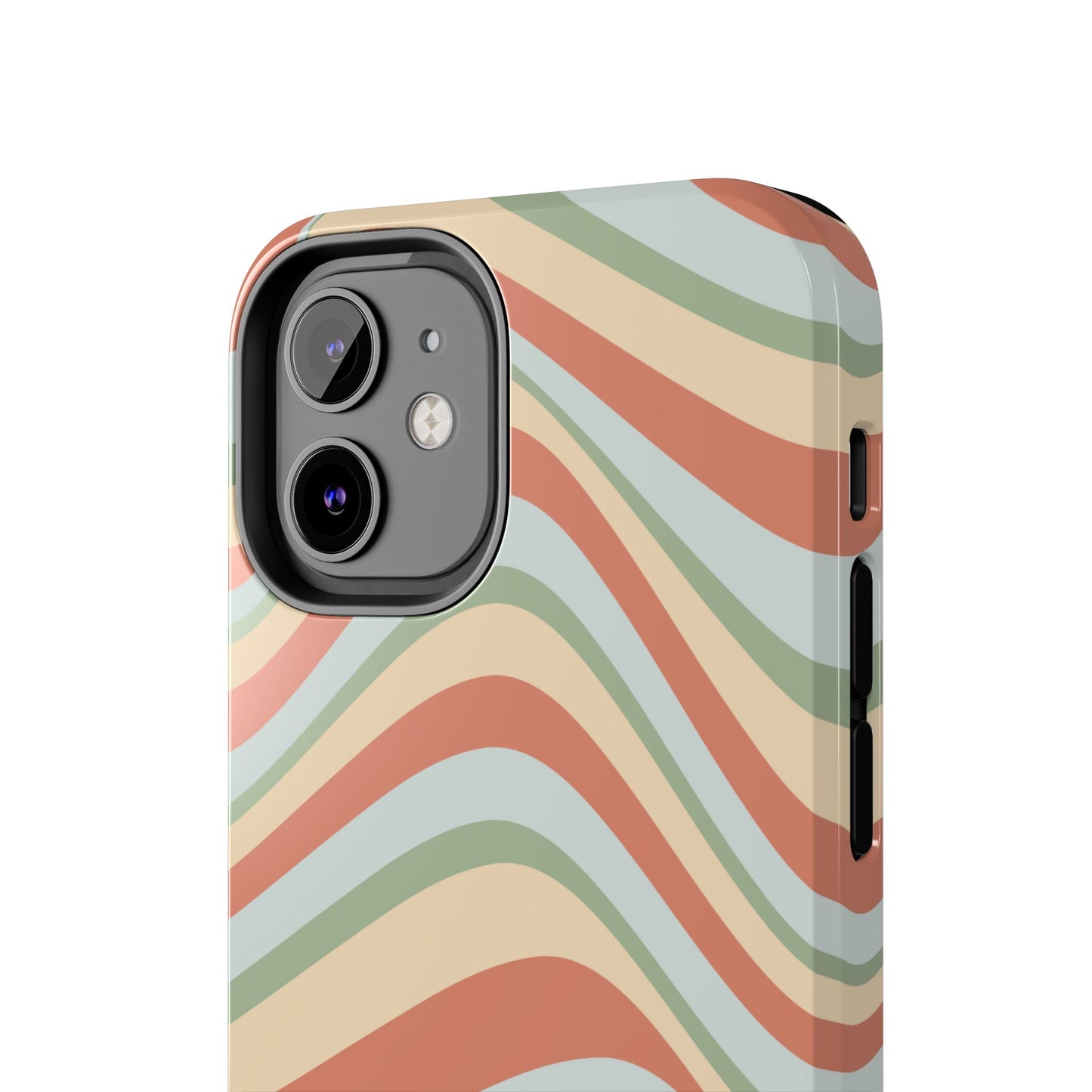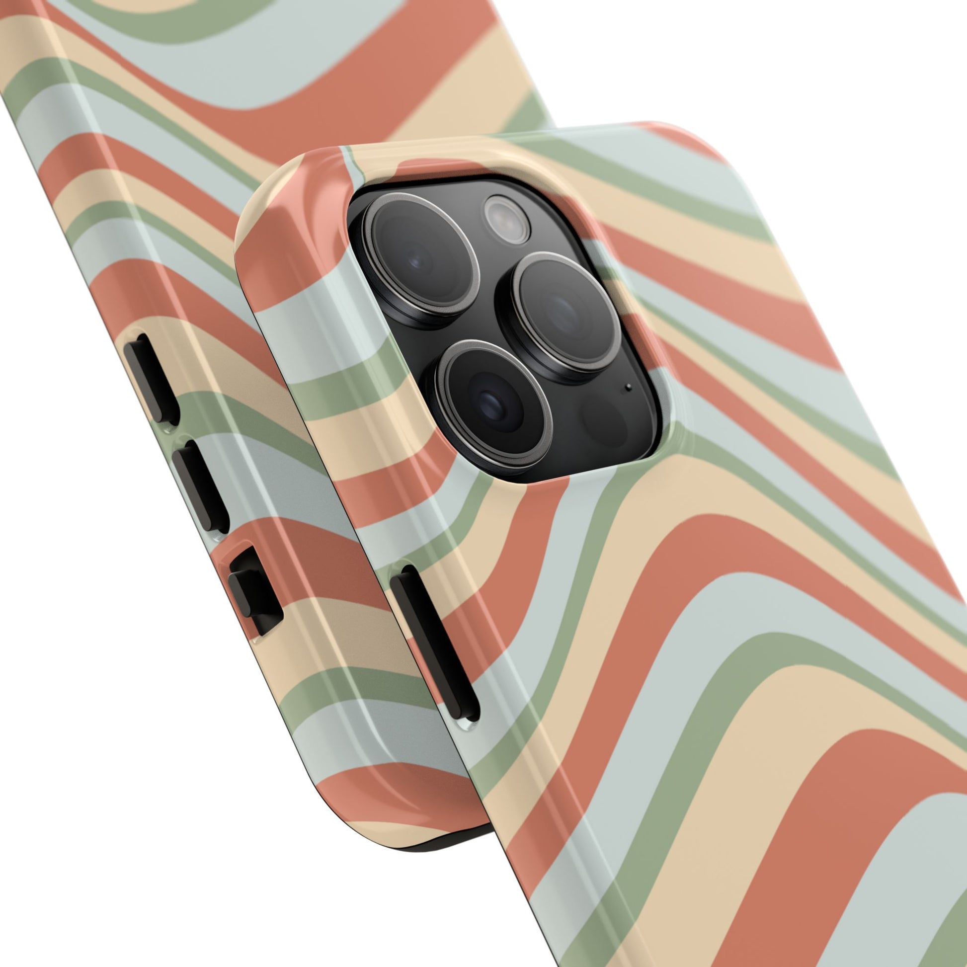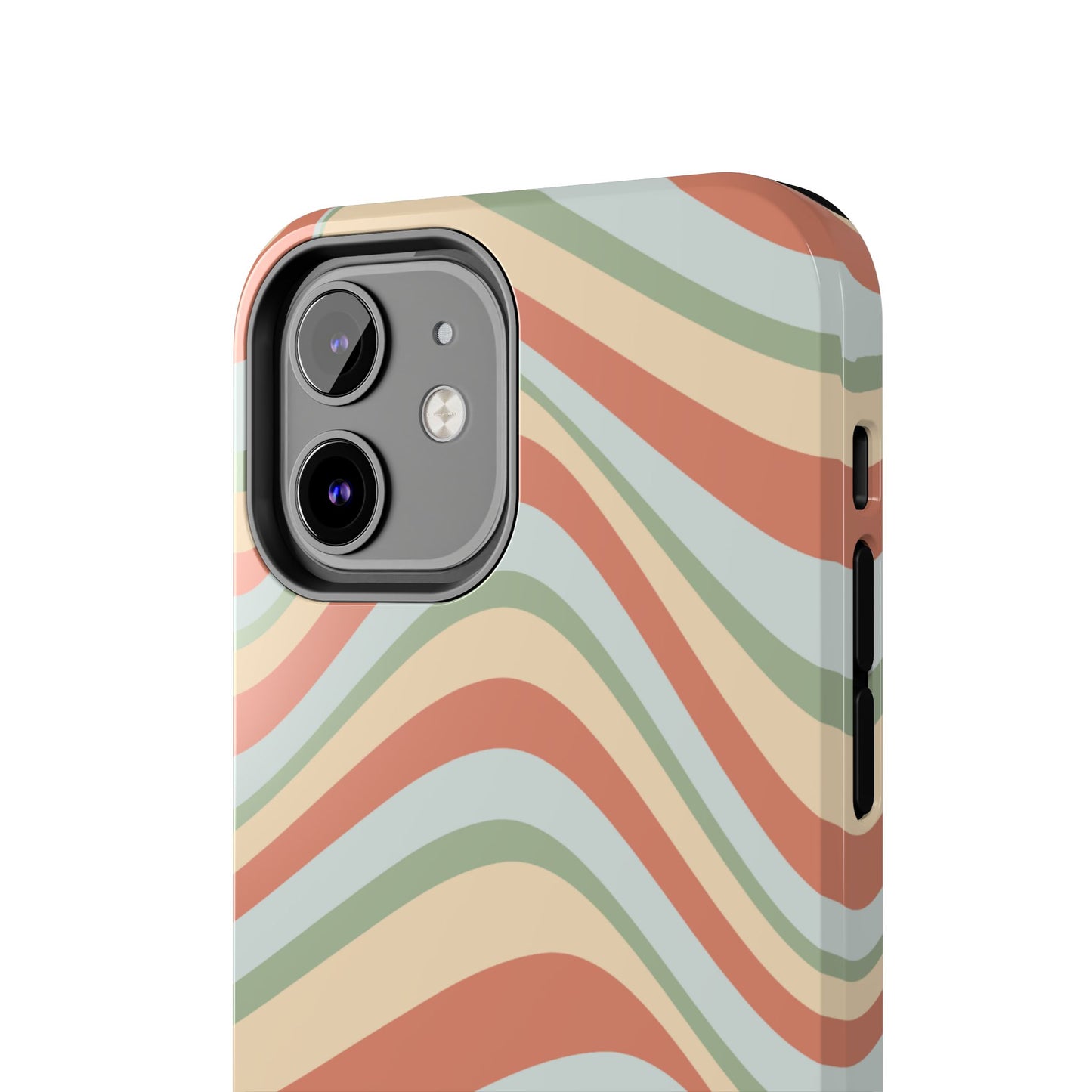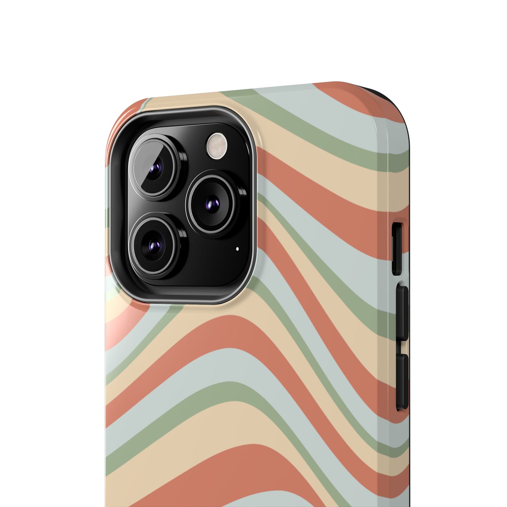 Embrace the retro vibe with our Vintage Earthy Waves iPhone Case, featuring a soothing, wavy stripe pattern in soft green, cream, and rust hues. This design brings a laid-back, earthy feel, reminiscent of the 70s, perfect for those who love a nostalgic yet modern aesthetic. The tough polycarbonate shell with a shock-absorbing inner layer ensures your phone is protected from everyday bumps and scratches, while its slim profile keeps your phone looking sleek. Ideal for adding a hint of vintage charm to your everyday accessories.