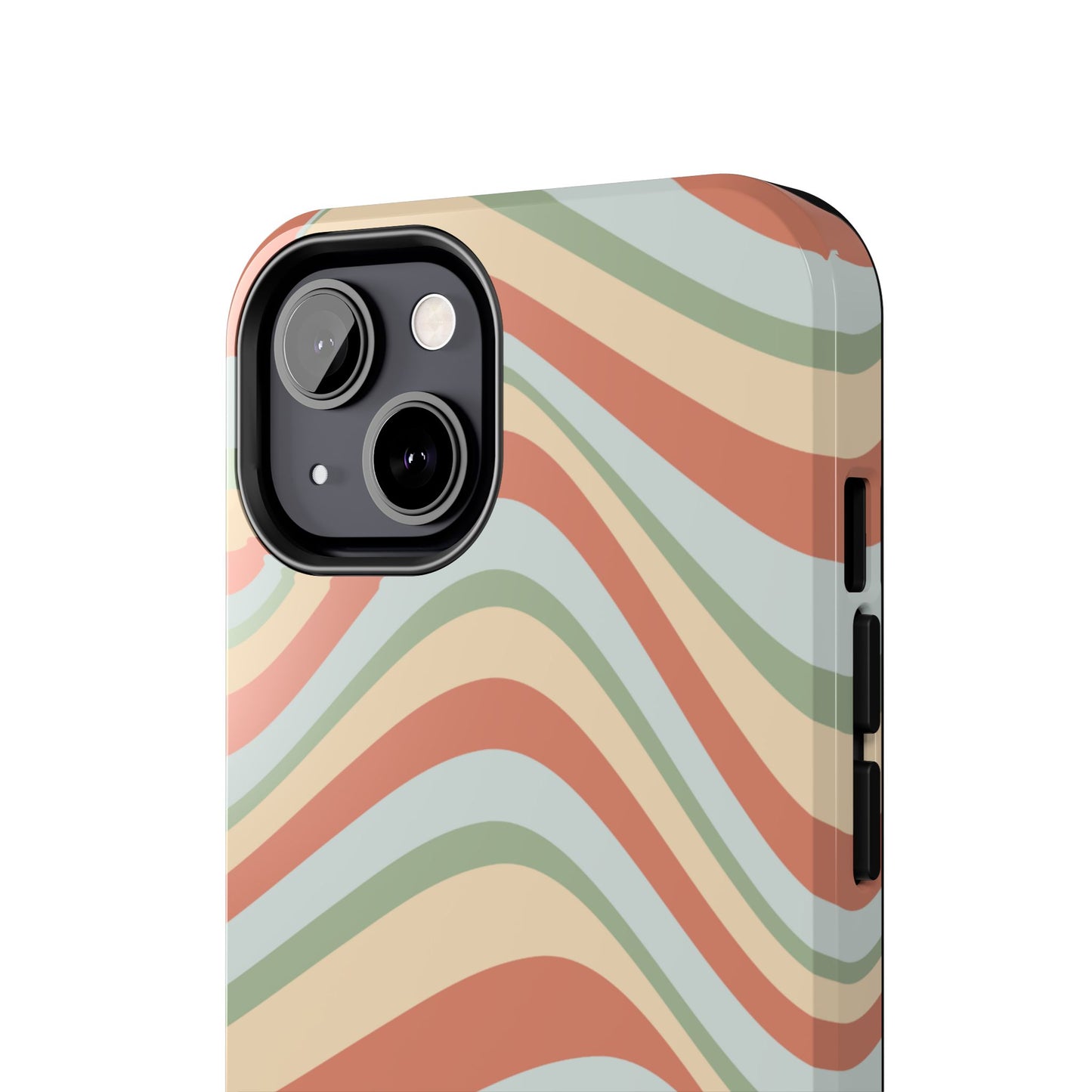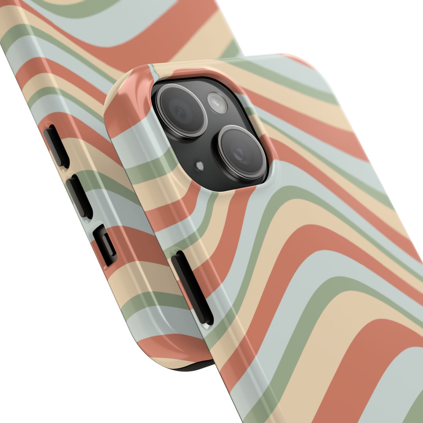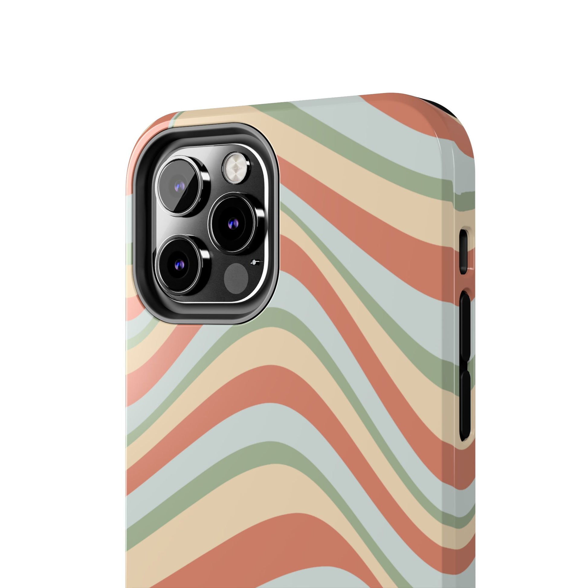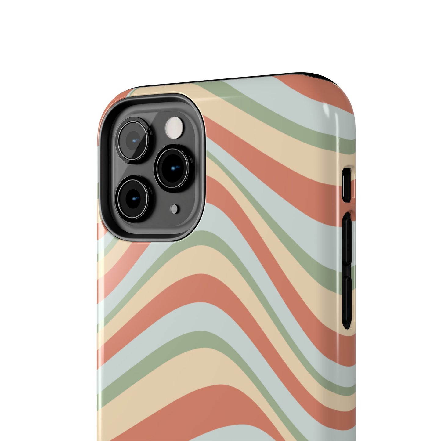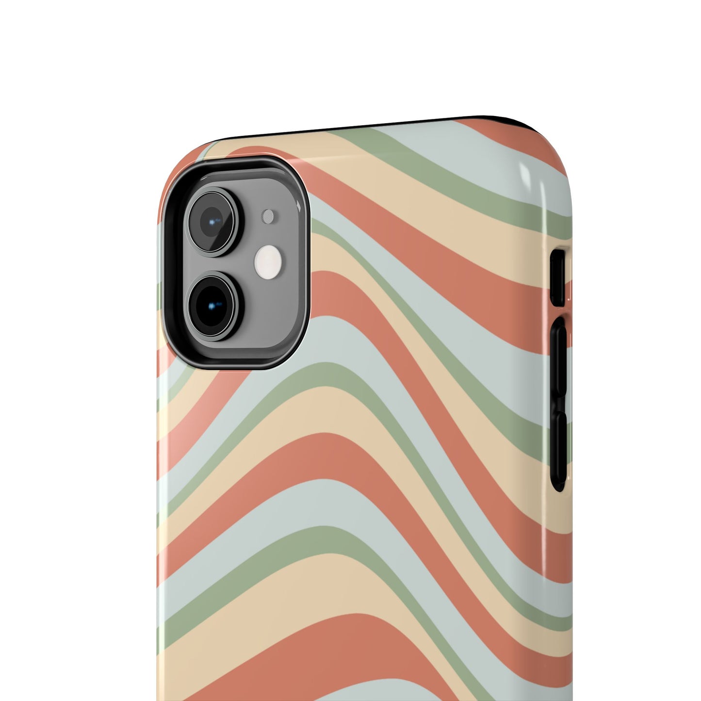 Embrace the retro vibe with our Vintage Earthy Waves iPhone Case, featuring a soothing, wavy stripe pattern in soft green, cream, and rust hues. This design brings a laid-back, earthy feel, reminiscent of the 70s, perfect for those who love a nostalgic yet modern aesthetic. The tough polycarbonate shell with a shock-absorbing inner layer ensures your phone is protected from everyday bumps and scratches, while its slim profile keeps your phone looking sleek. Ideal for adding a hint of vintage charm to your everyday accessories.