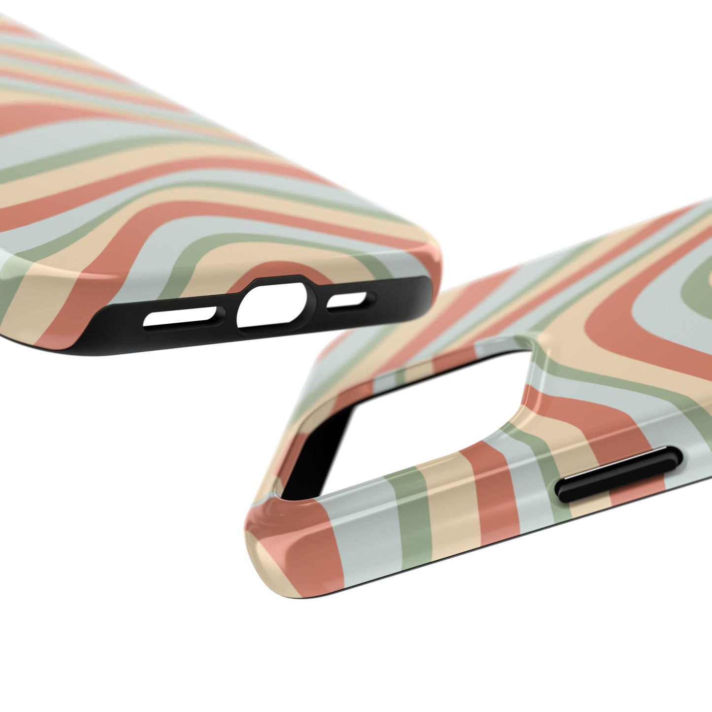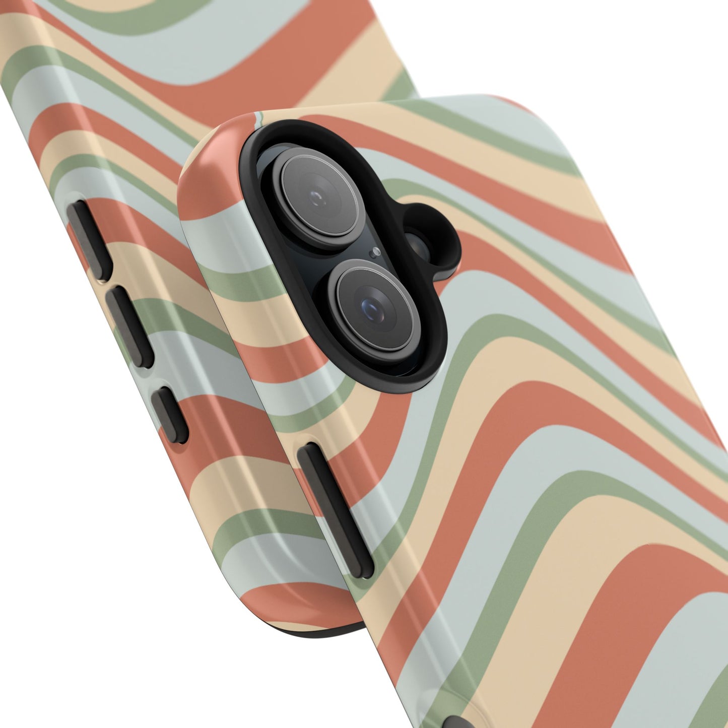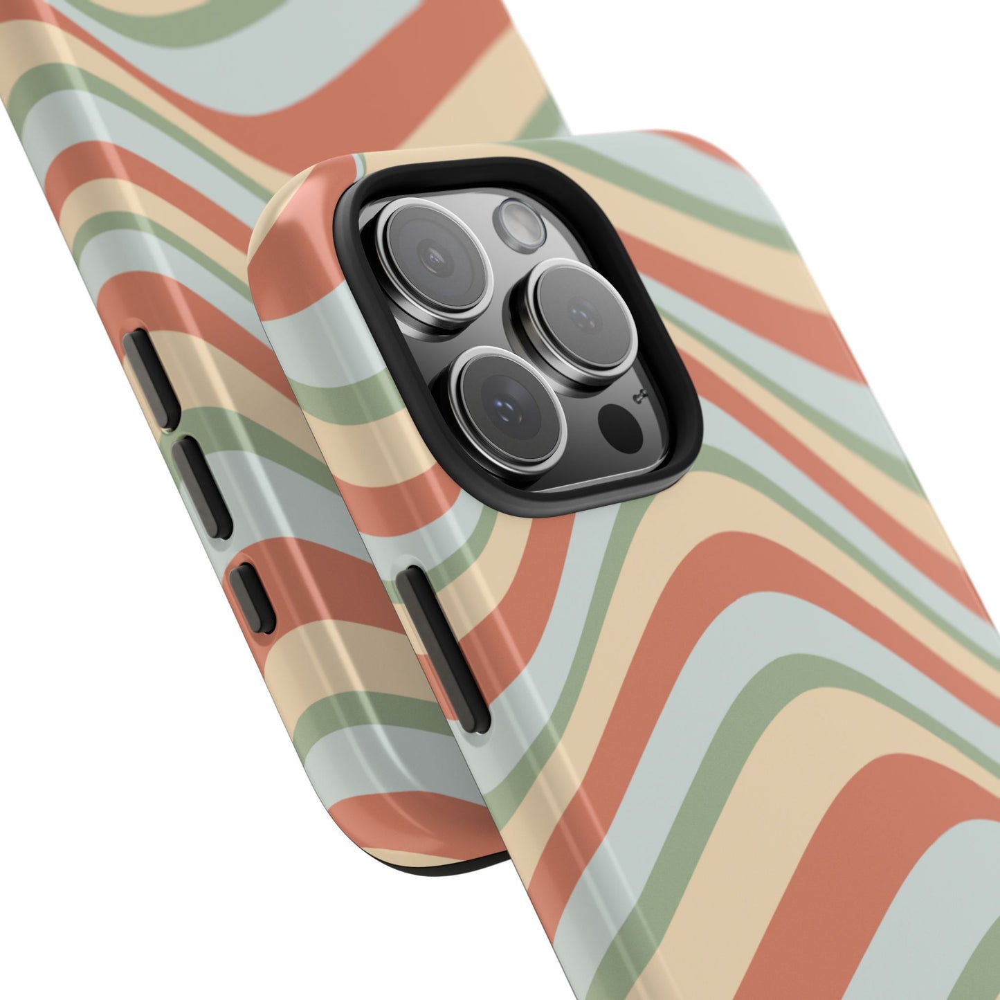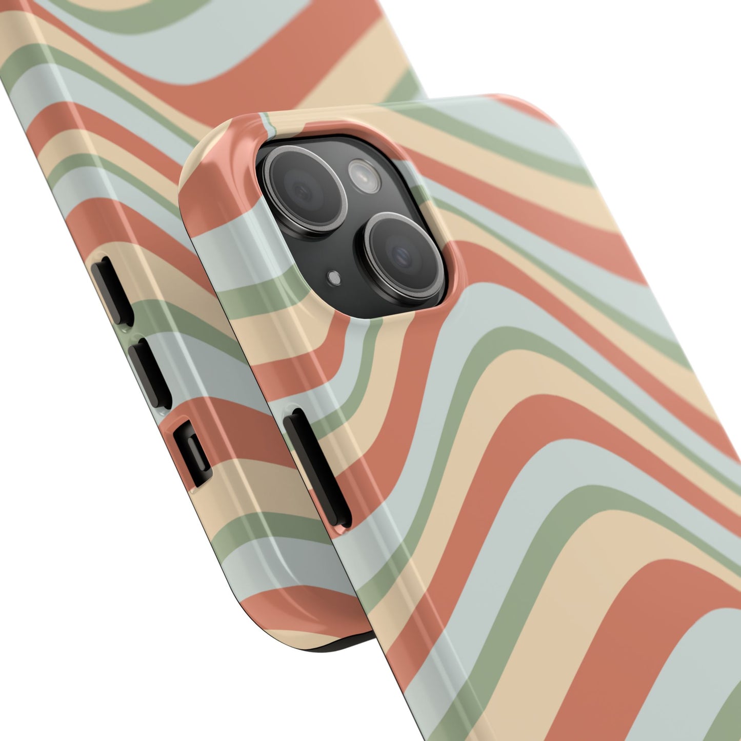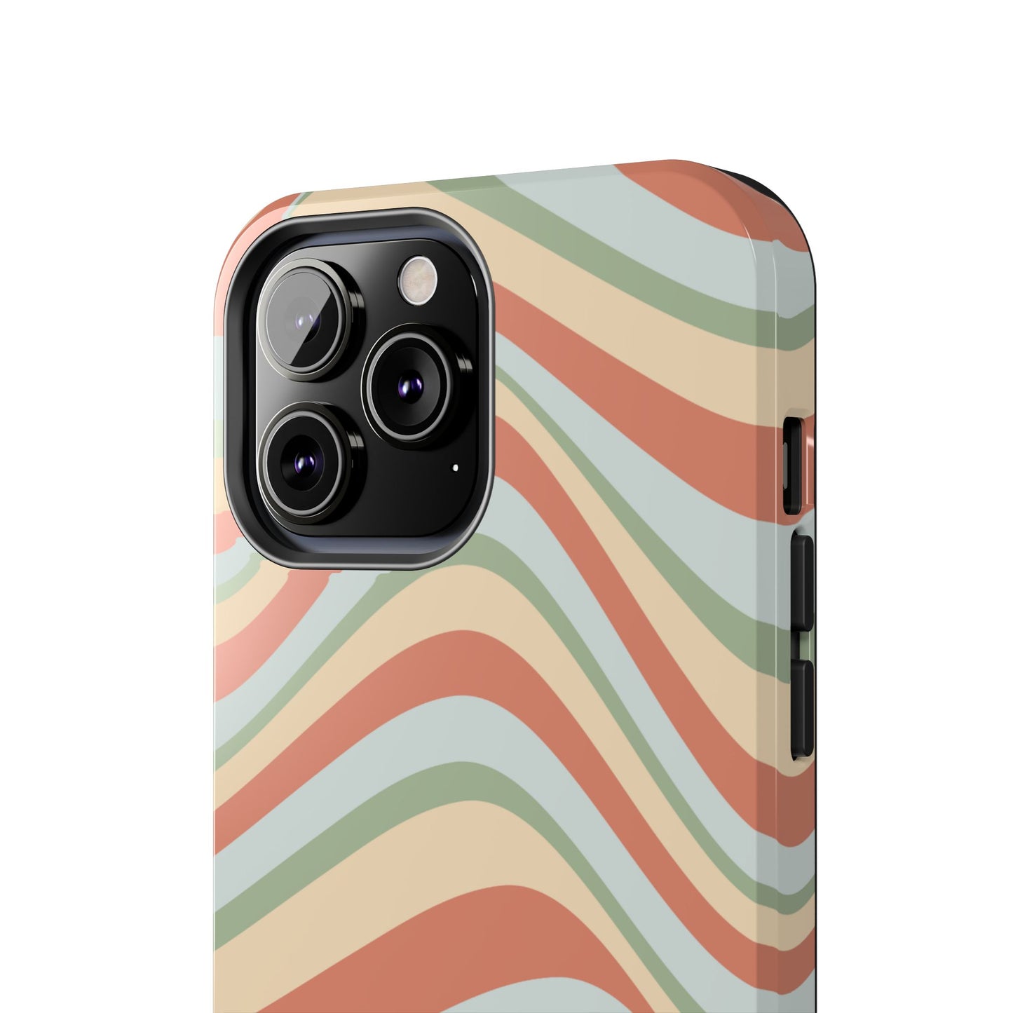 Embrace the retro vibe with our Vintage Earthy Waves iPhone Case, featuring a soothing, wavy stripe pattern in soft green, cream, and rust hues. This design brings a laid-back, earthy feel, reminiscent of the 70s, perfect for those who love a nostalgic yet modern aesthetic. The tough polycarbonate shell with a shock-absorbing inner layer ensures your phone is protected from everyday bumps and scratches, while its slim profile keeps your phone looking sleek. Ideal for adding a hint of vintage charm to your everyday accessories.