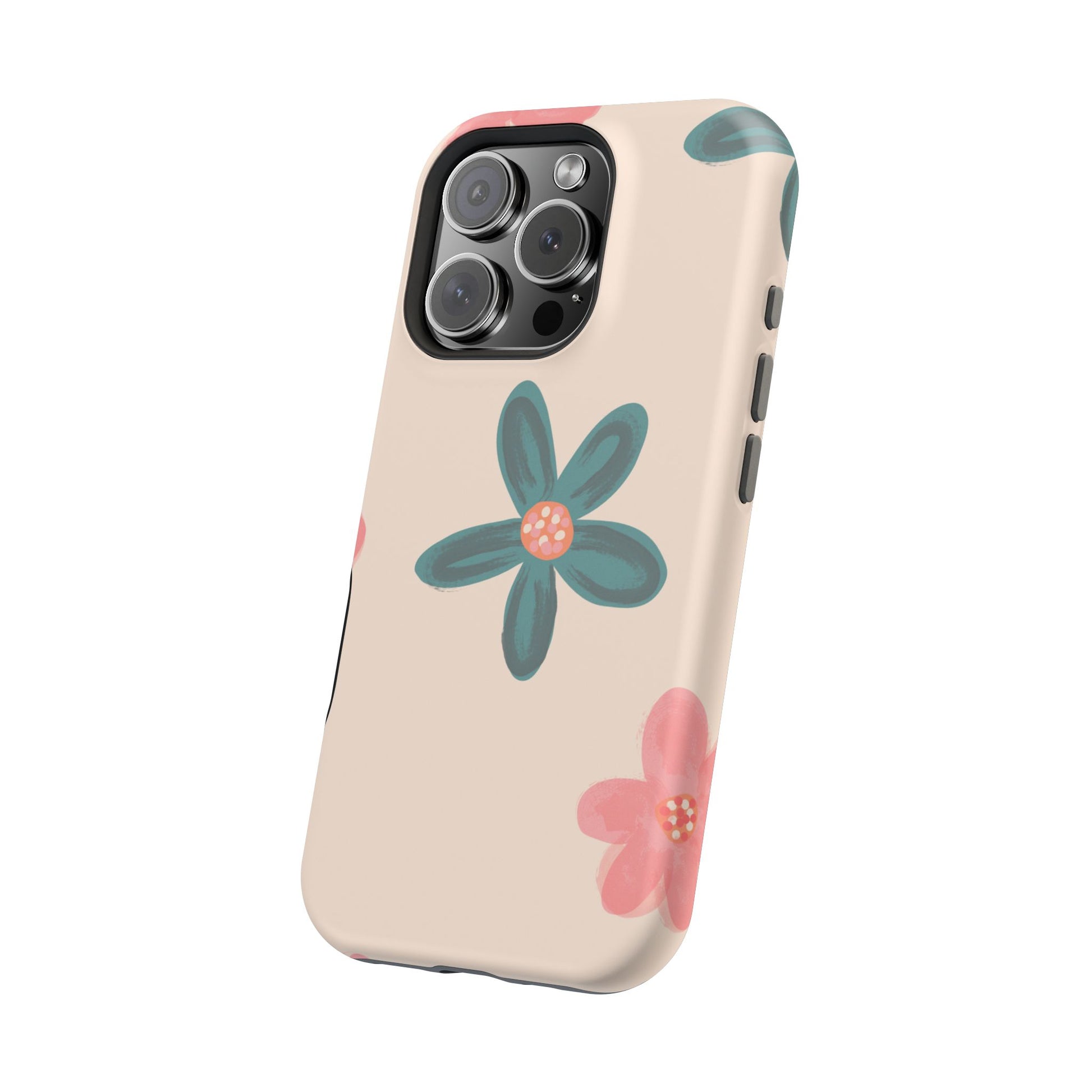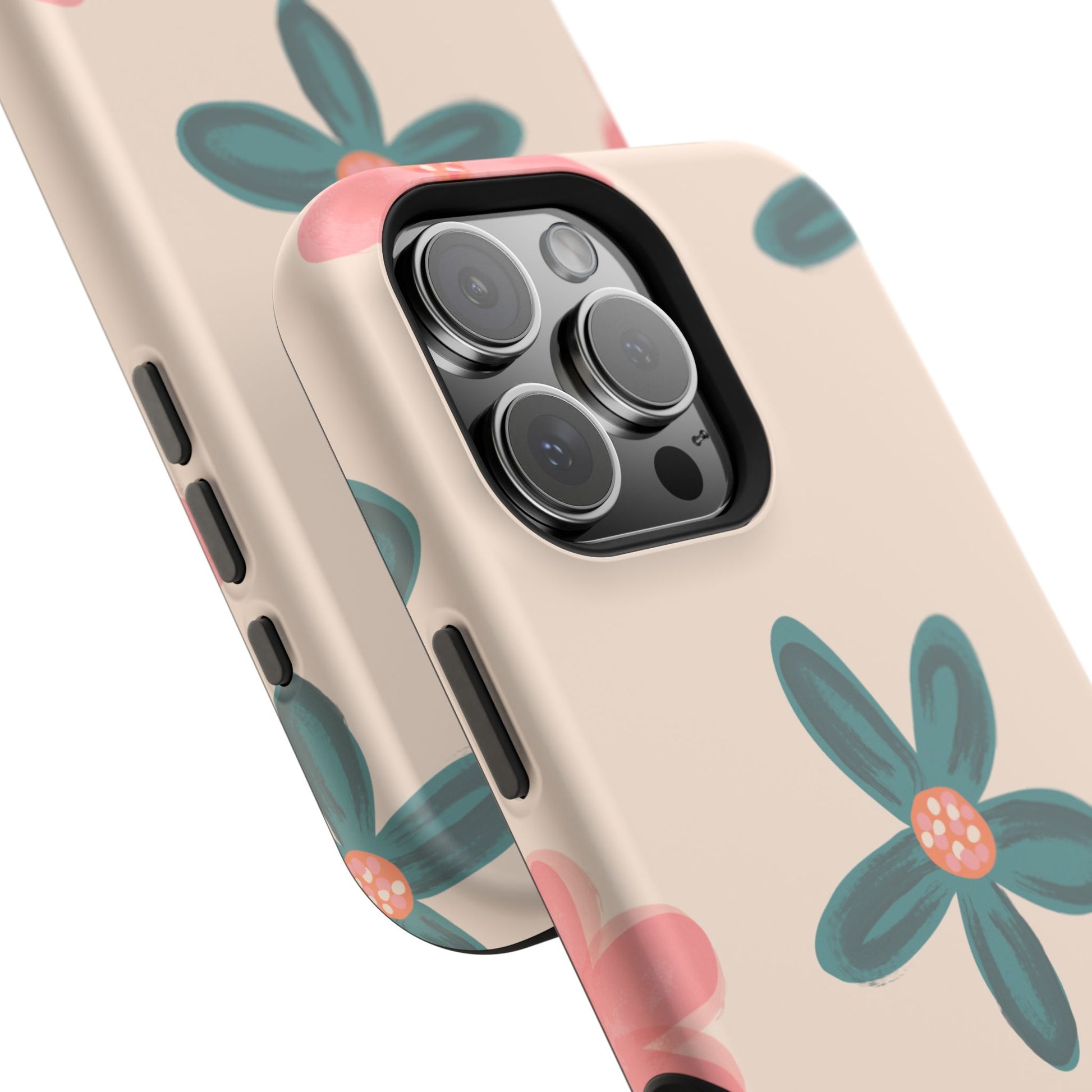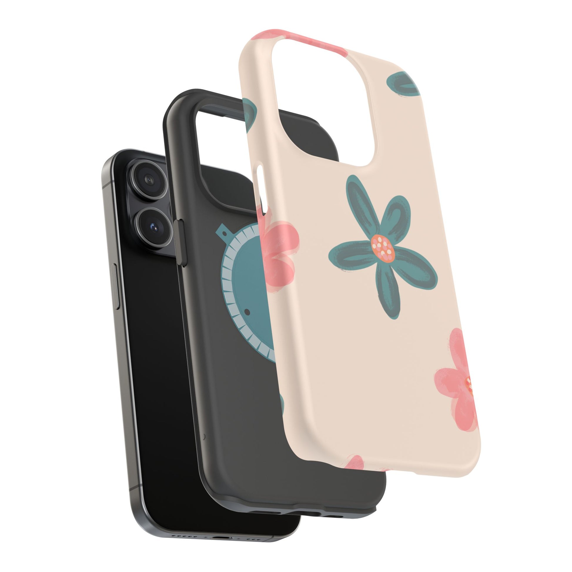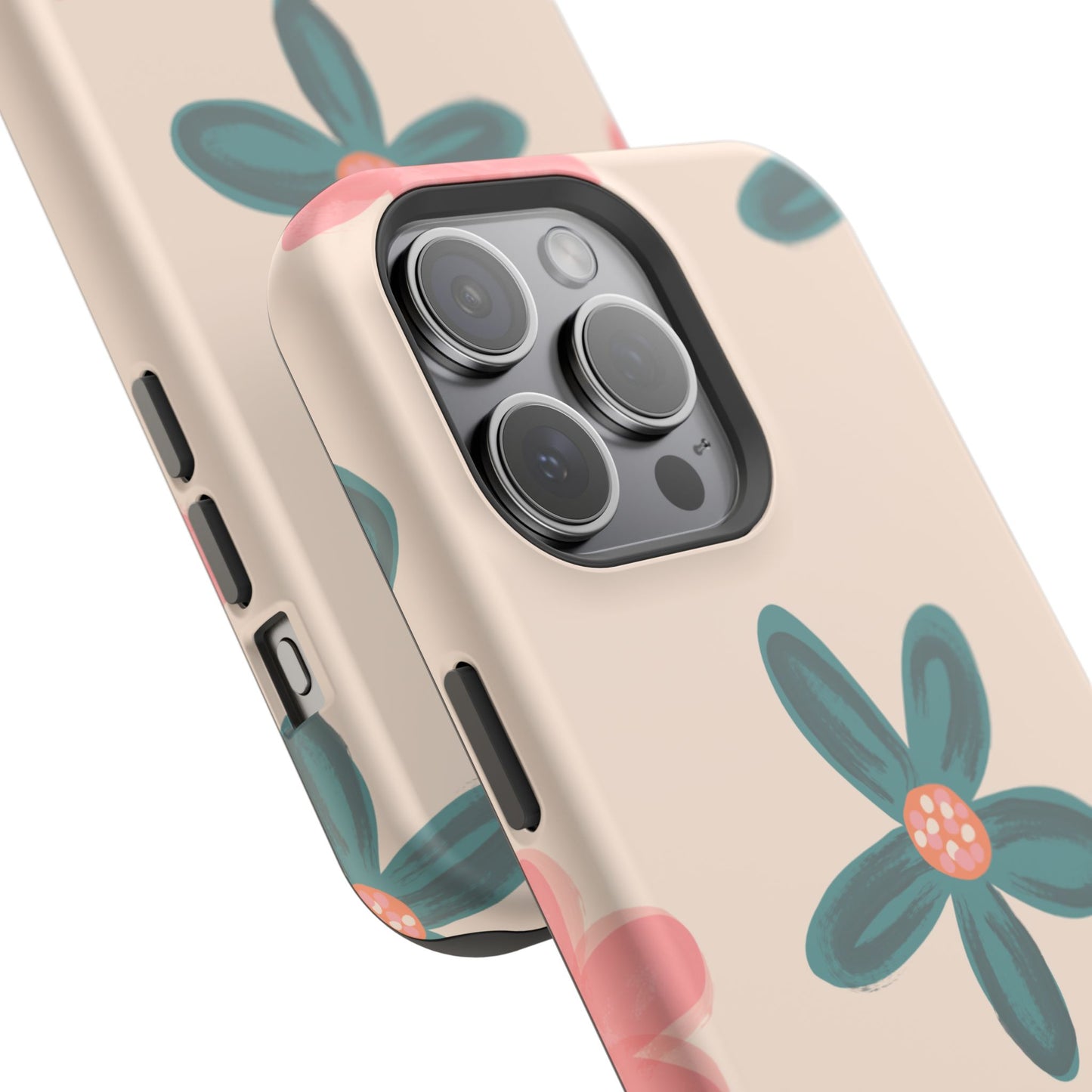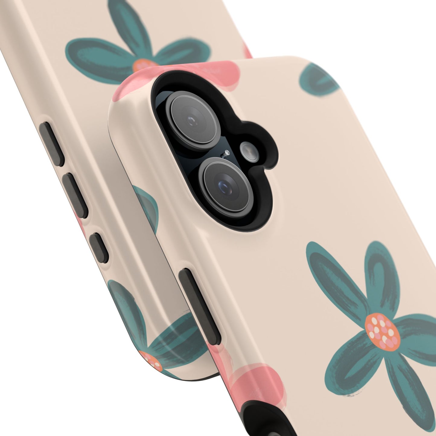 Elevate your phone’s style with our Vintage Floral Tough MagSafe  iPhone Case, featuring a charming hand-painted pattern of blush pink and deep teal flowers set against a creamy beige background. The blend of soft pastel hues and playful brushstroke texture creates a nostalgic, boho-inspired vibe, perfect for those who love a touch of vintage charm. Built for durability, this case combines a rugged polycarbonate outer shell with a shock-absorbing TPU liner to protect your phone from everyday bumps and drops. The smooth matte finish adds to its elegance while providing a secure, non-slip grip.