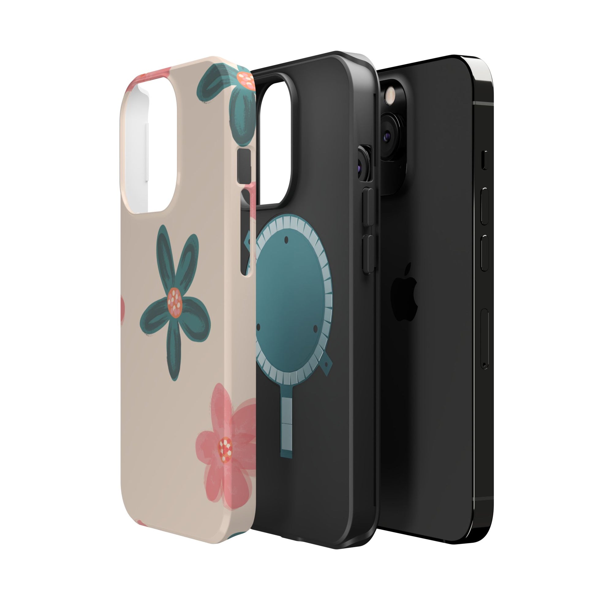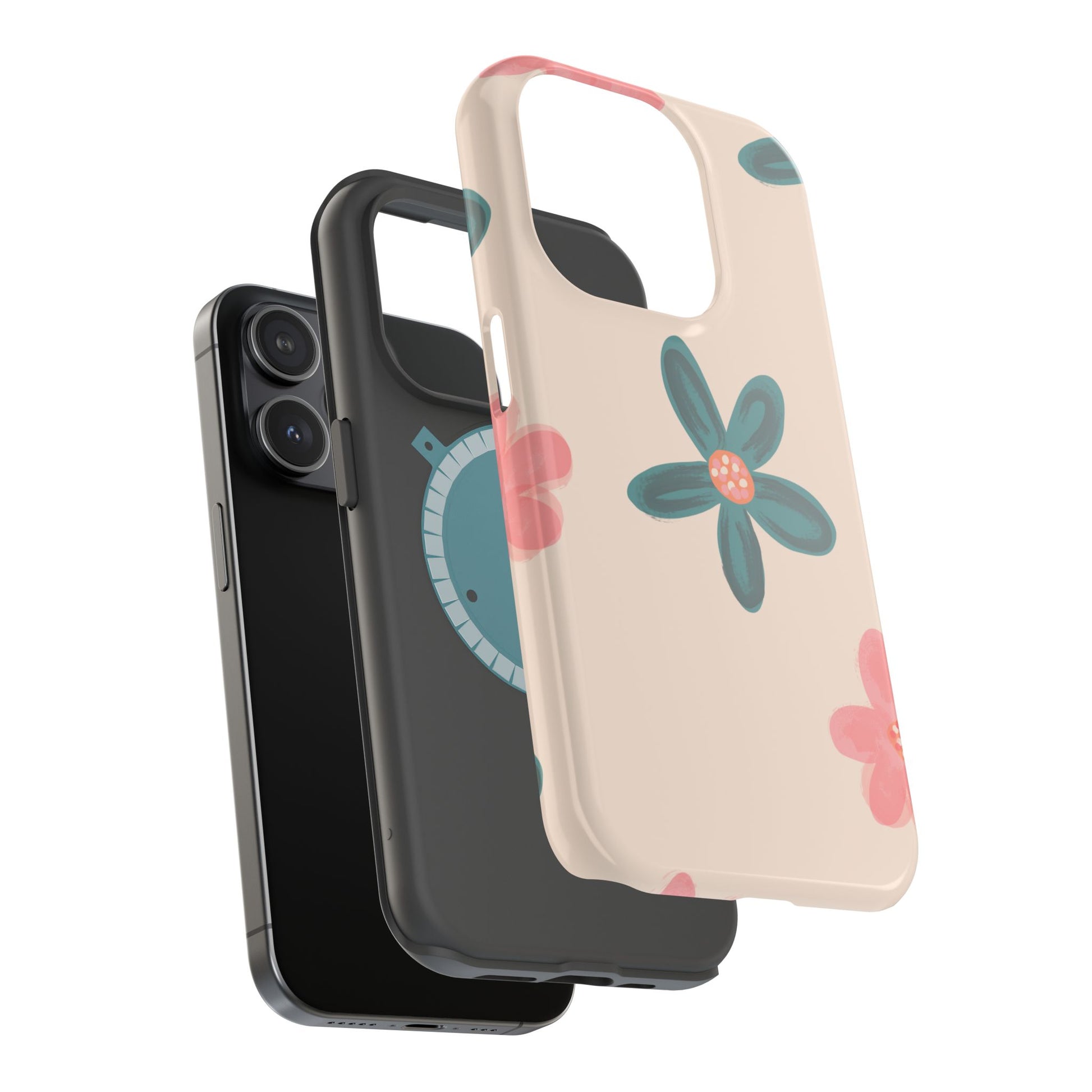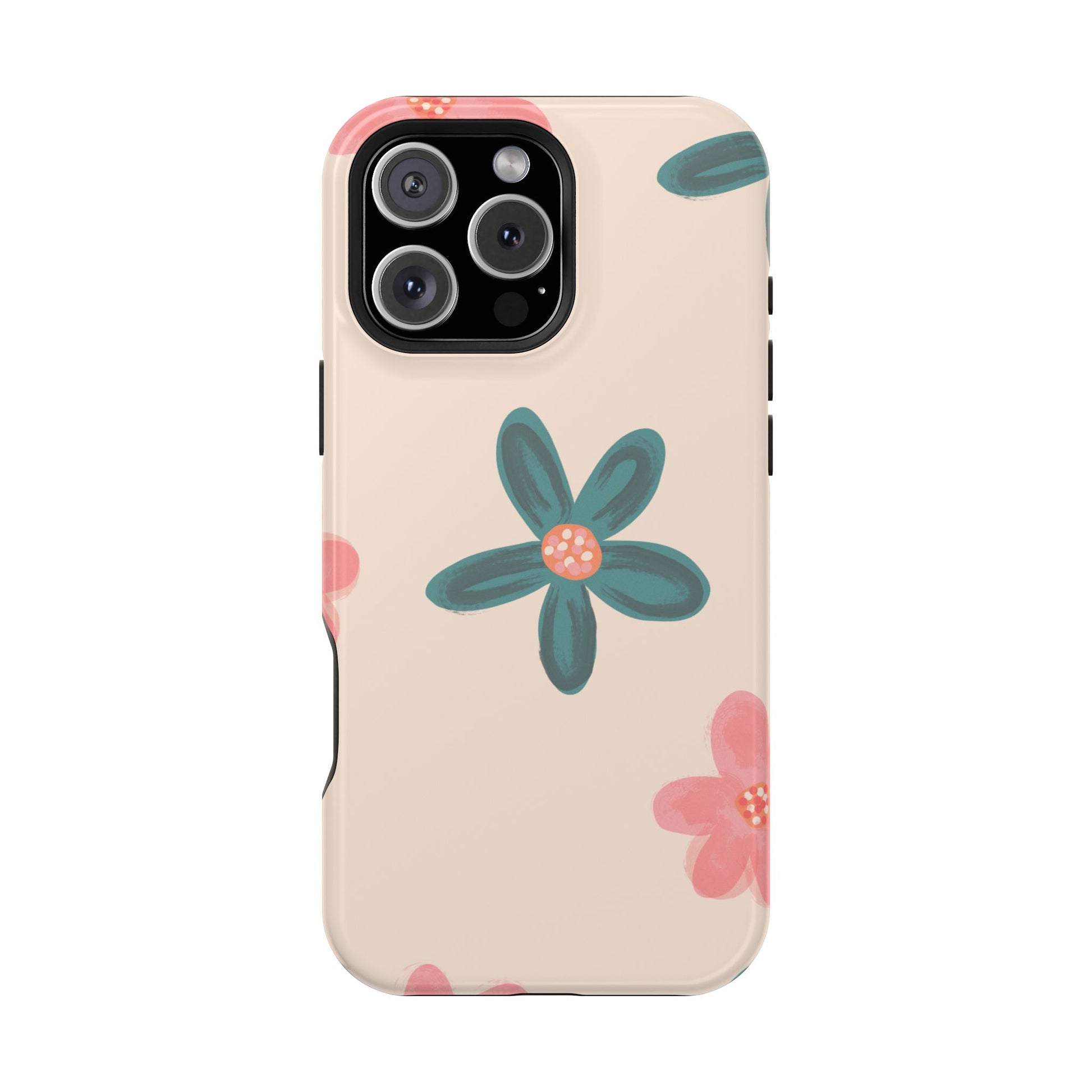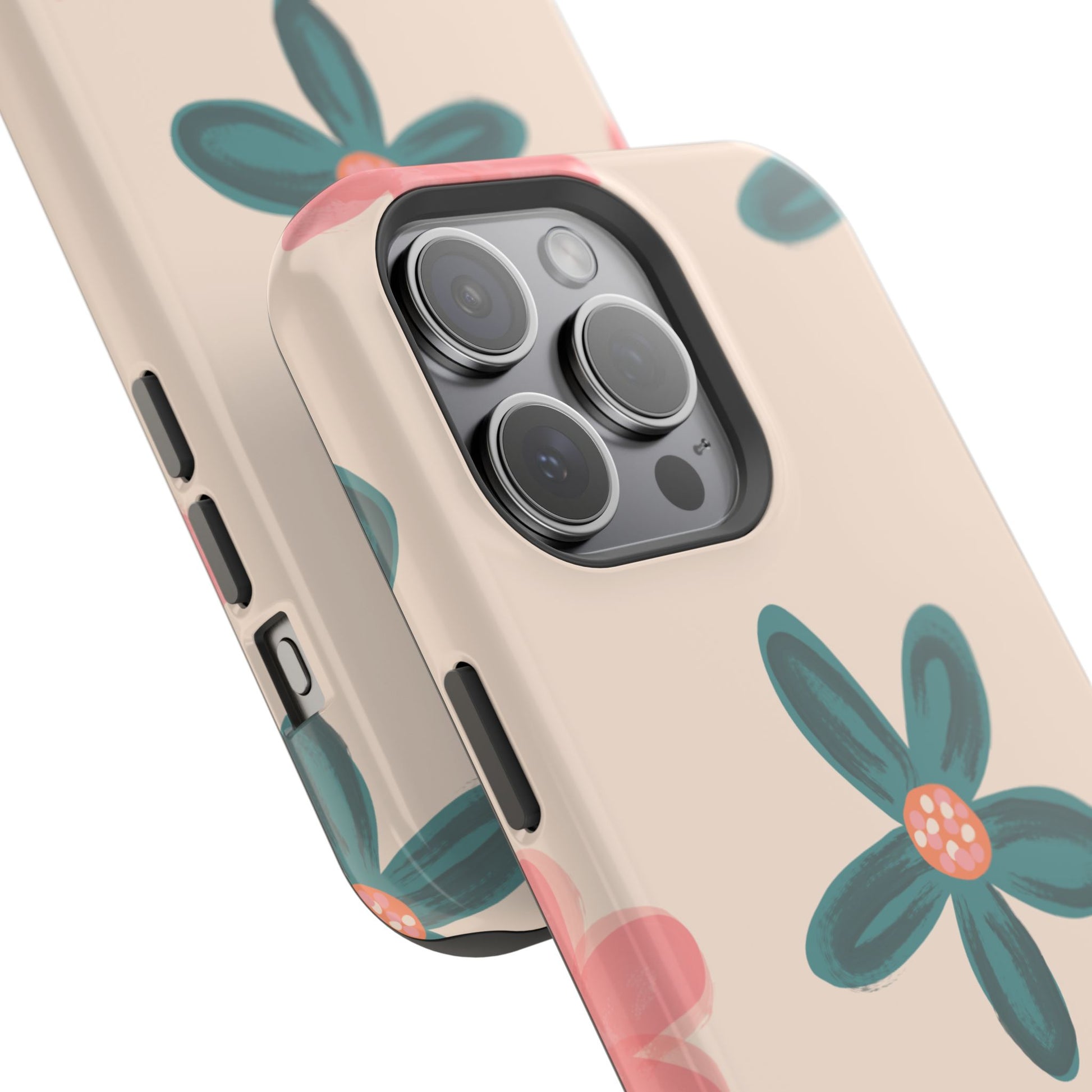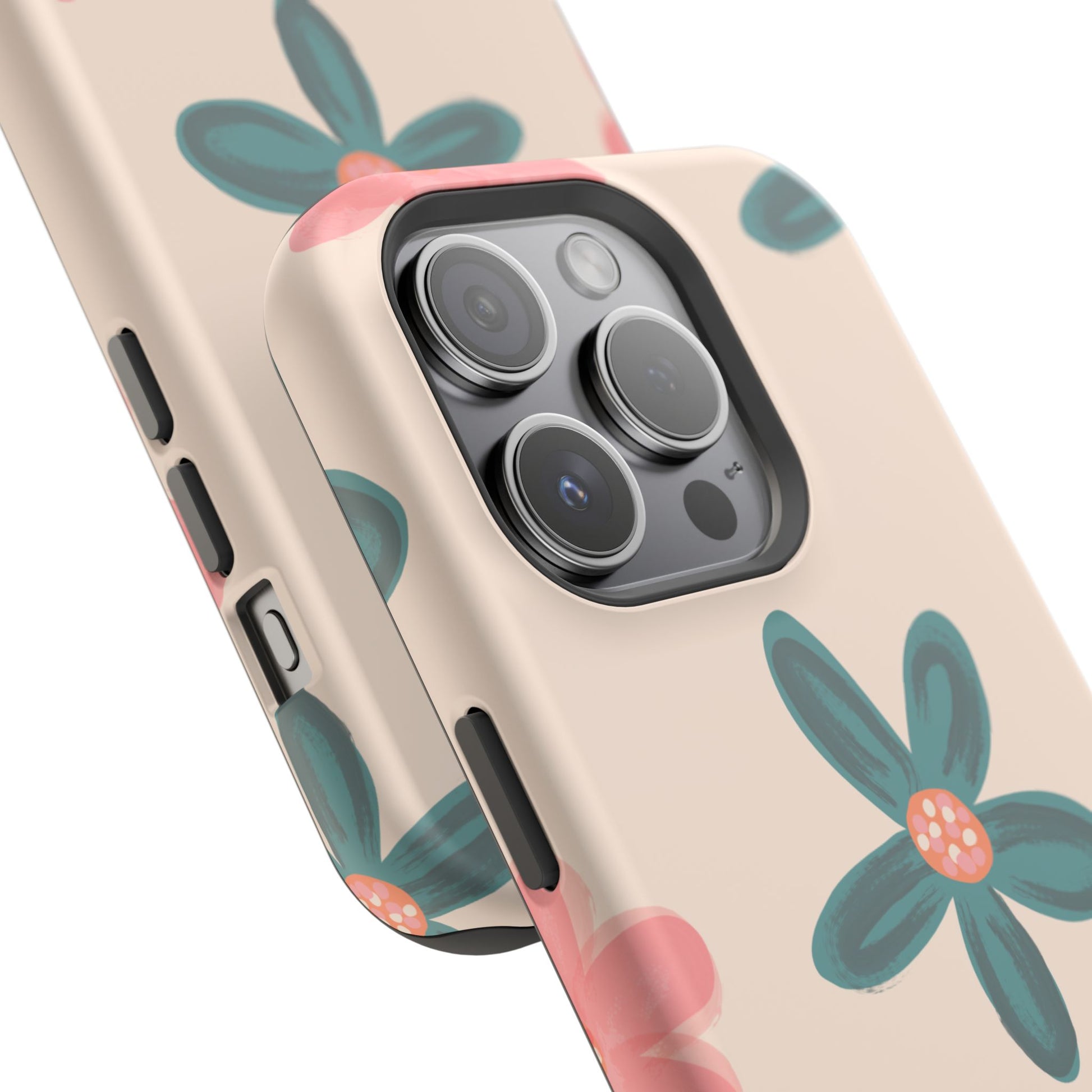 Elevate your phone’s style with our Vintage Floral Tough MagSafe  iPhone Case, featuring a charming hand-painted pattern of blush pink and deep teal flowers set against a creamy beige background. The blend of soft pastel hues and playful brushstroke texture creates a nostalgic, boho-inspired vibe, perfect for those who love a touch of vintage charm. Built for durability, this case combines a rugged polycarbonate outer shell with a shock-absorbing TPU liner to protect your phone from everyday bumps and drops. The smooth matte finish adds to its elegance while providing a secure, non-slip grip.