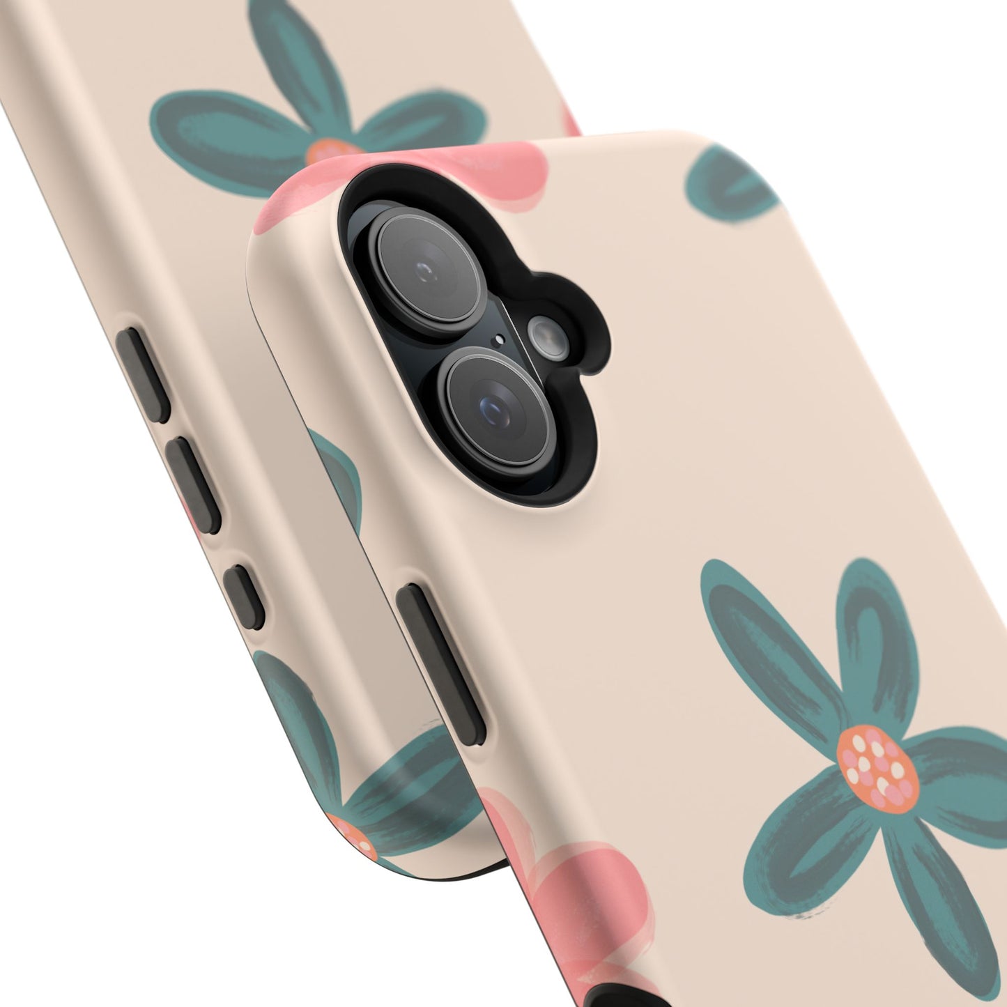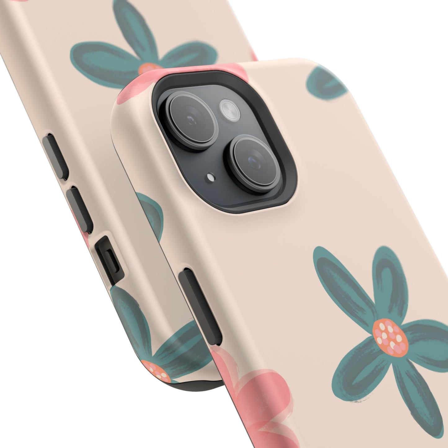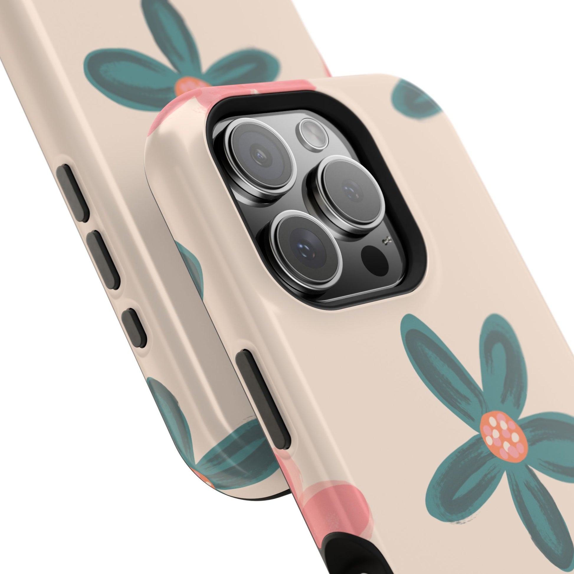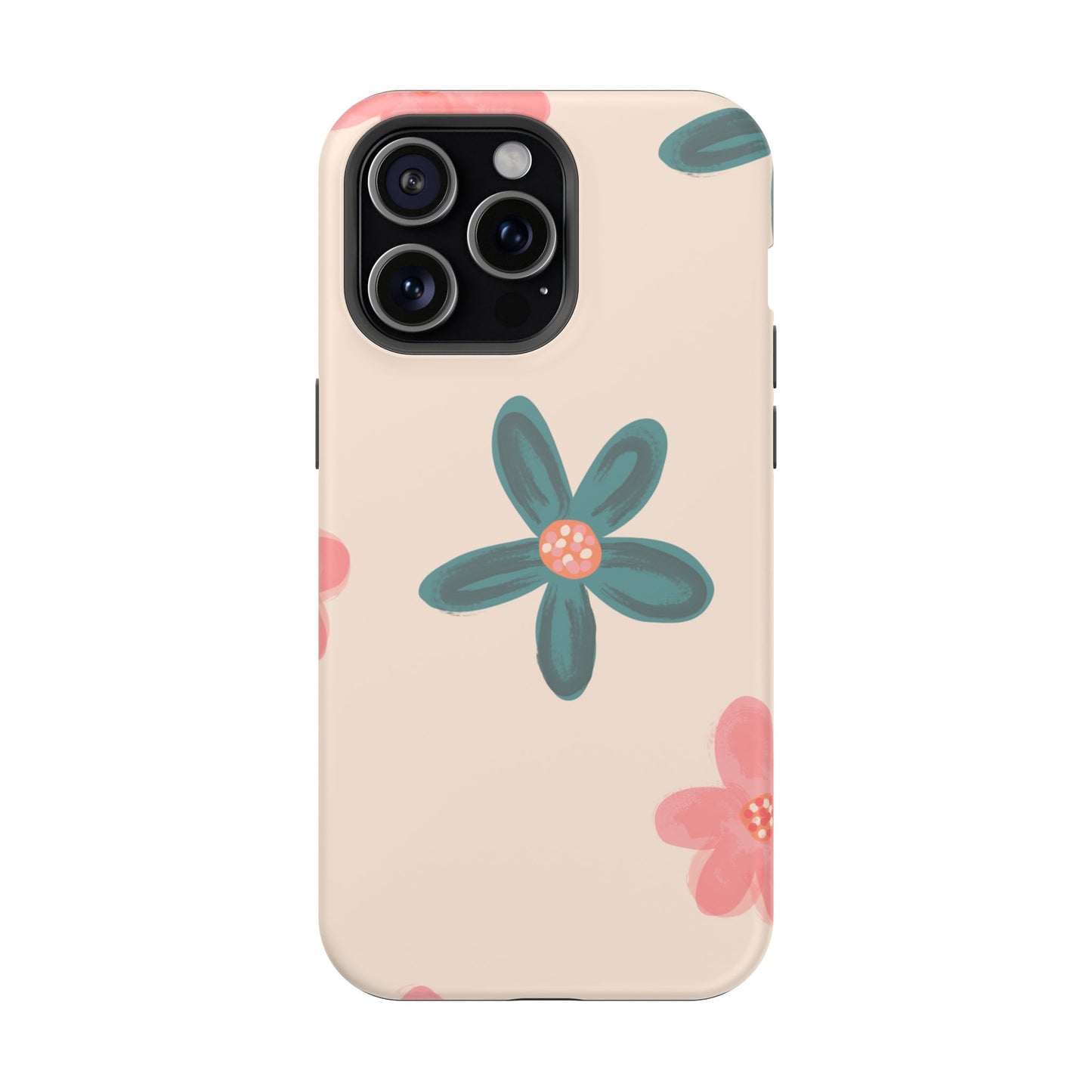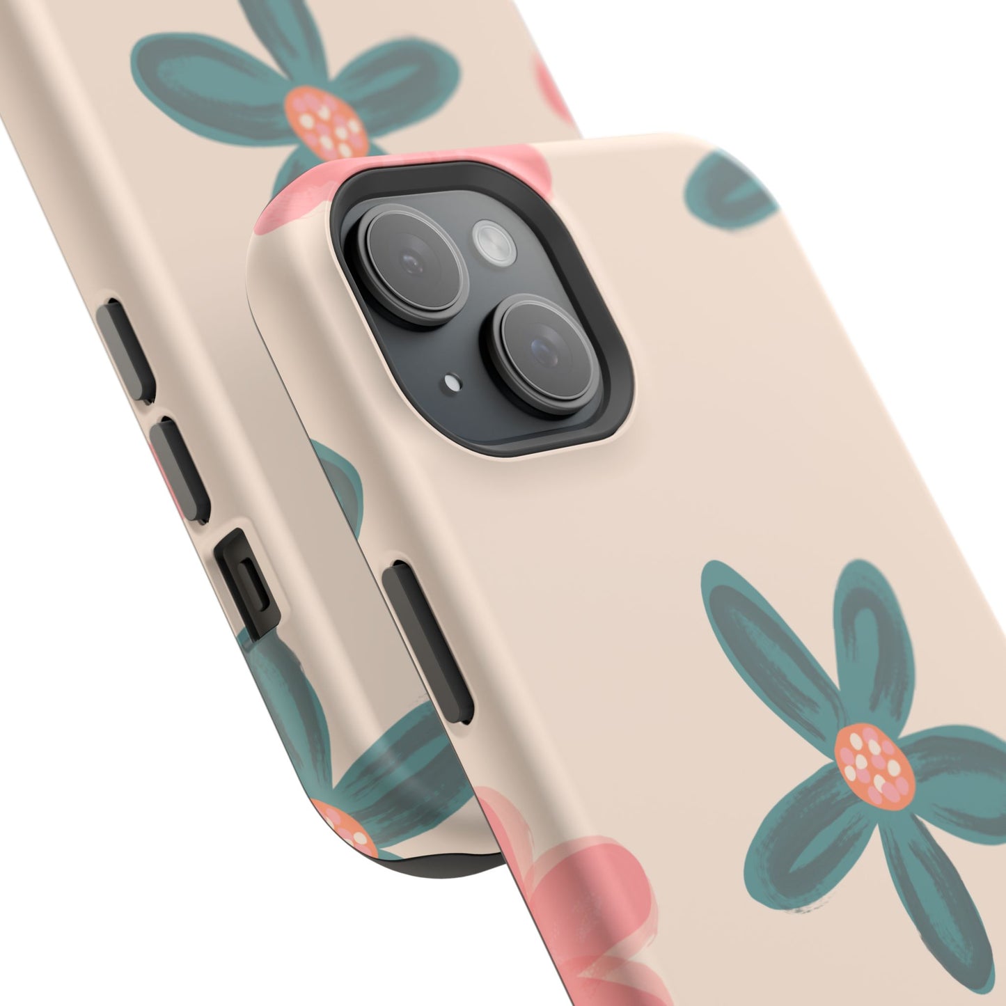 Elevate your phone’s style with our Vintage Floral Tough MagSafe  iPhone Case, featuring a charming hand-painted pattern of blush pink and deep teal flowers set against a creamy beige background. The blend of soft pastel hues and playful brushstroke texture creates a nostalgic, boho-inspired vibe, perfect for those who love a touch of vintage charm. Built for durability, this case combines a rugged polycarbonate outer shell with a shock-absorbing TPU liner to protect your phone from everyday bumps and drops. The smooth matte finish adds to its elegance while providing a secure, non-slip grip.