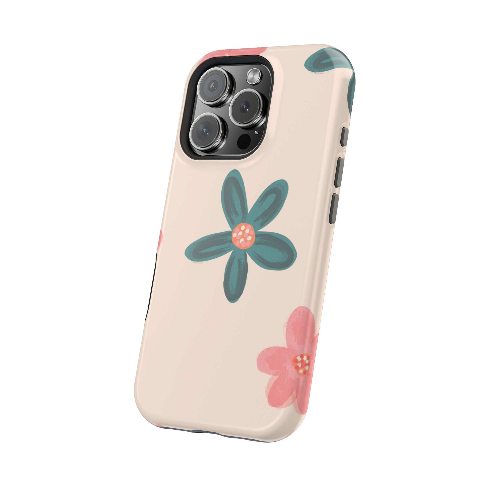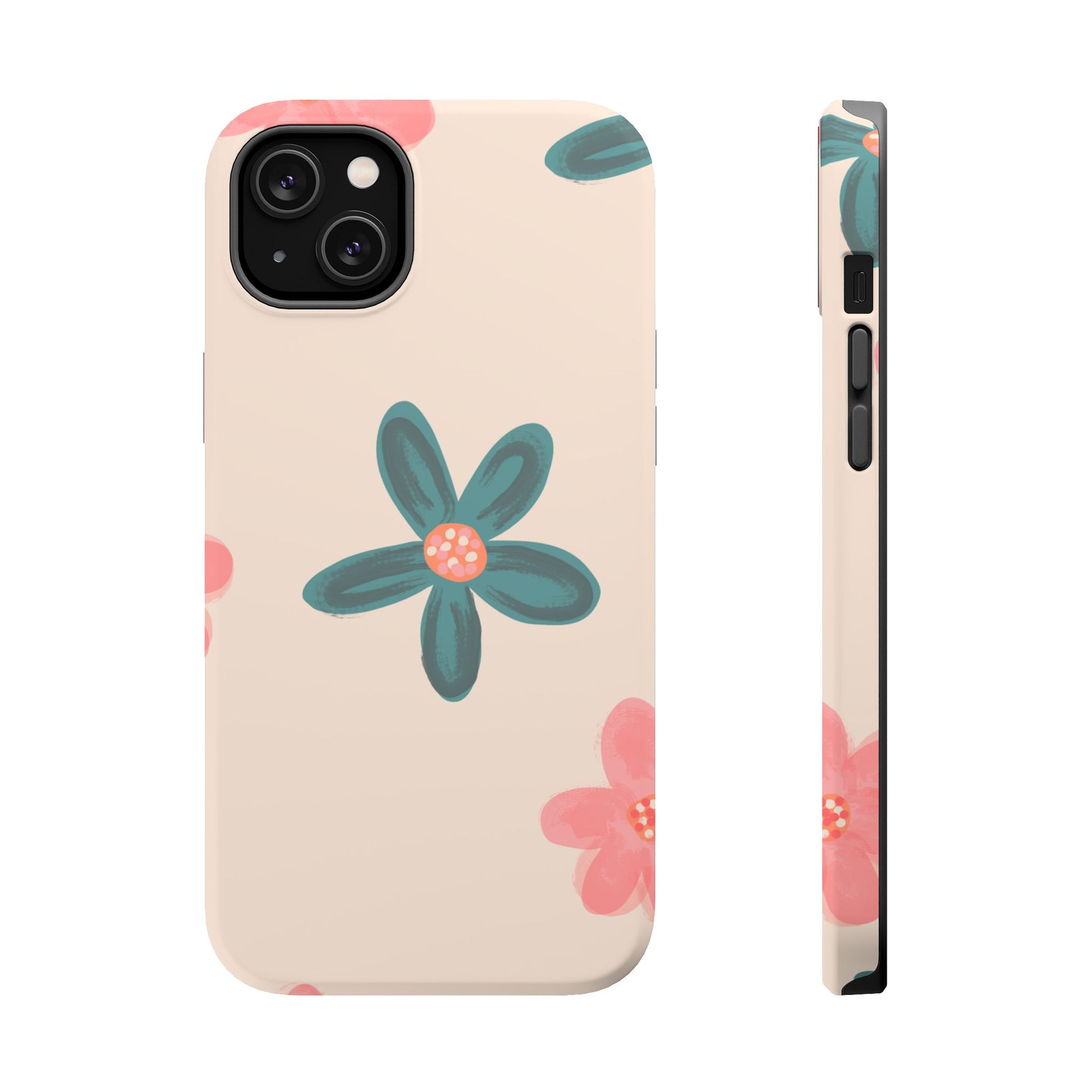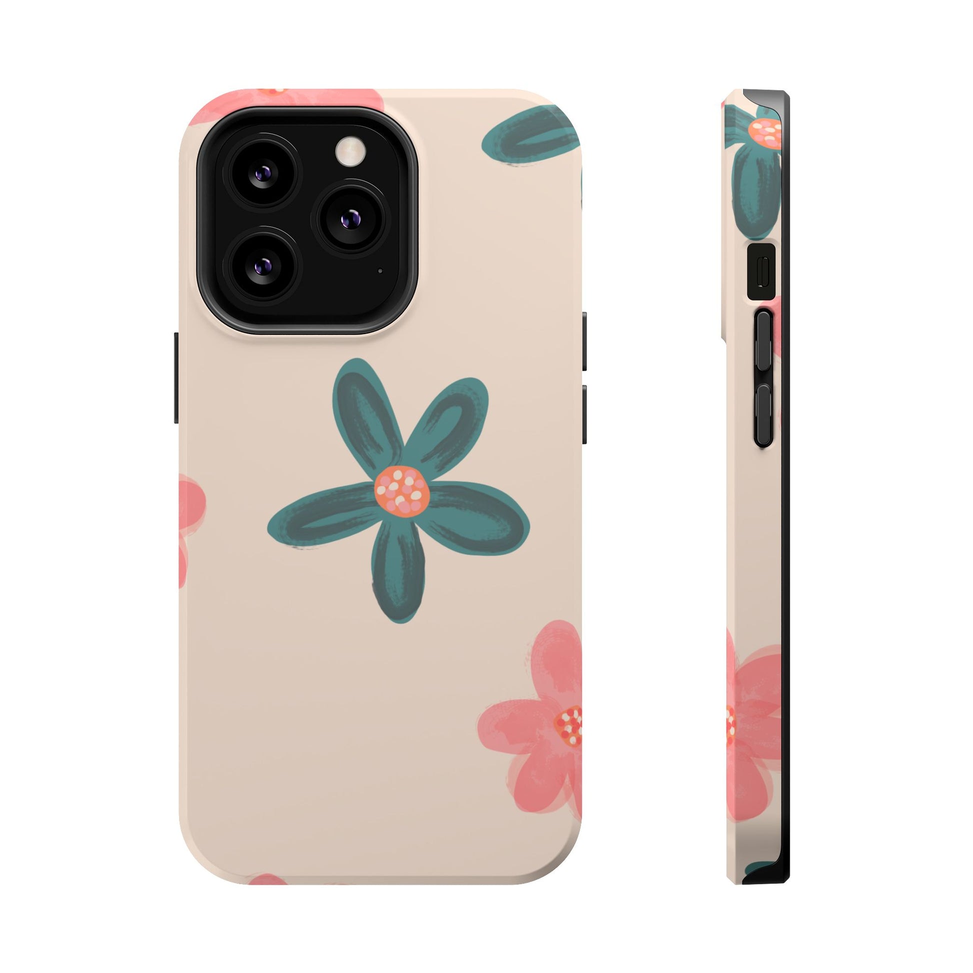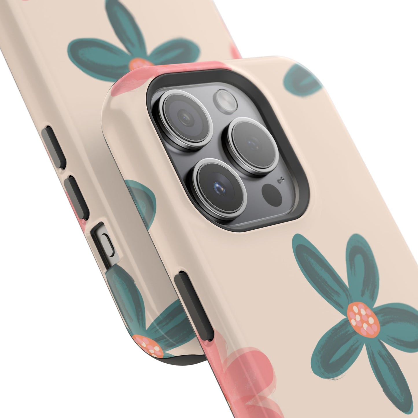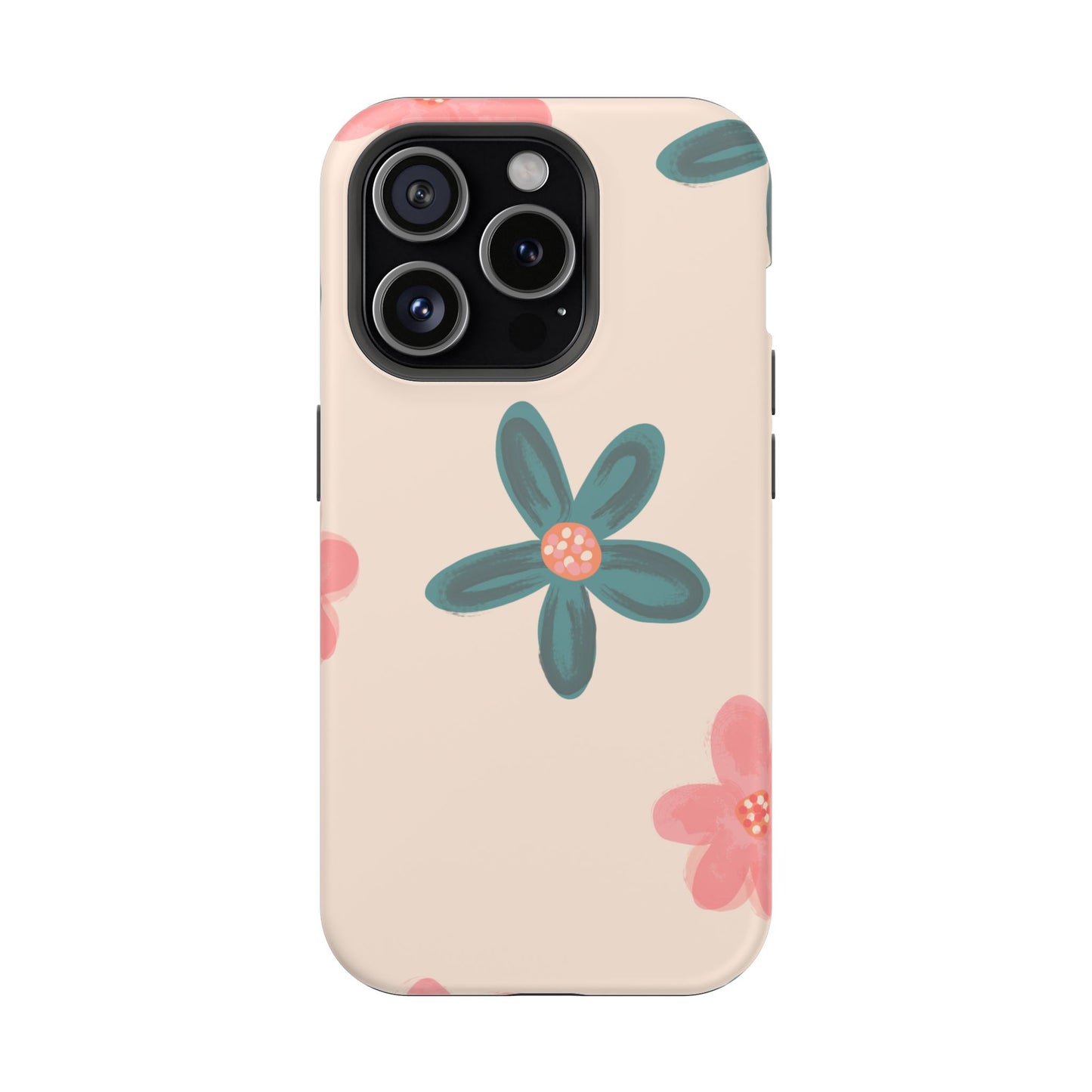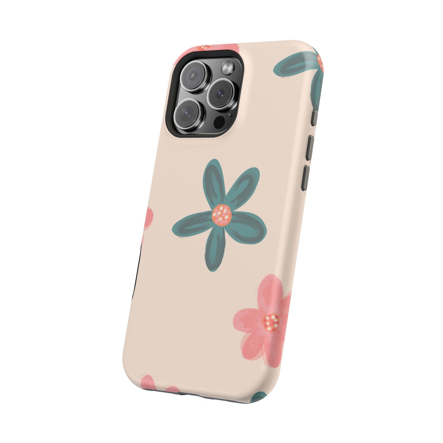 Elevate your phone’s style with our Vintage Floral Tough MagSafe  iPhone Case, featuring a charming hand-painted pattern of blush pink and deep teal flowers set against a creamy beige background. The blend of soft pastel hues and playful brushstroke texture creates a nostalgic, boho-inspired vibe, perfect for those who love a touch of vintage charm. Built for durability, this case combines a rugged polycarbonate outer shell with a shock-absorbing TPU liner to protect your phone from everyday bumps and drops. The smooth matte finish adds to its elegance while providing a secure, non-slip grip.