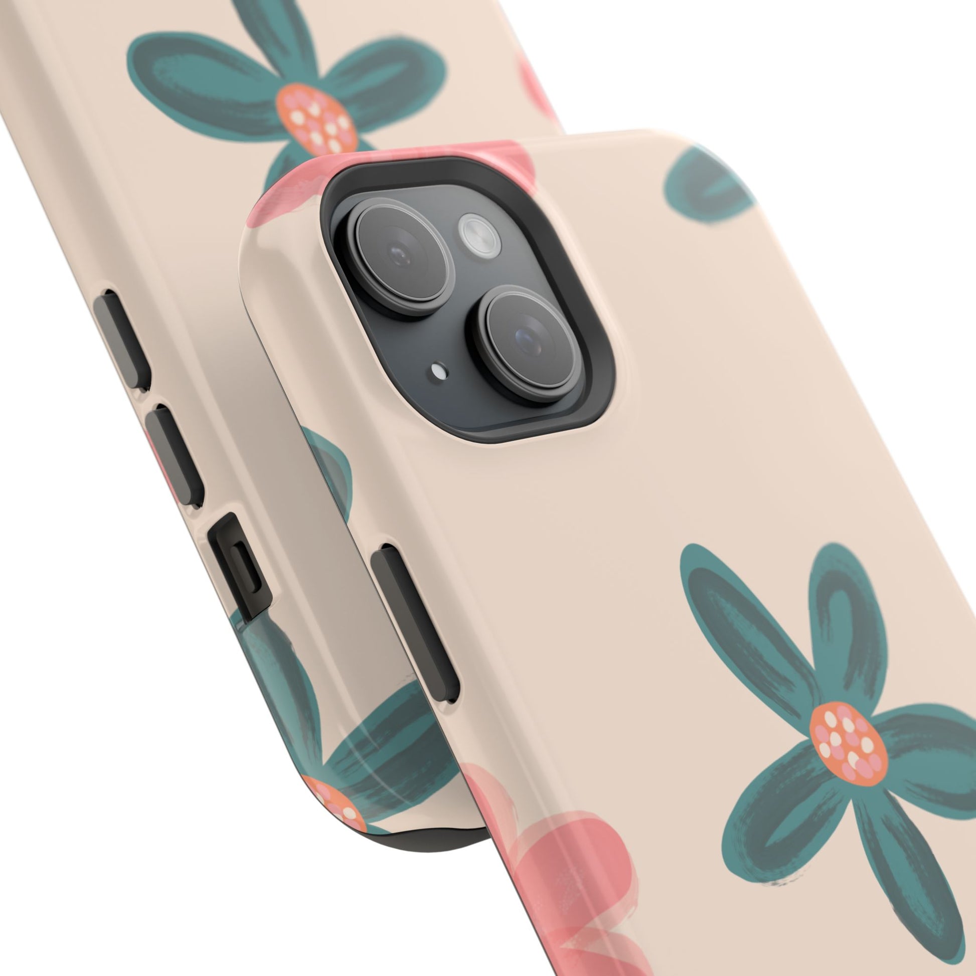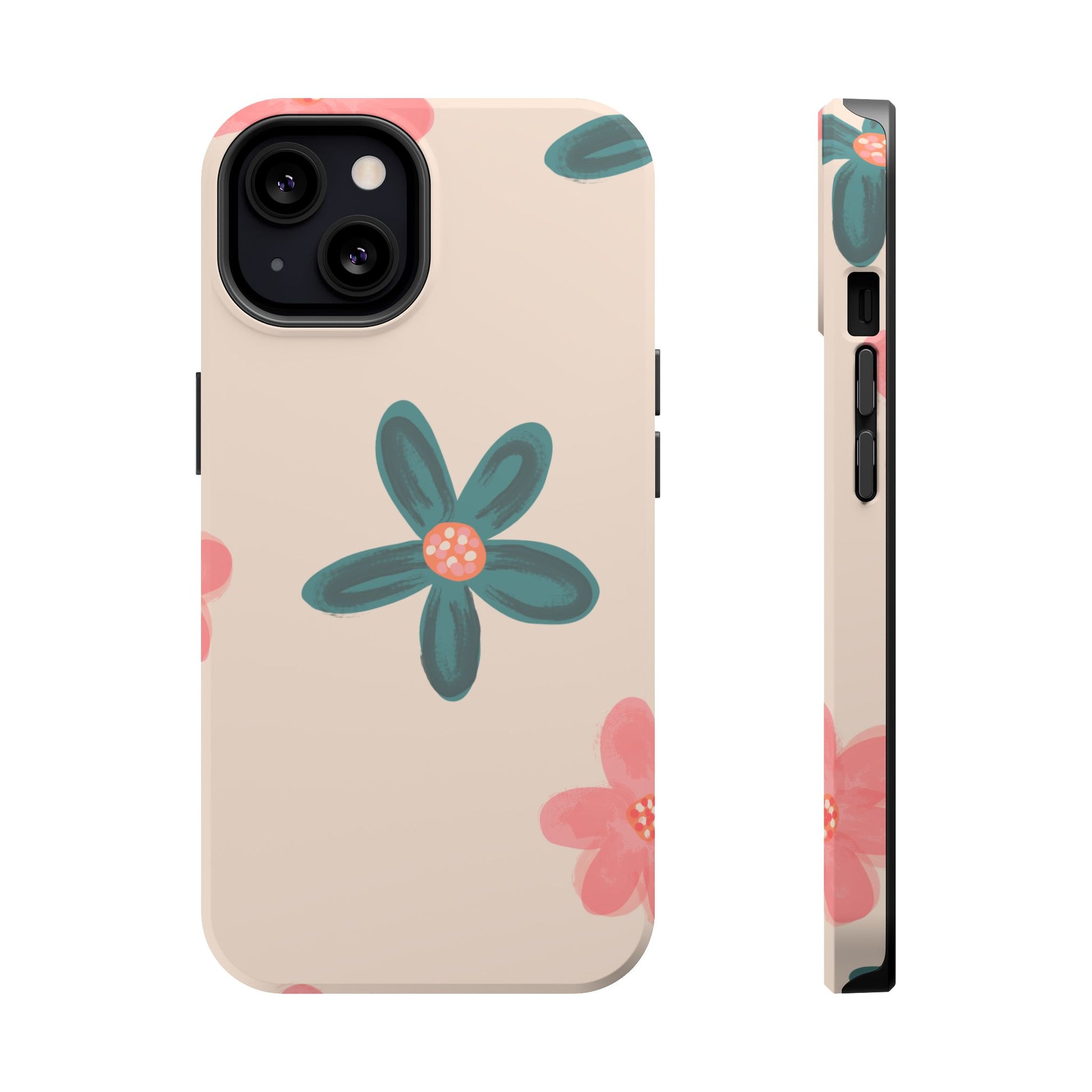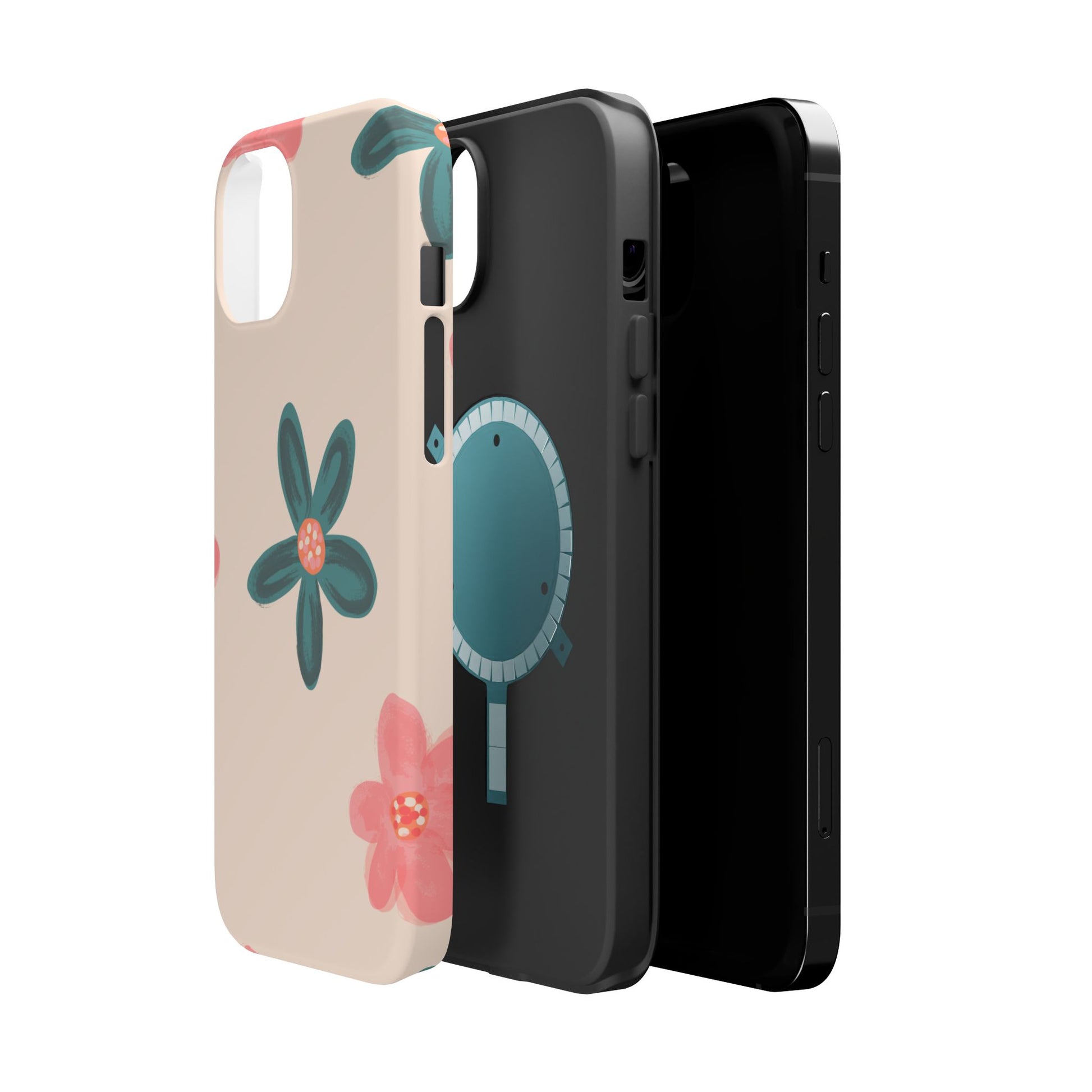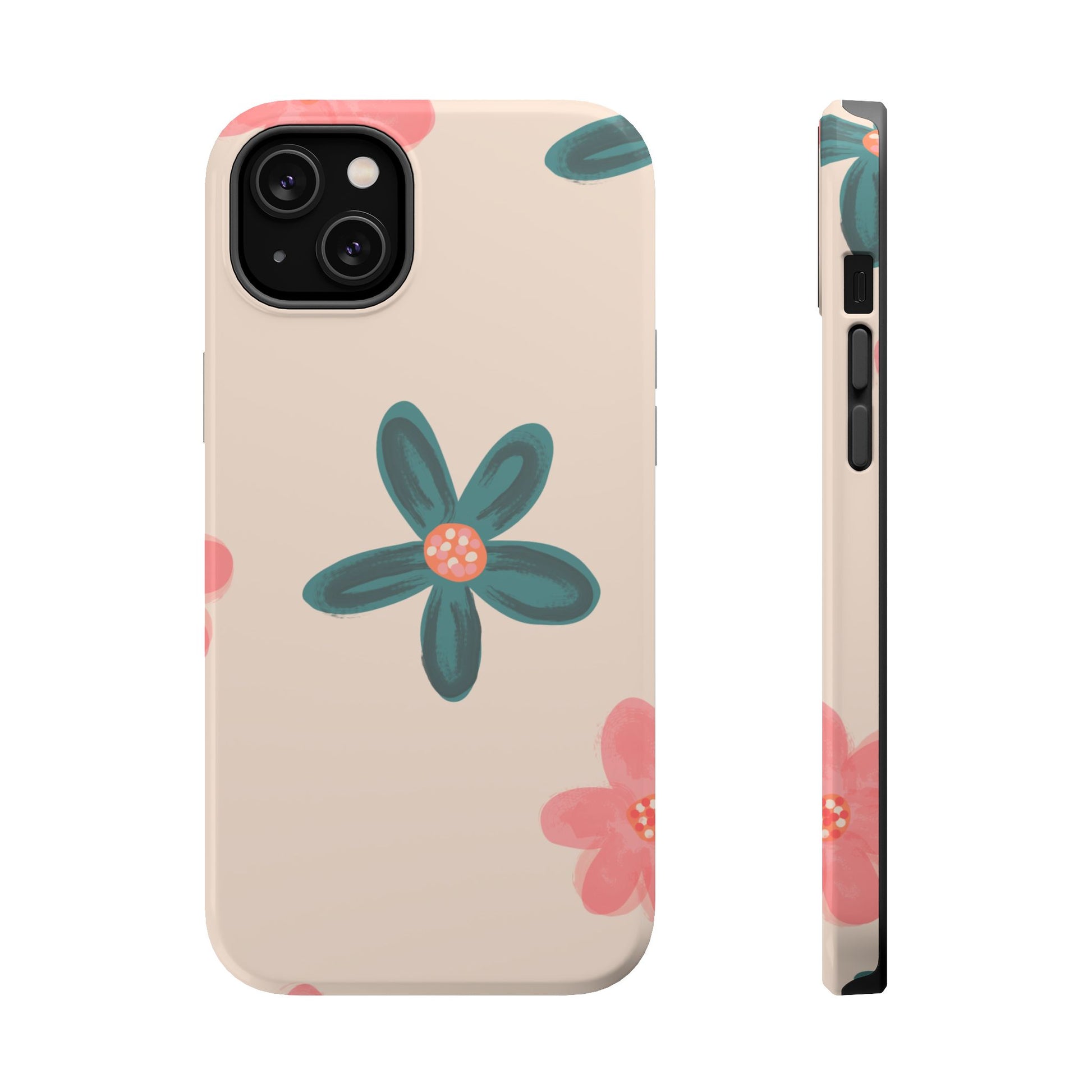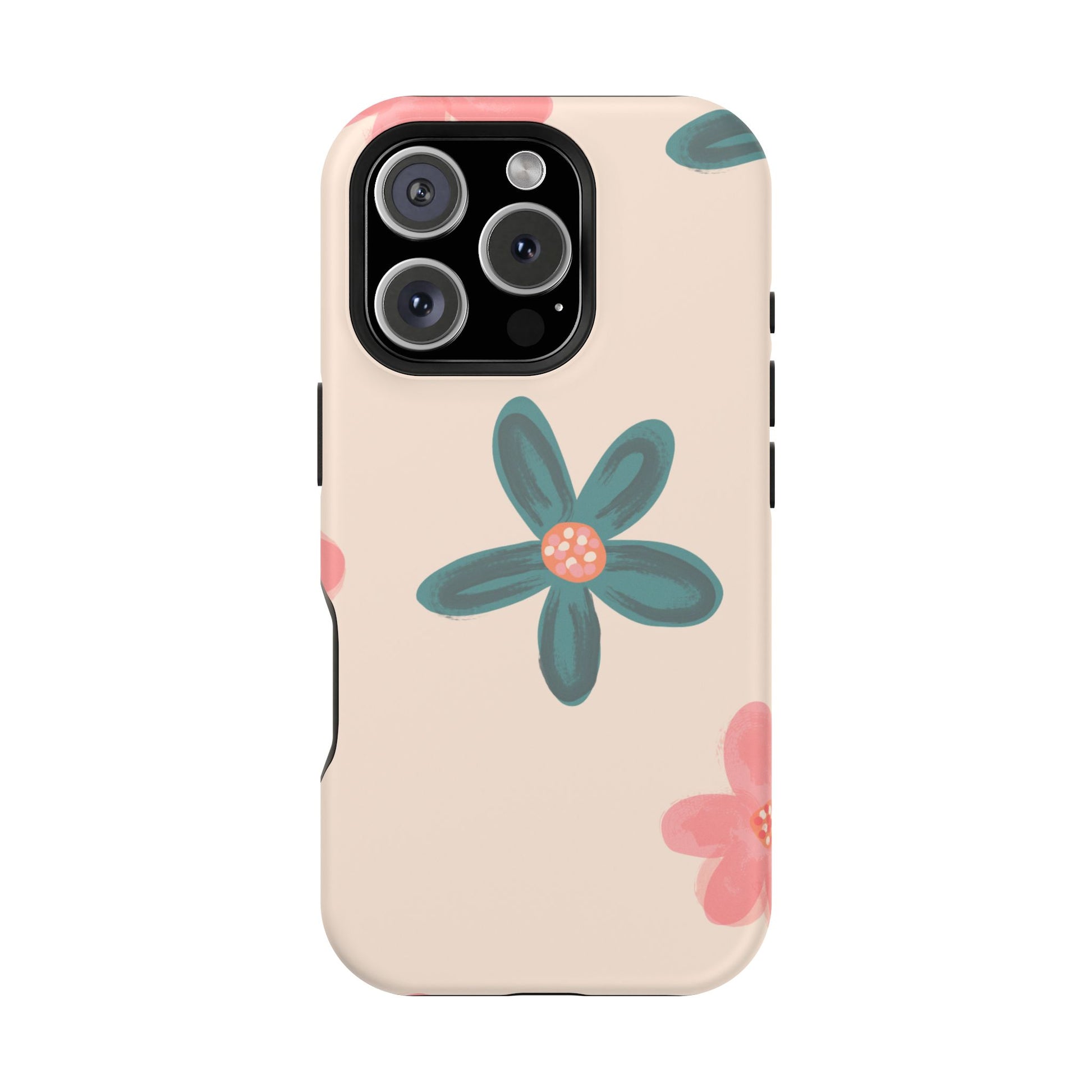 Elevate your phone’s style with our Vintage Floral Tough MagSafe  iPhone Case, featuring a charming hand-painted pattern of blush pink and deep teal flowers set against a creamy beige background. The blend of soft pastel hues and playful brushstroke texture creates a nostalgic, boho-inspired vibe, perfect for those who love a touch of vintage charm. Built for durability, this case combines a rugged polycarbonate outer shell with a shock-absorbing TPU liner to protect your phone from everyday bumps and drops. The smooth matte finish adds to its elegance while providing a secure, non-slip grip.