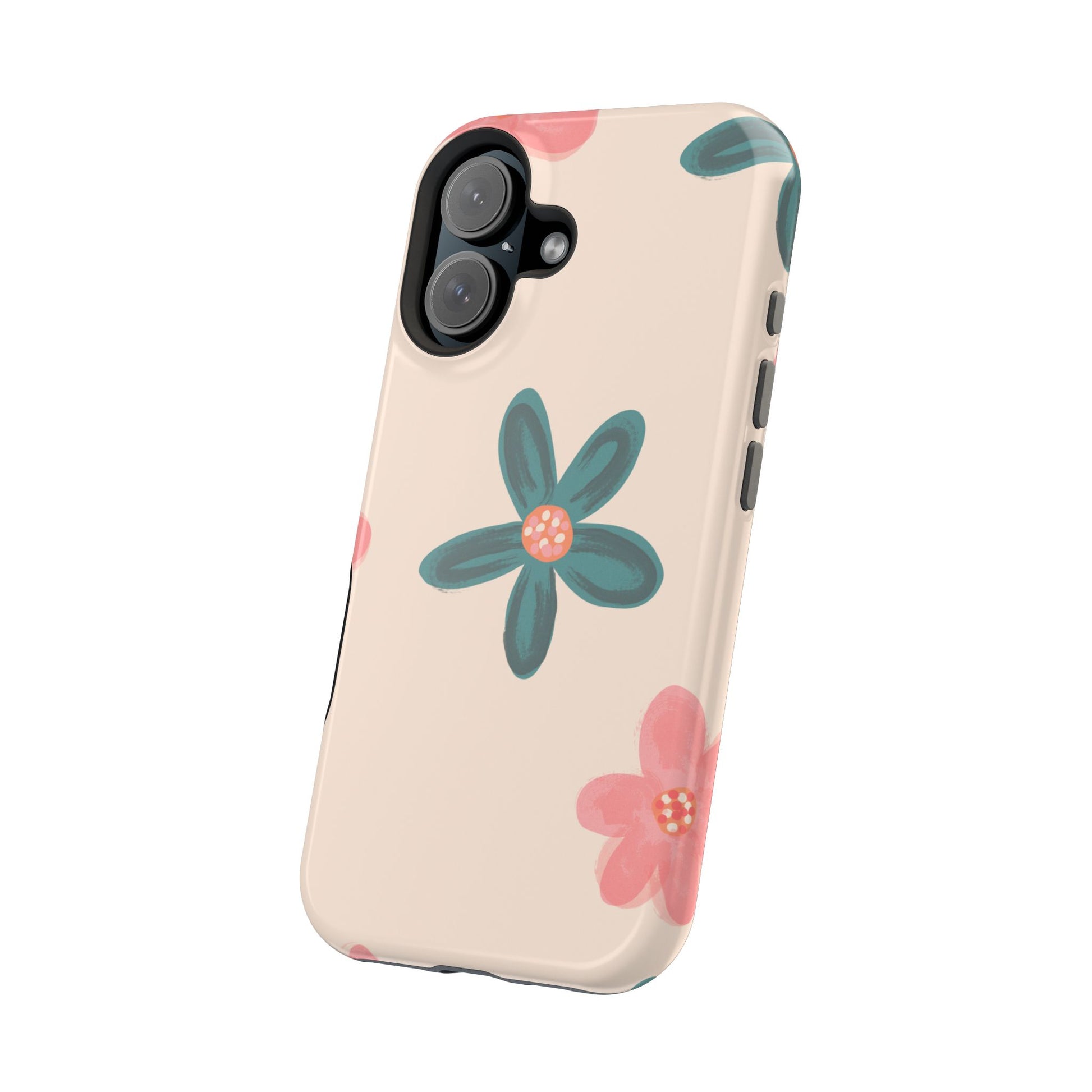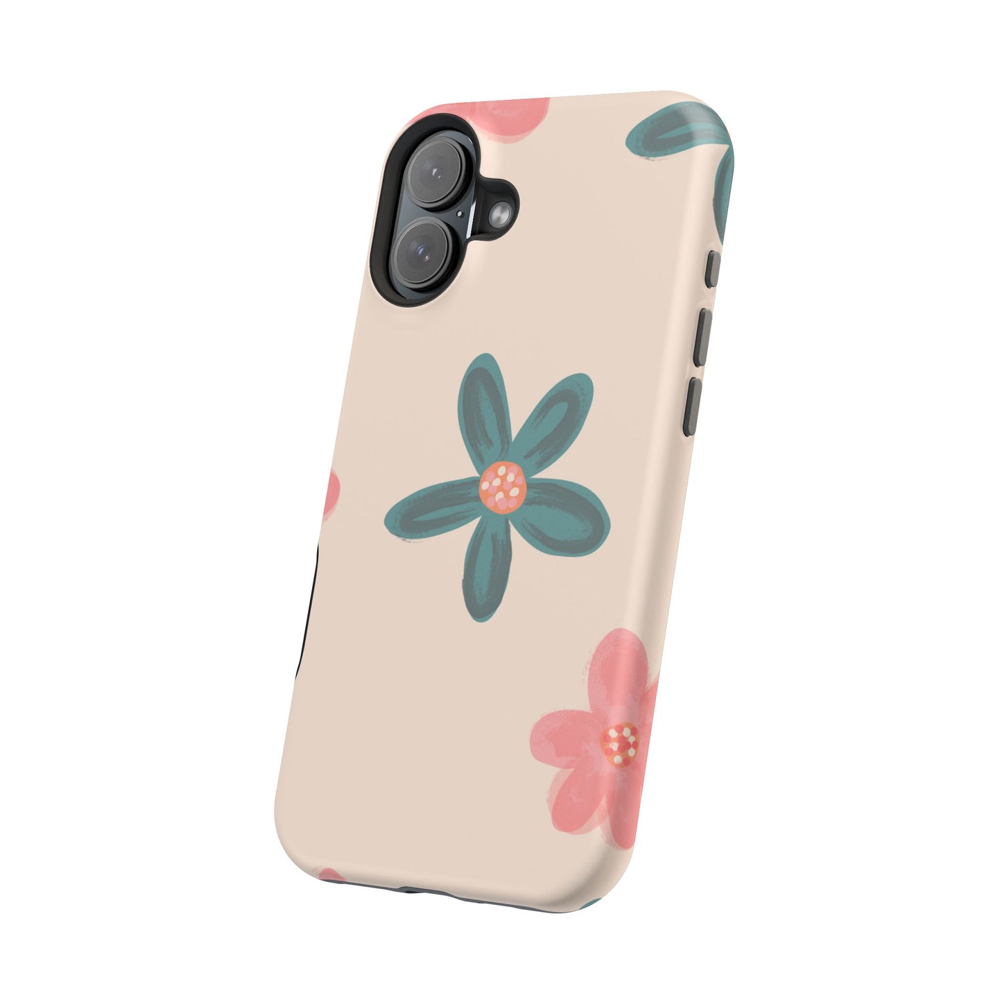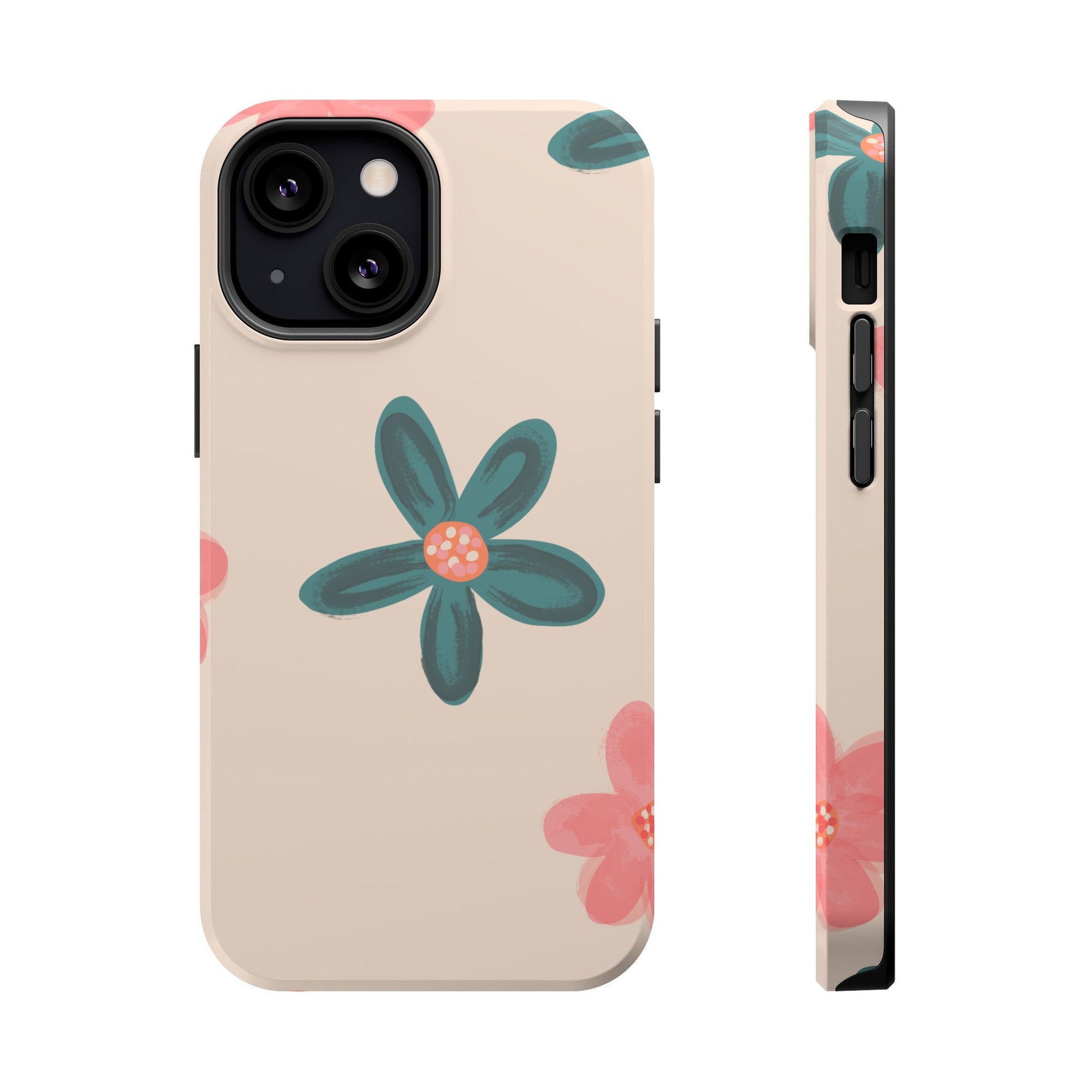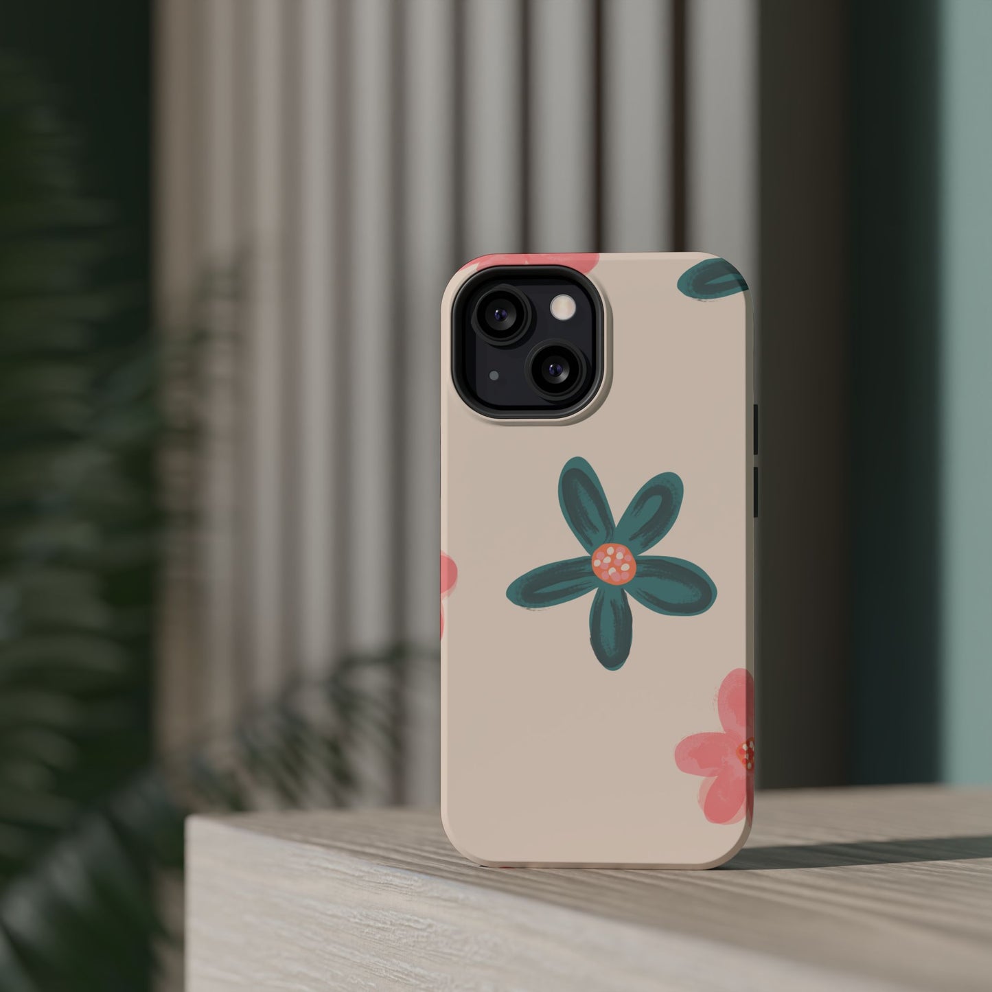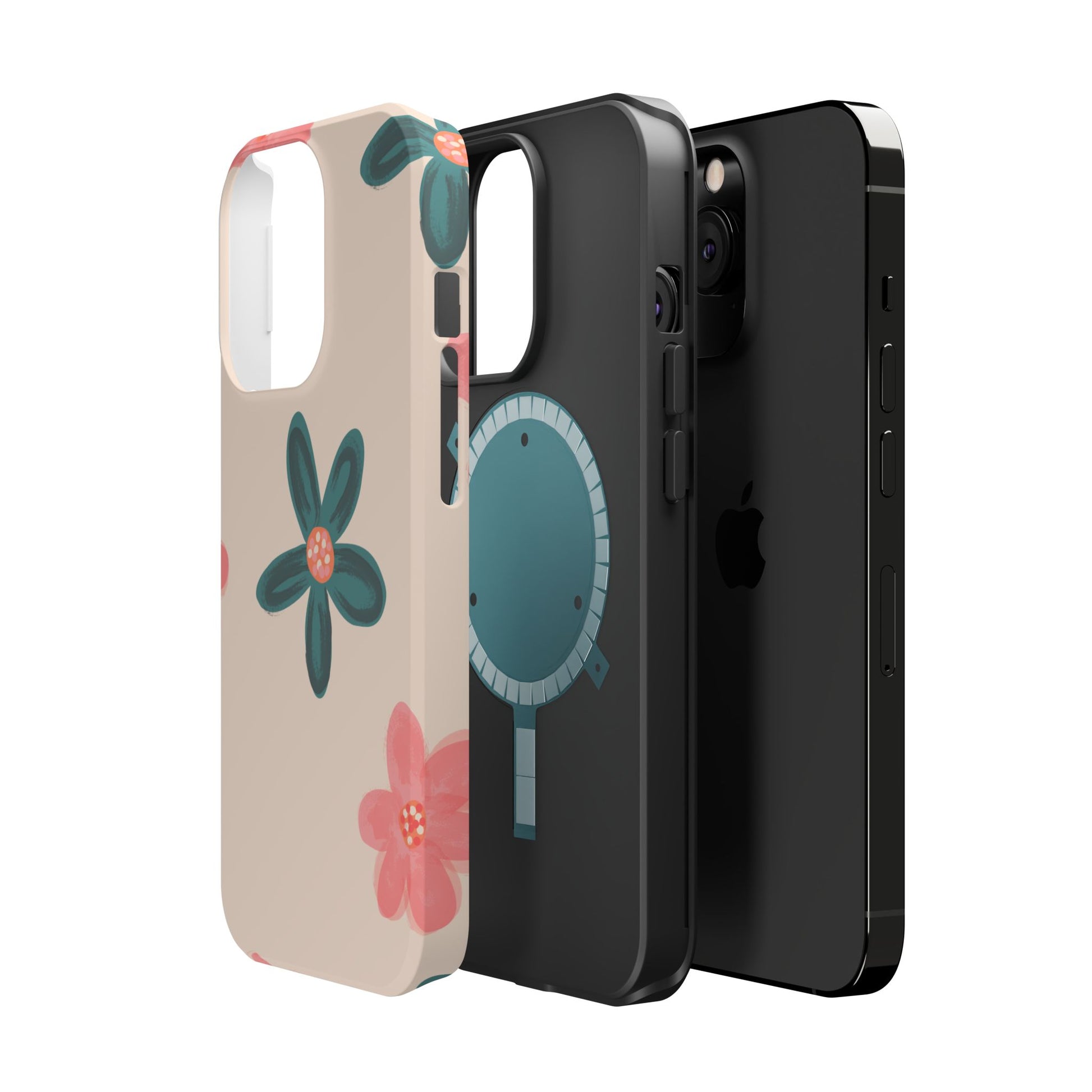 Elevate your phone’s style with our Vintage Floral Tough MagSafe  iPhone Case, featuring a charming hand-painted pattern of blush pink and deep teal flowers set against a creamy beige background. The blend of soft pastel hues and playful brushstroke texture creates a nostalgic, boho-inspired vibe, perfect for those who love a touch of vintage charm. Built for durability, this case combines a rugged polycarbonate outer shell with a shock-absorbing TPU liner to protect your phone from everyday bumps and drops. The smooth matte finish adds to its elegance while providing a secure, non-slip grip.