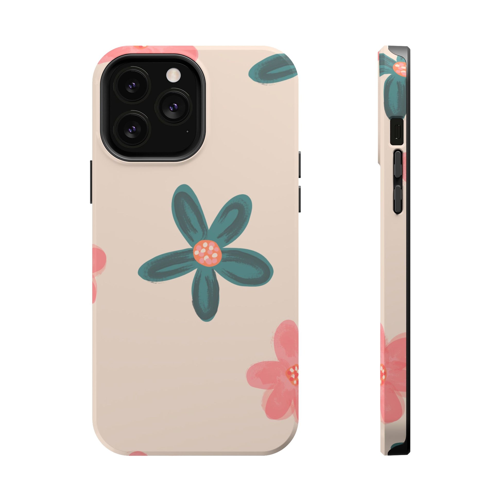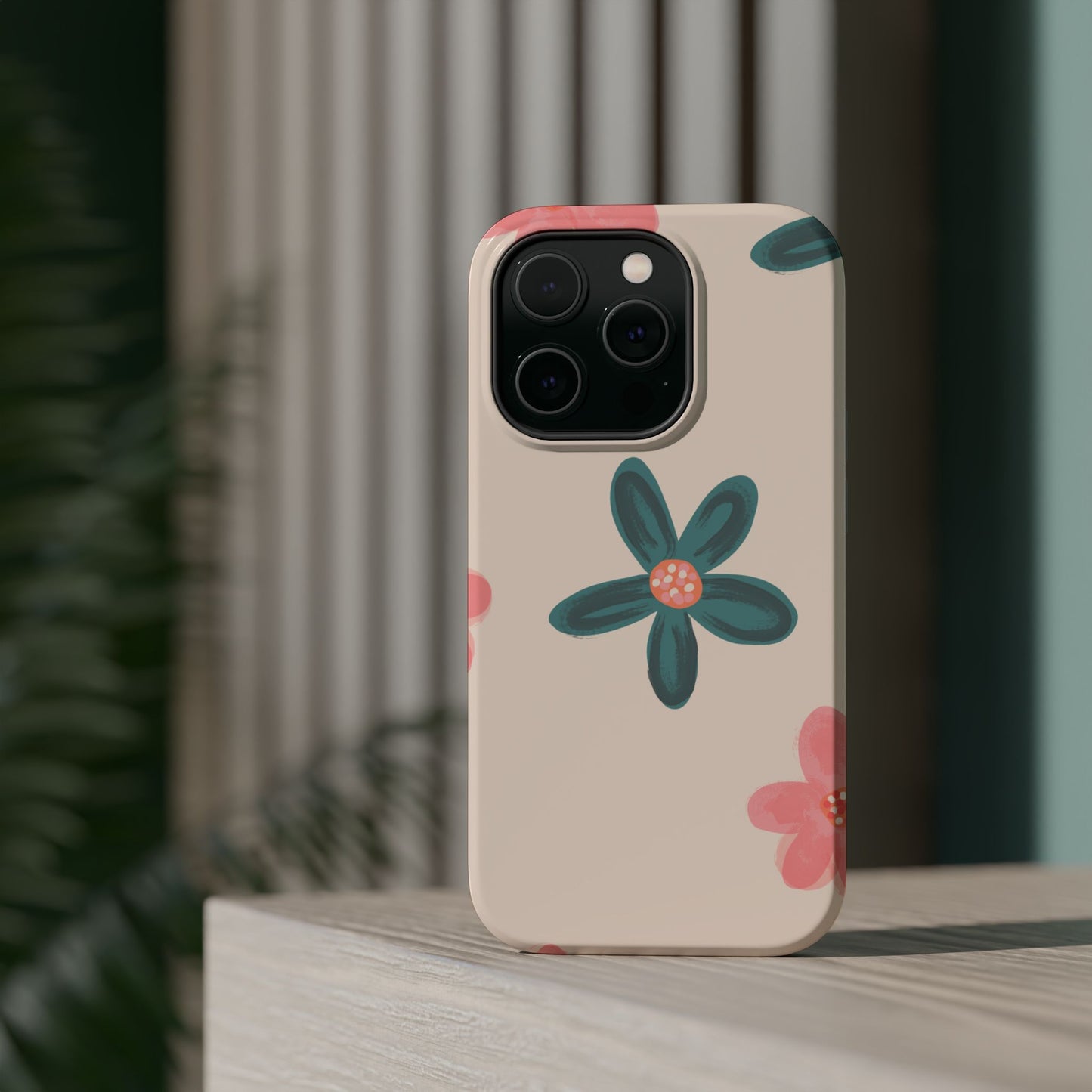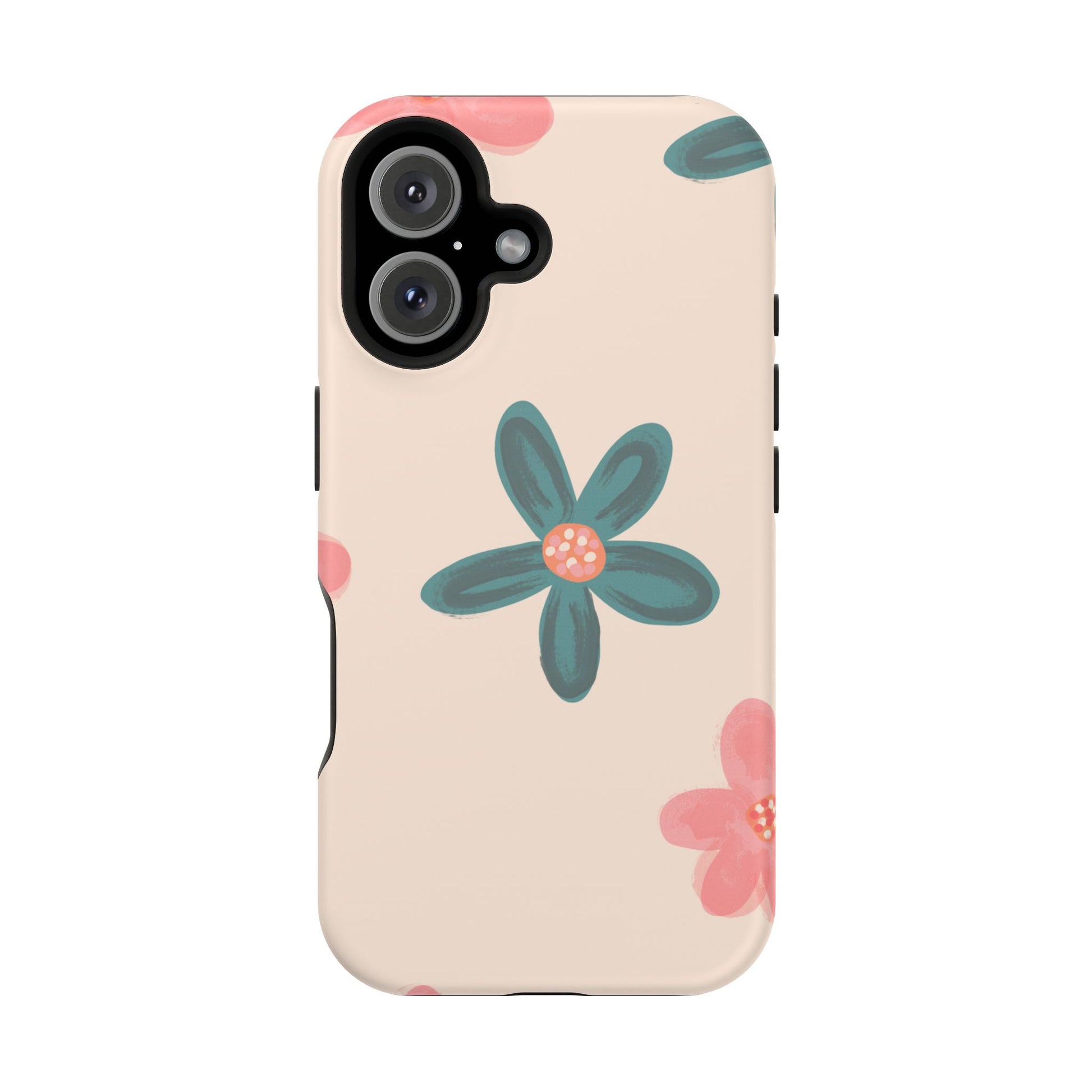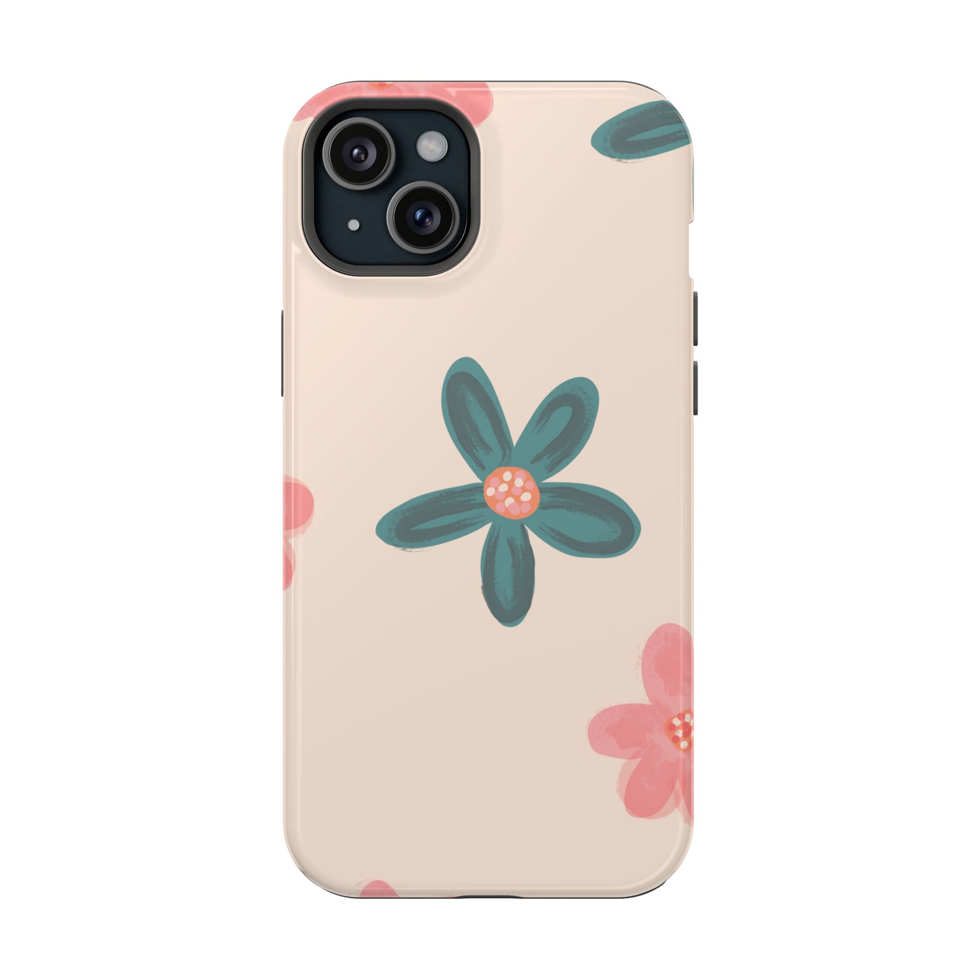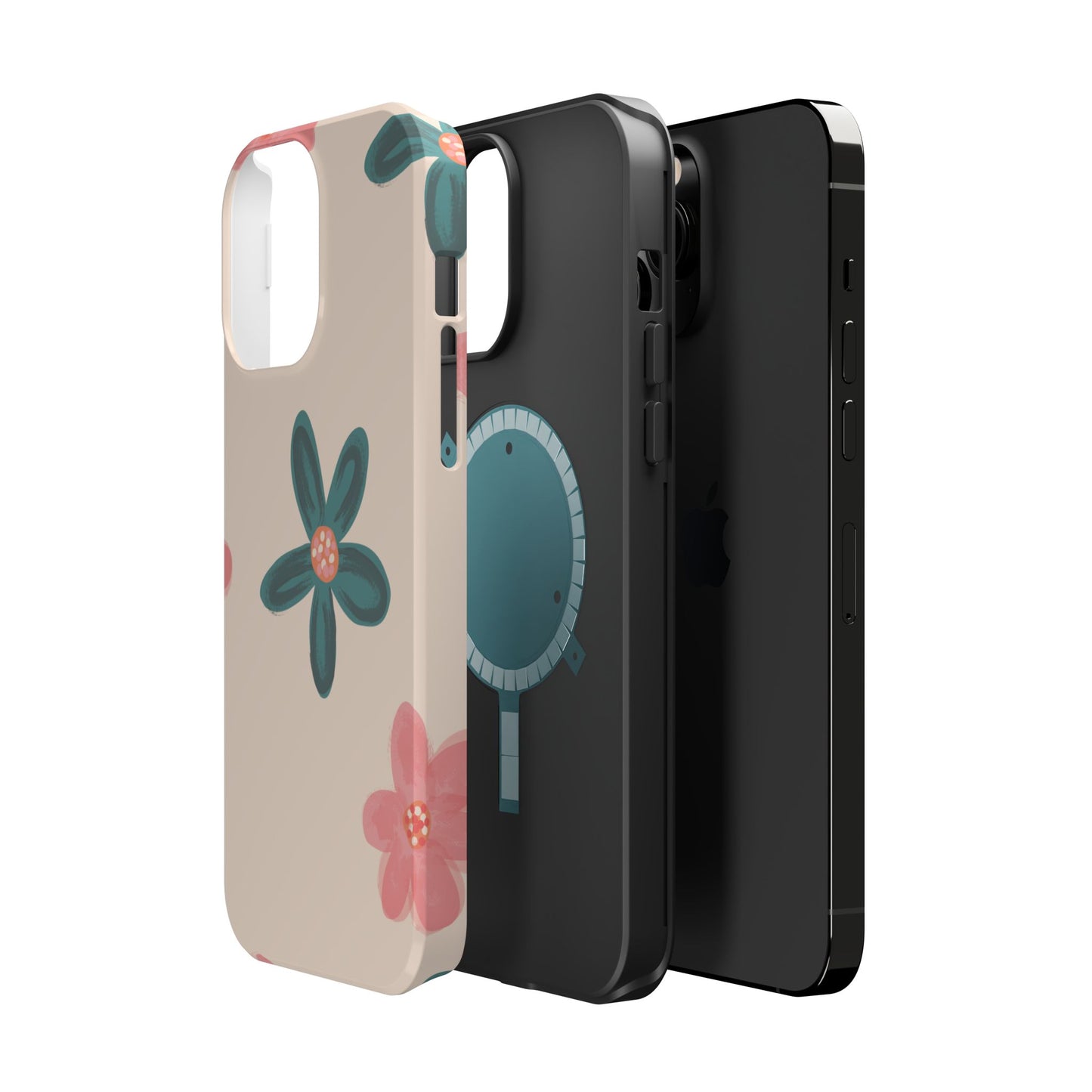 Elevate your phone’s style with our Vintage Floral Tough MagSafe  iPhone Case, featuring a charming hand-painted pattern of blush pink and deep teal flowers set against a creamy beige background. The blend of soft pastel hues and playful brushstroke texture creates a nostalgic, boho-inspired vibe, perfect for those who love a touch of vintage charm. Built for durability, this case combines a rugged polycarbonate outer shell with a shock-absorbing TPU liner to protect your phone from everyday bumps and drops. The smooth matte finish adds to its elegance while providing a secure, non-slip grip.
