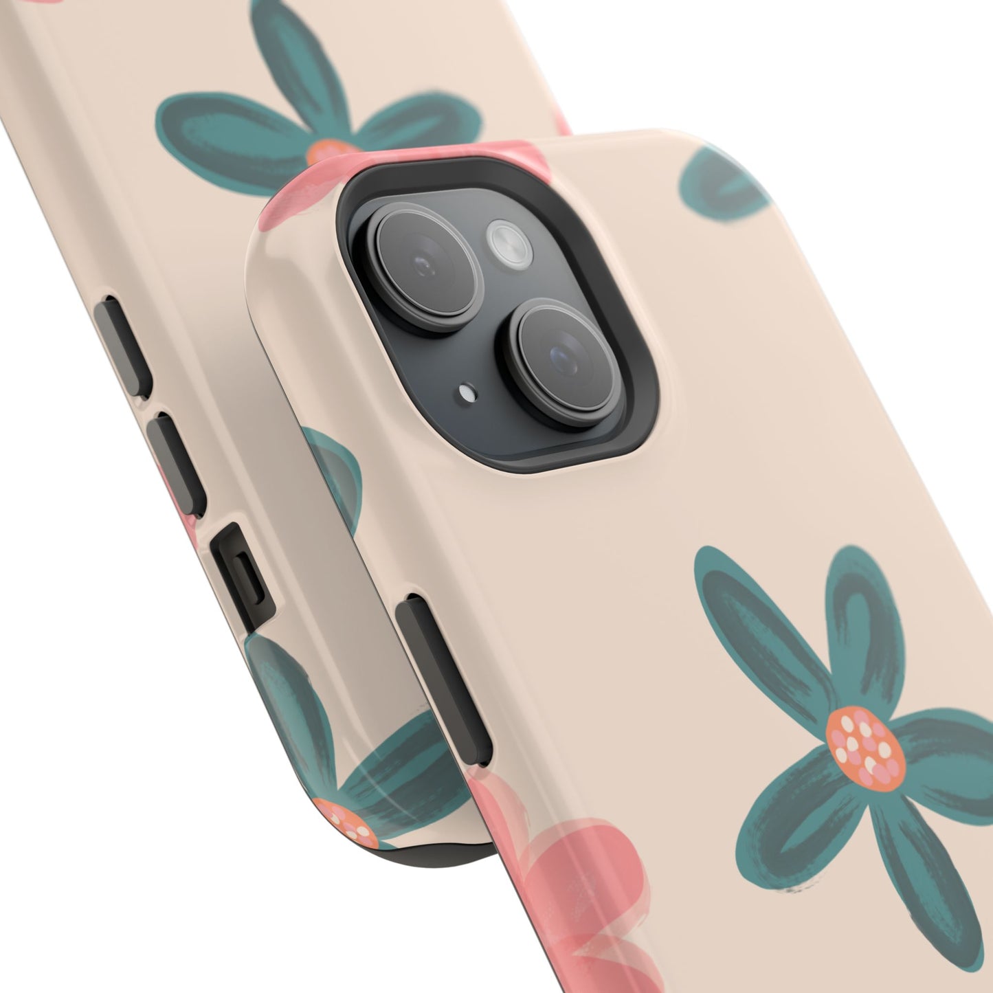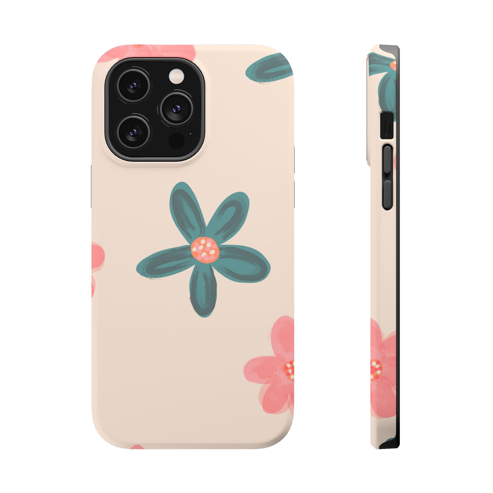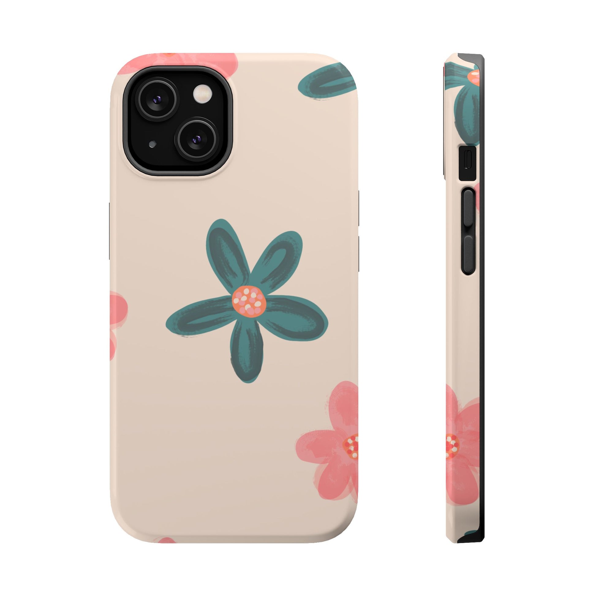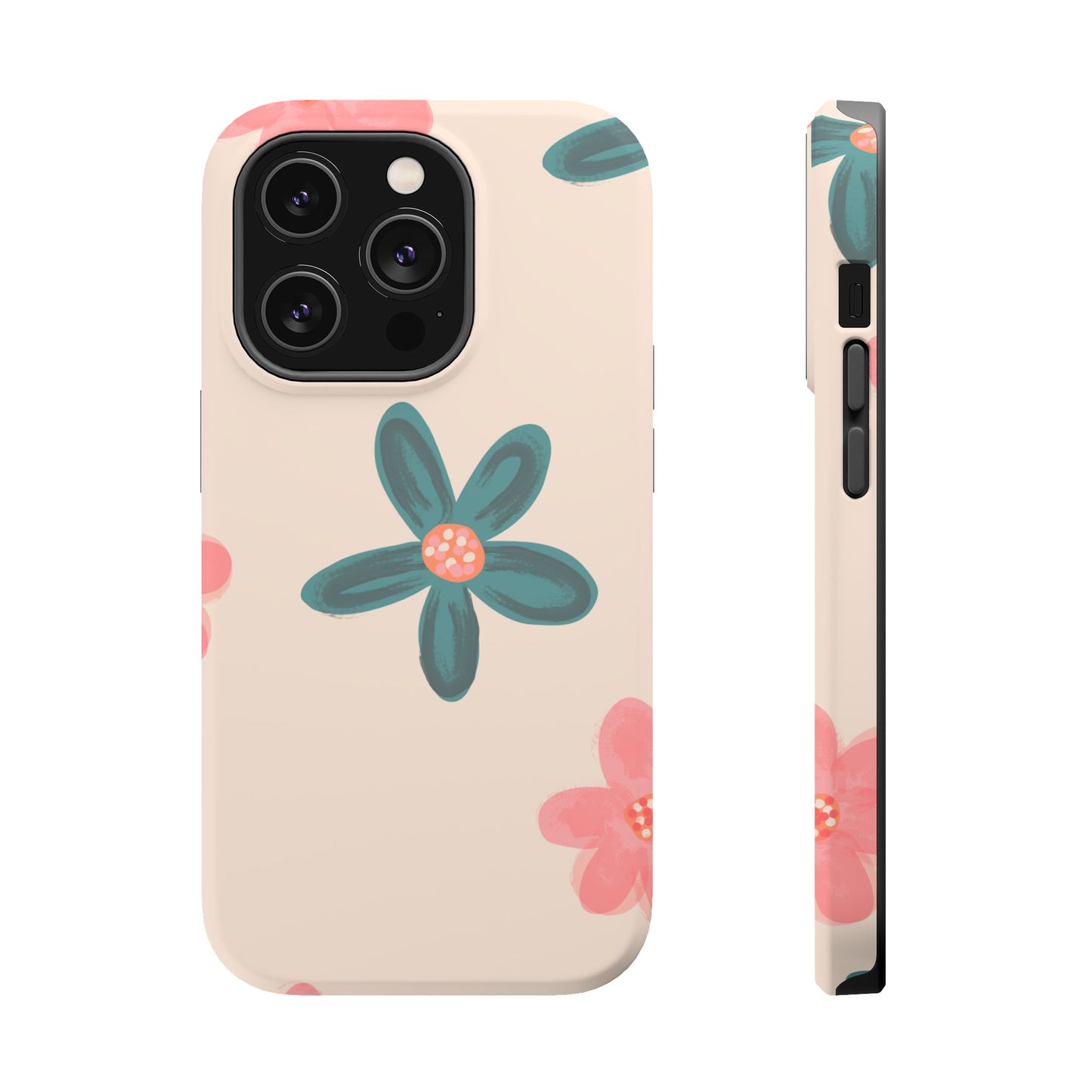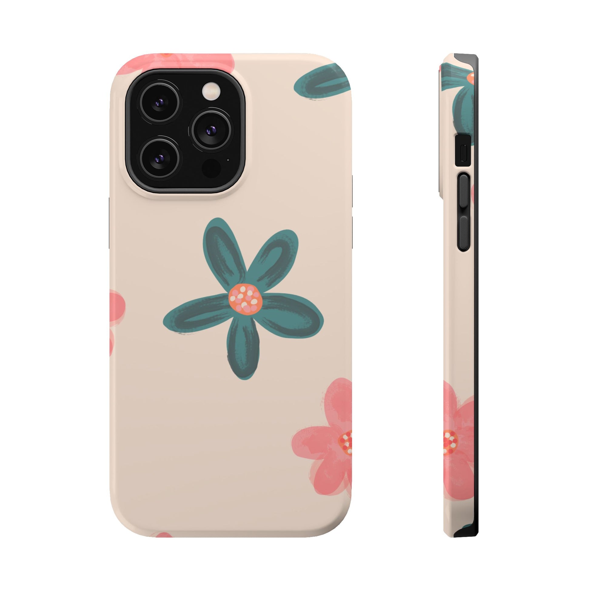 Elevate your phone’s style with our Vintage Floral Tough MagSafe  iPhone Case, featuring a charming hand-painted pattern of blush pink and deep teal flowers set against a creamy beige background. The blend of soft pastel hues and playful brushstroke texture creates a nostalgic, boho-inspired vibe, perfect for those who love a touch of vintage charm. Built for durability, this case combines a rugged polycarbonate outer shell with a shock-absorbing TPU liner to protect your phone from everyday bumps and drops. The smooth matte finish adds to its elegance while providing a secure, non-slip grip.