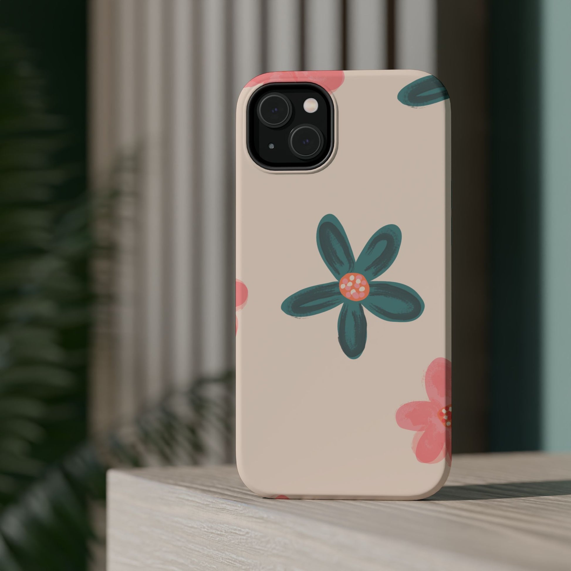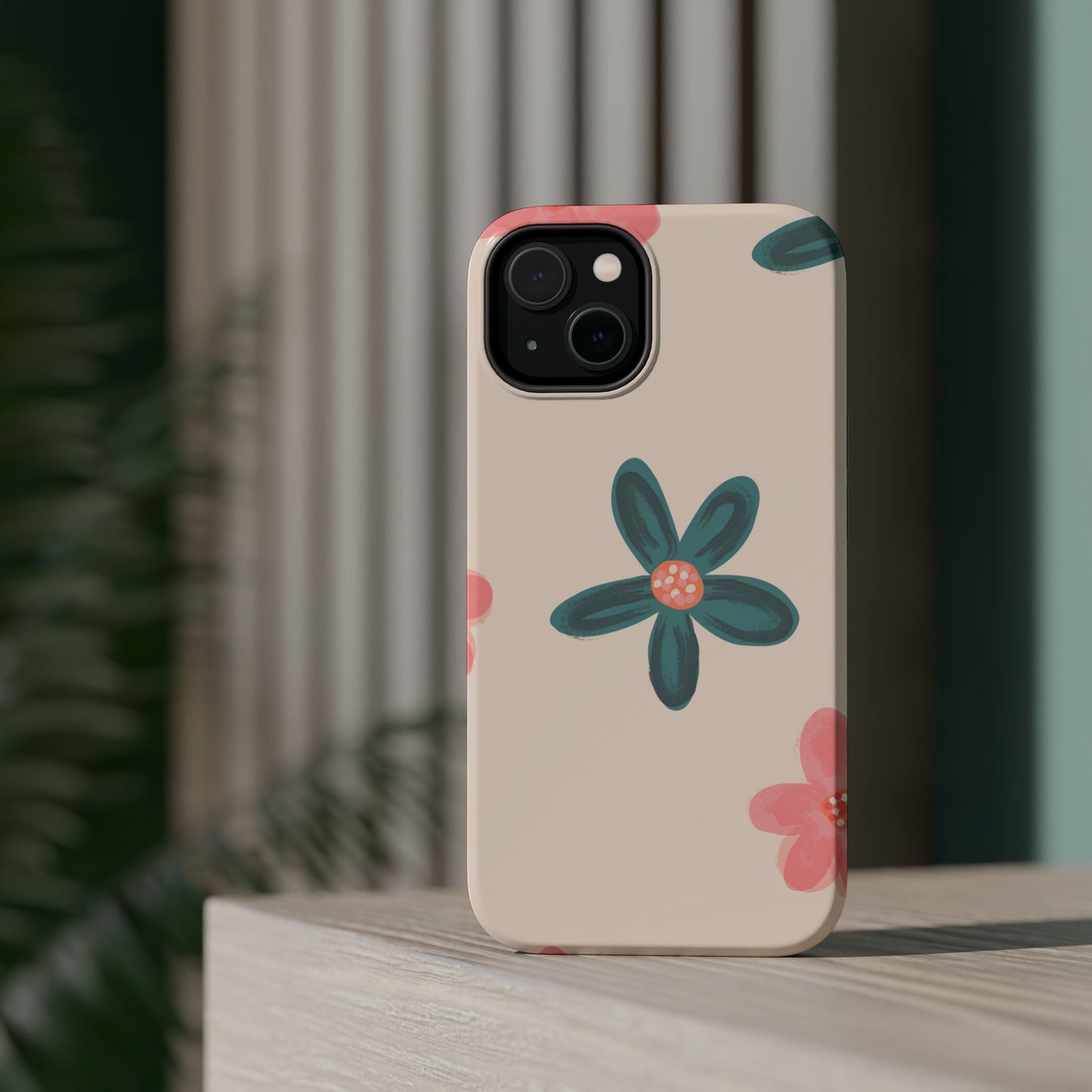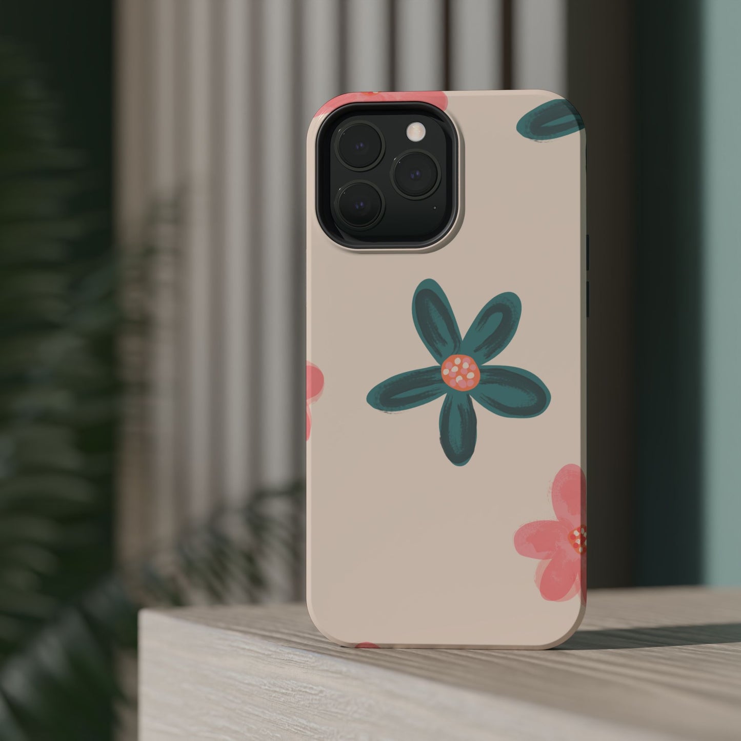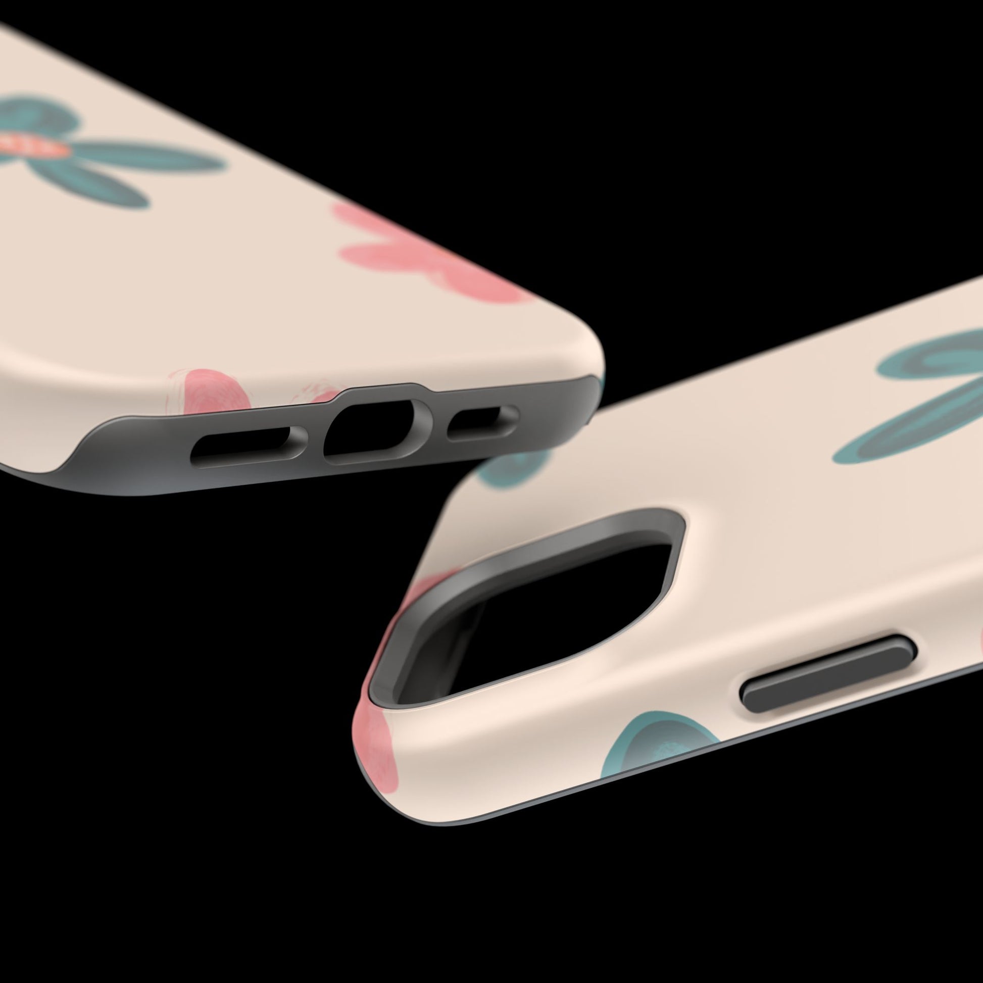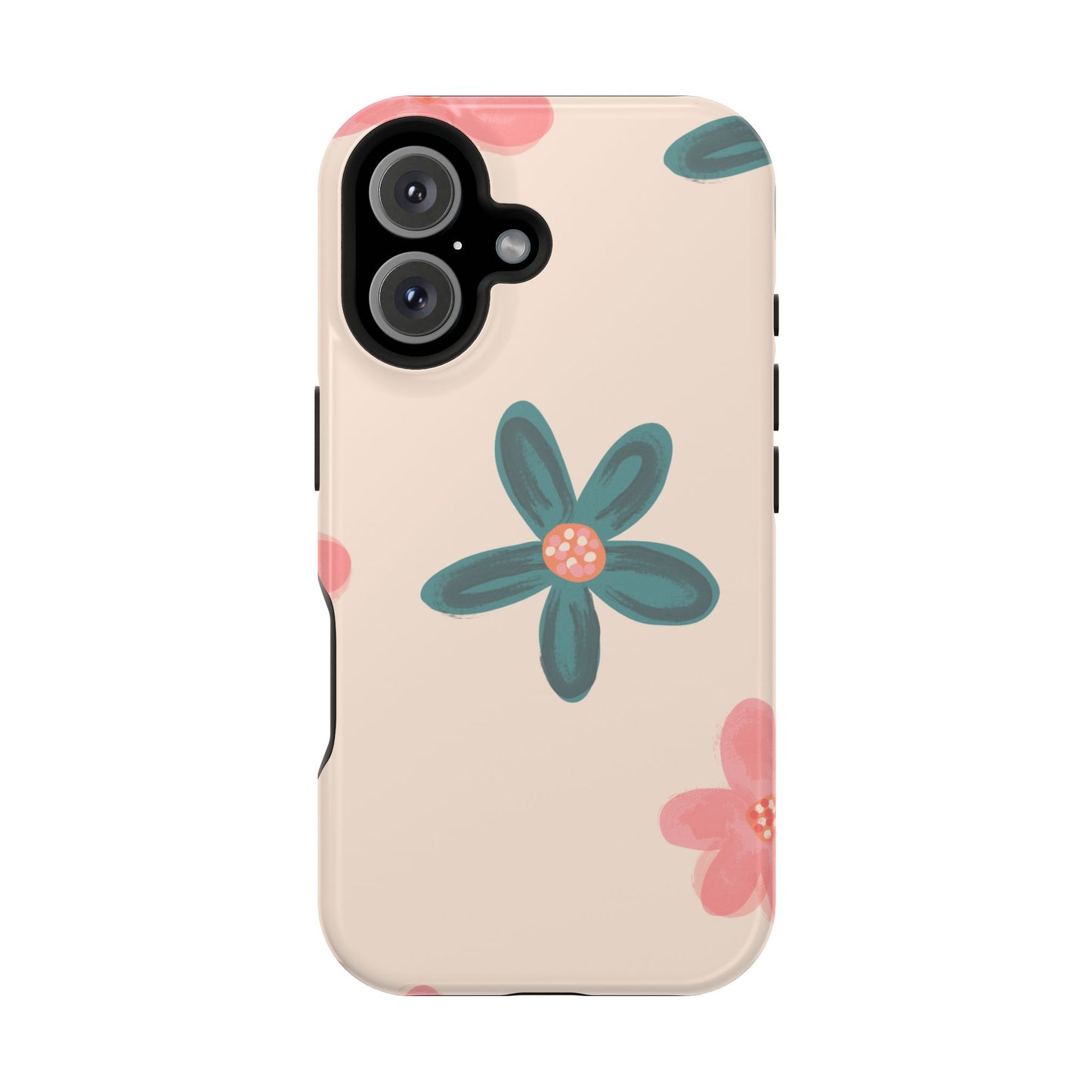 Elevate your phone’s style with our Vintage Floral Tough MagSafe  iPhone Case, featuring a charming hand-painted pattern of blush pink and deep teal flowers set against a creamy beige background. The blend of soft pastel hues and playful brushstroke texture creates a nostalgic, boho-inspired vibe, perfect for those who love a touch of vintage charm. Built for durability, this case combines a rugged polycarbonate outer shell with a shock-absorbing TPU liner to protect your phone from everyday bumps and drops. The smooth matte finish adds to its elegance while providing a secure, non-slip grip.