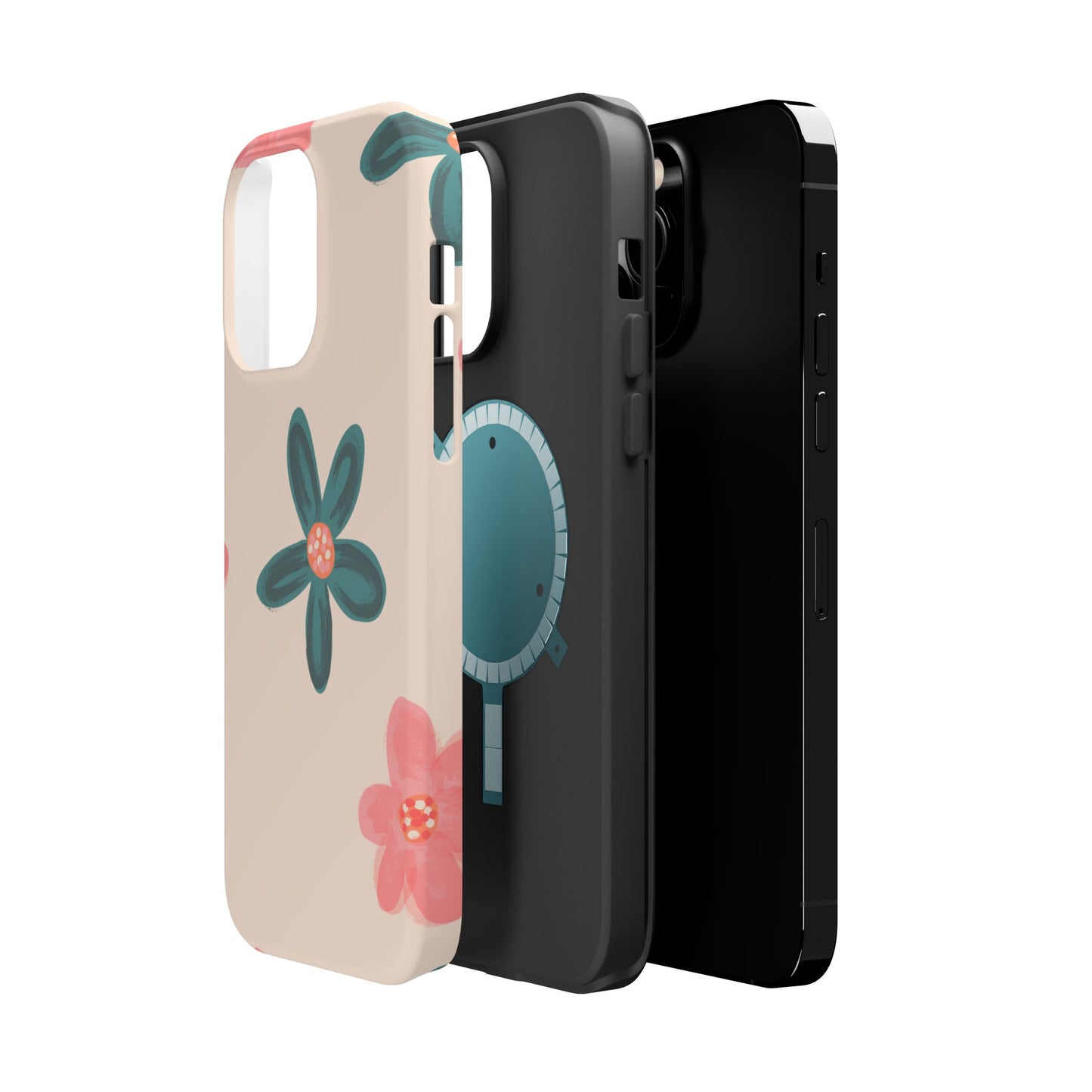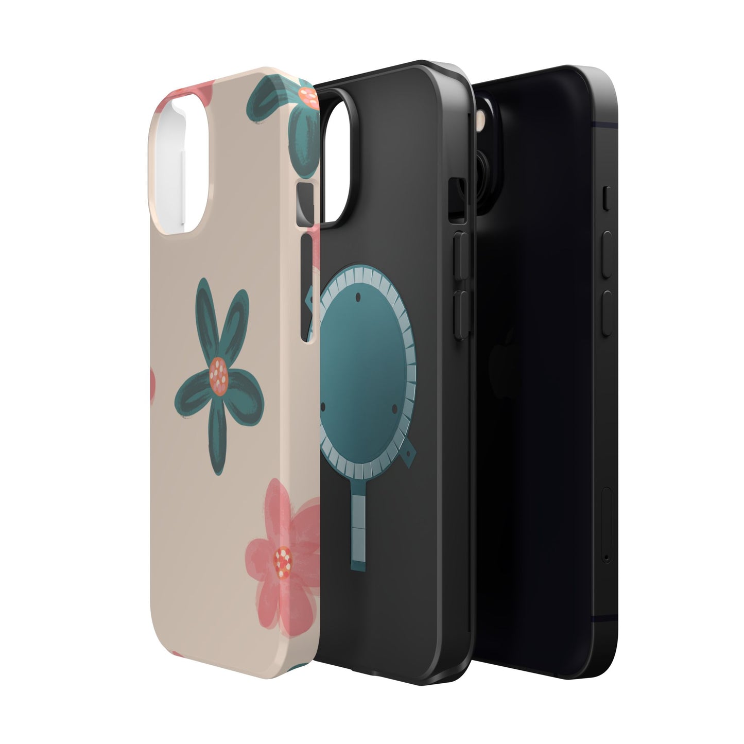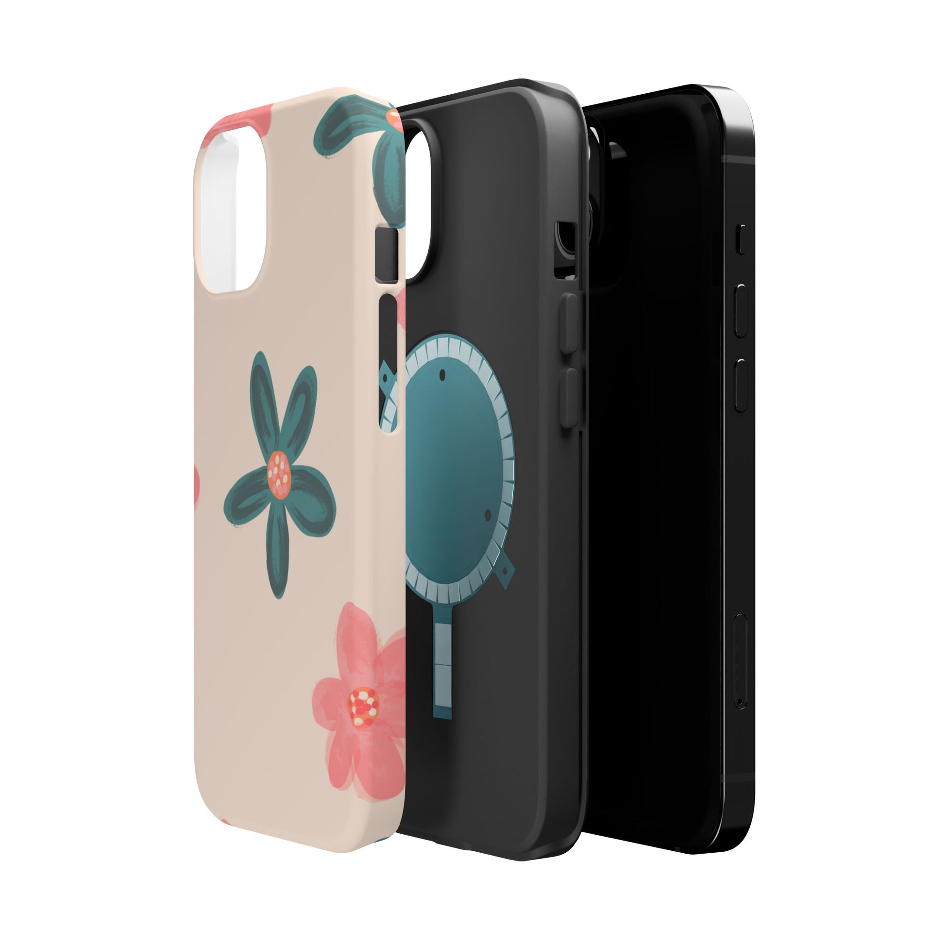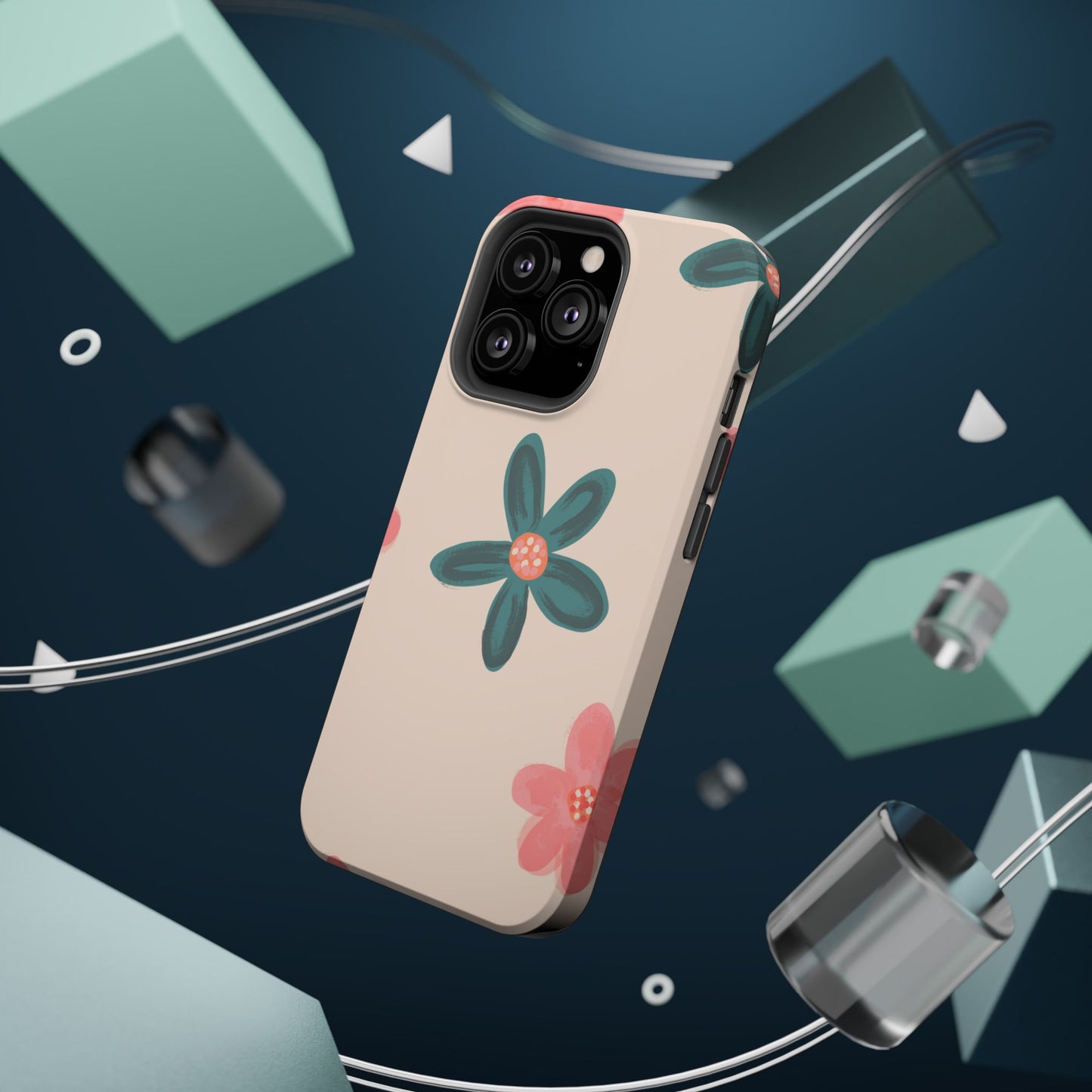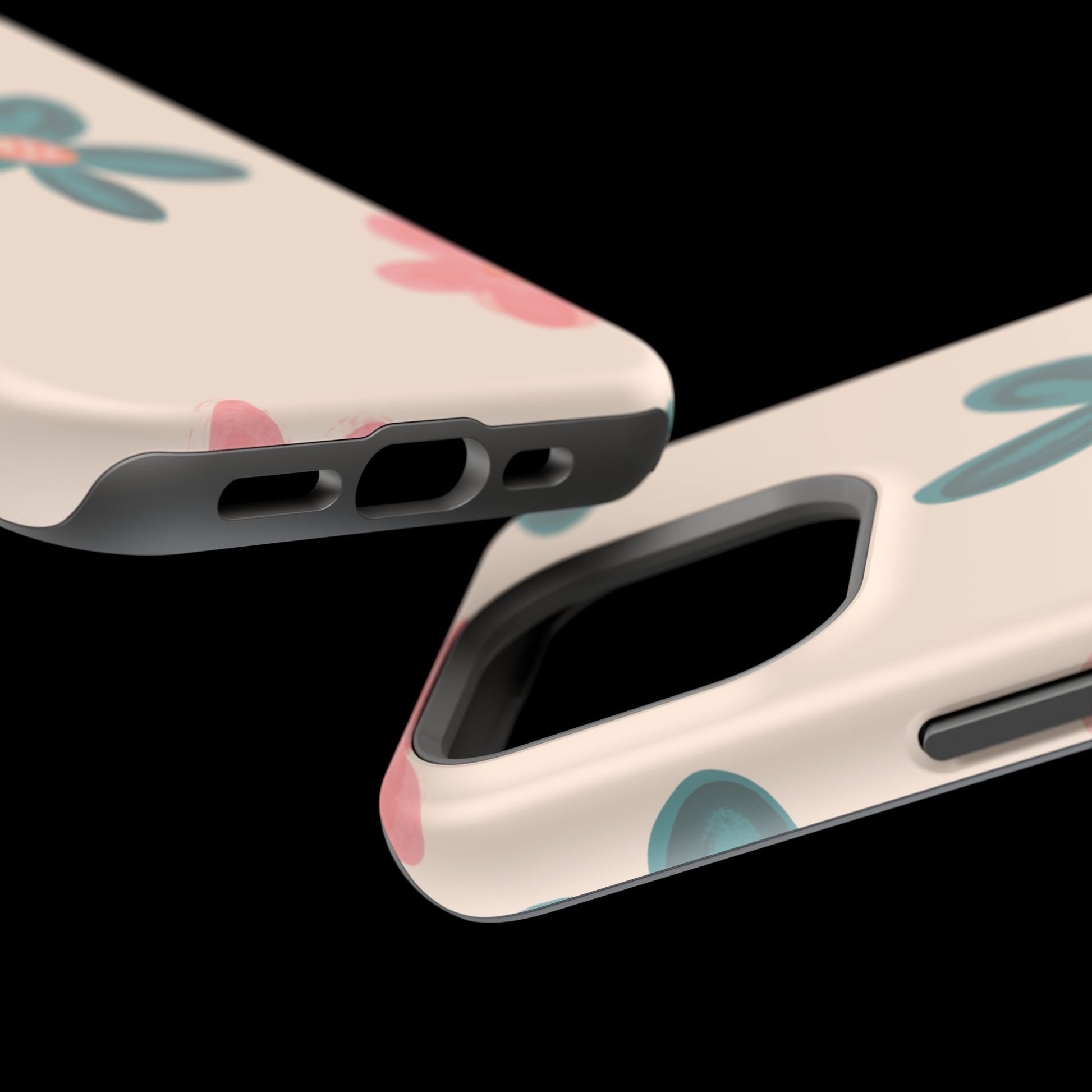 Elevate your phone’s style with our Vintage Floral Tough MagSafe  iPhone Case, featuring a charming hand-painted pattern of blush pink and deep teal flowers set against a creamy beige background. The blend of soft pastel hues and playful brushstroke texture creates a nostalgic, boho-inspired vibe, perfect for those who love a touch of vintage charm. Built for durability, this case combines a rugged polycarbonate outer shell with a shock-absorbing TPU liner to protect your phone from everyday bumps and drops. The smooth matte finish adds to its elegance while providing a secure, non-slip grip.