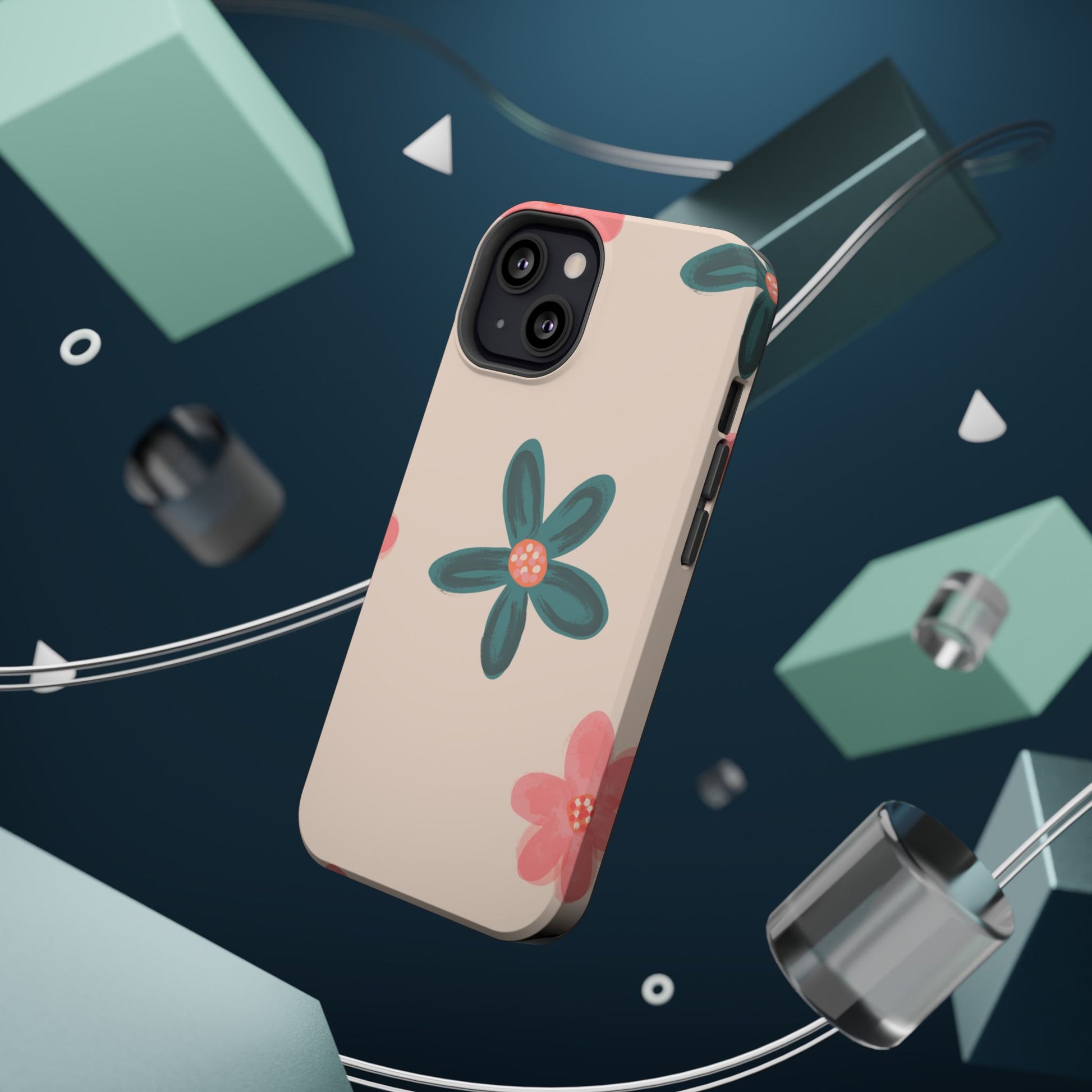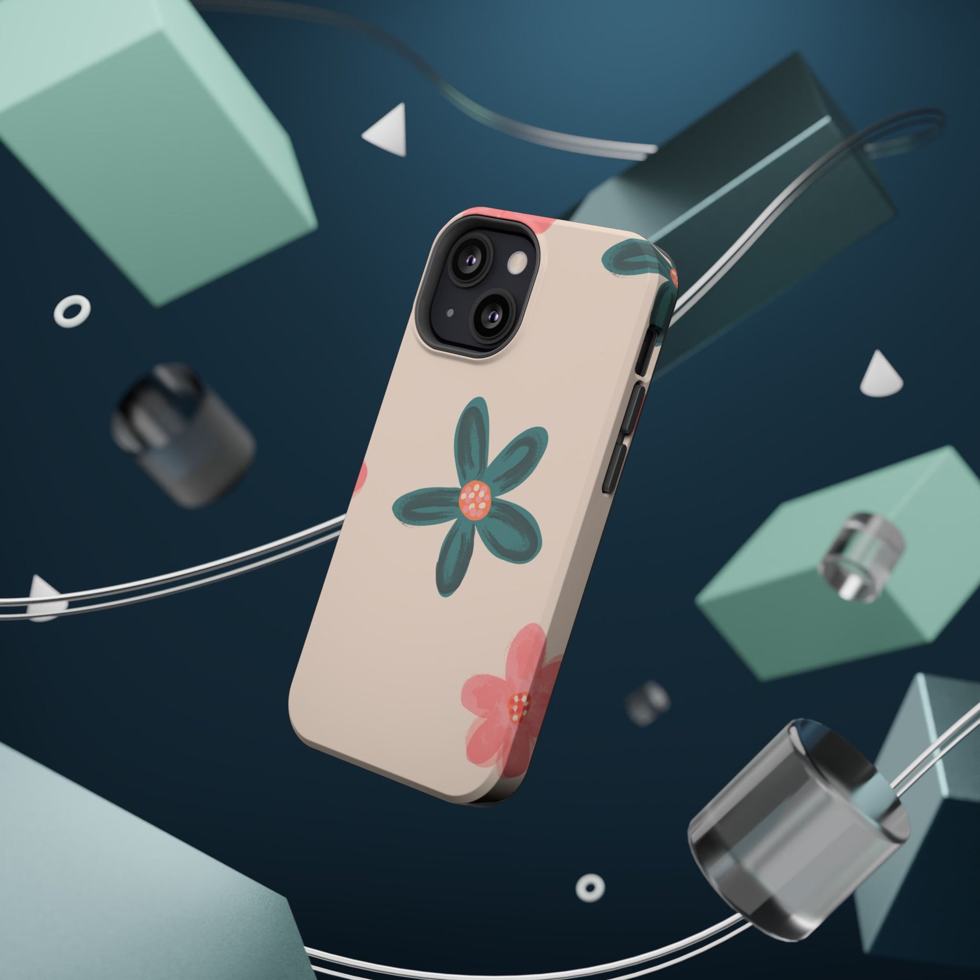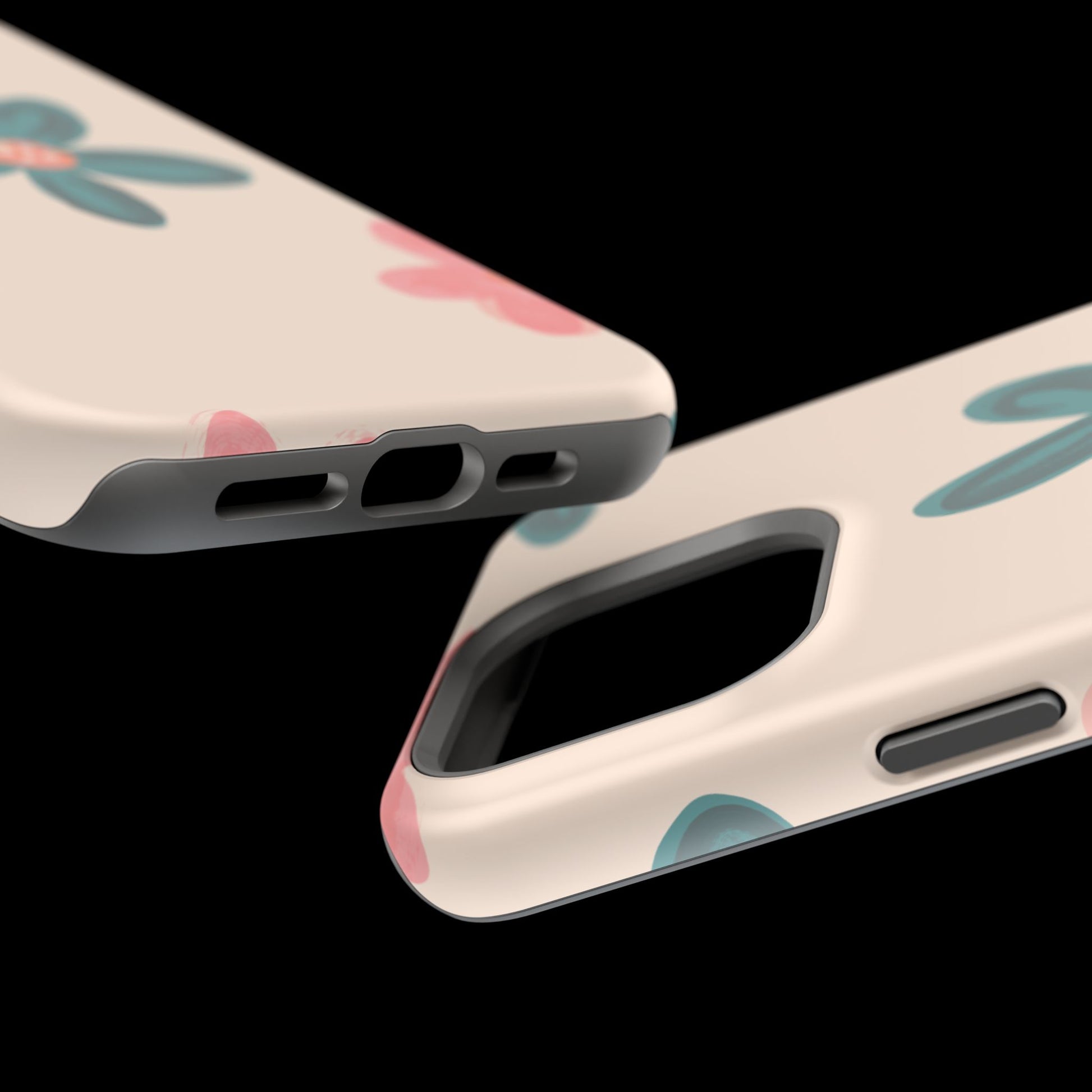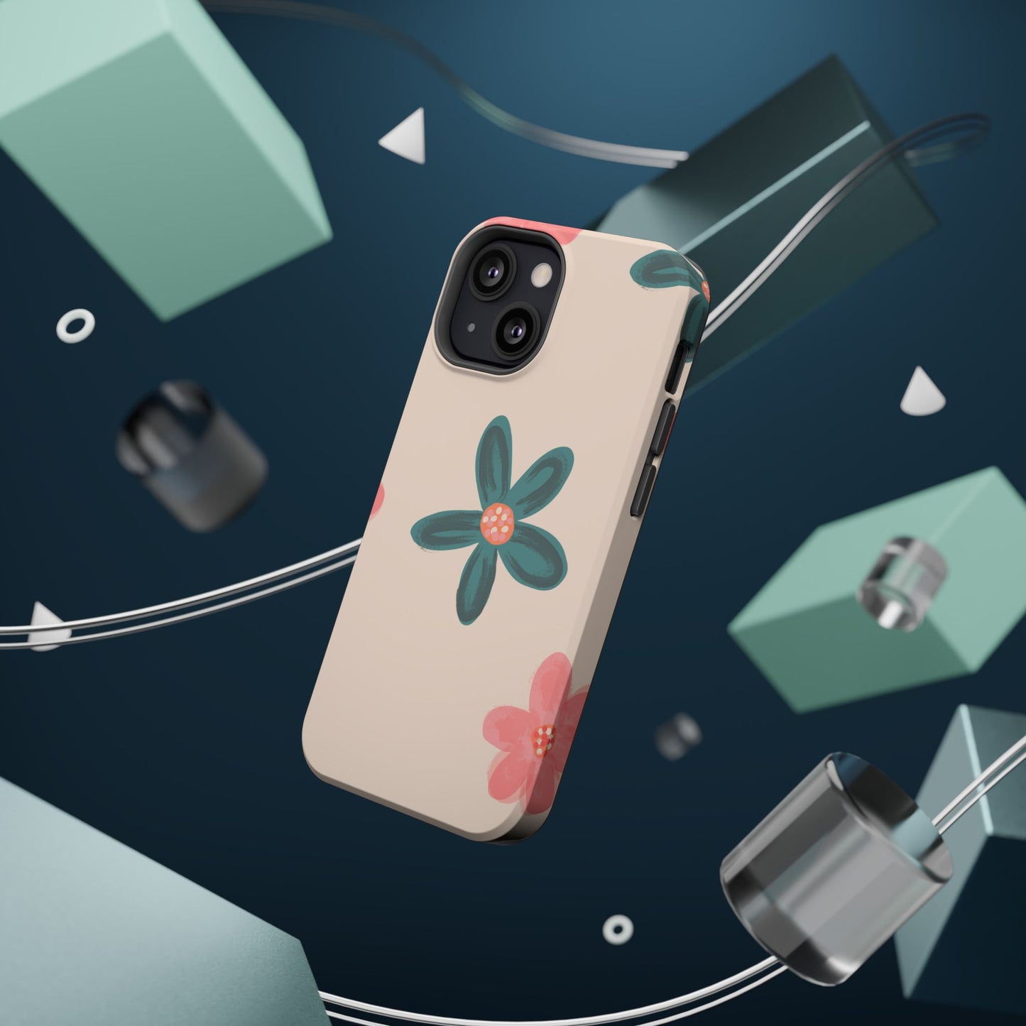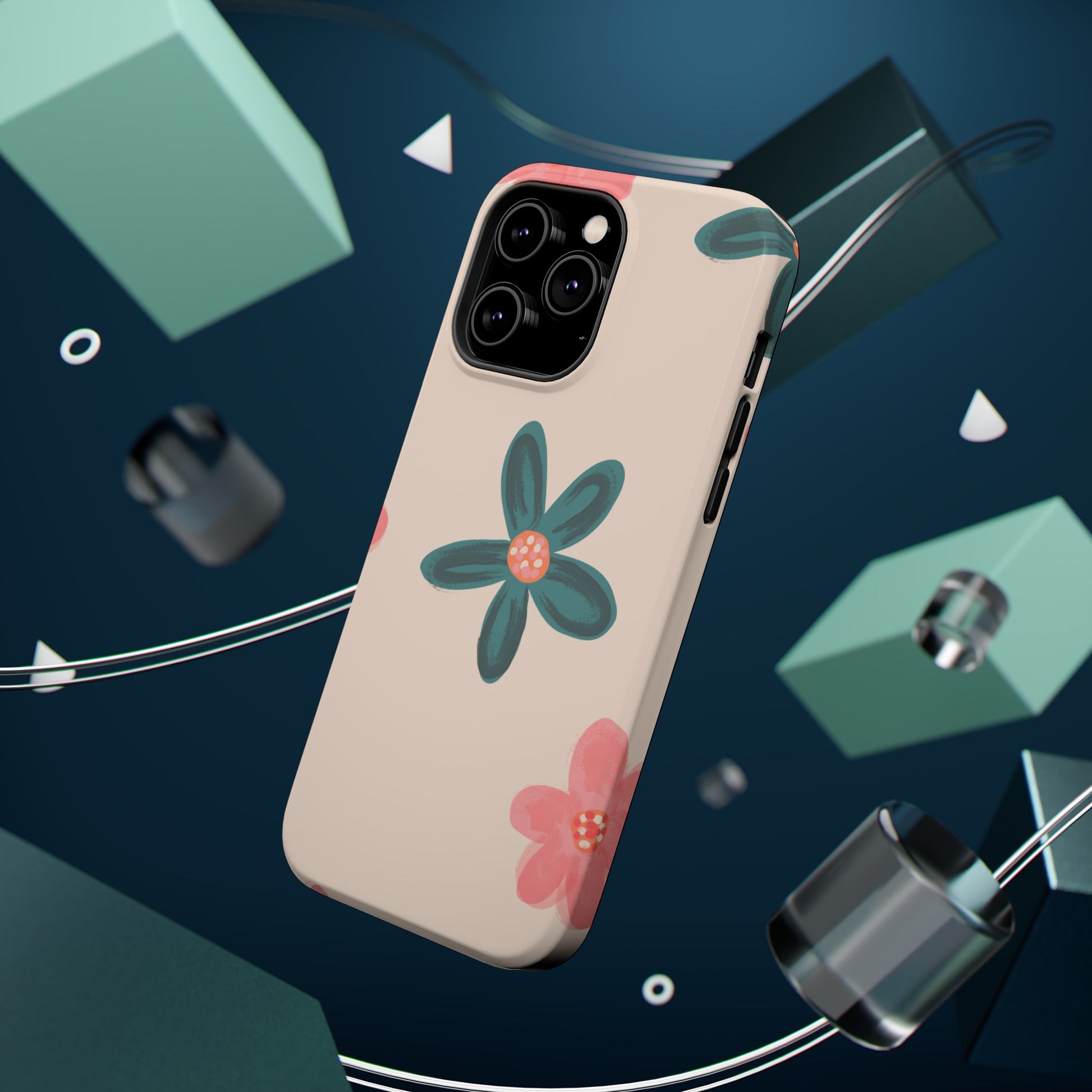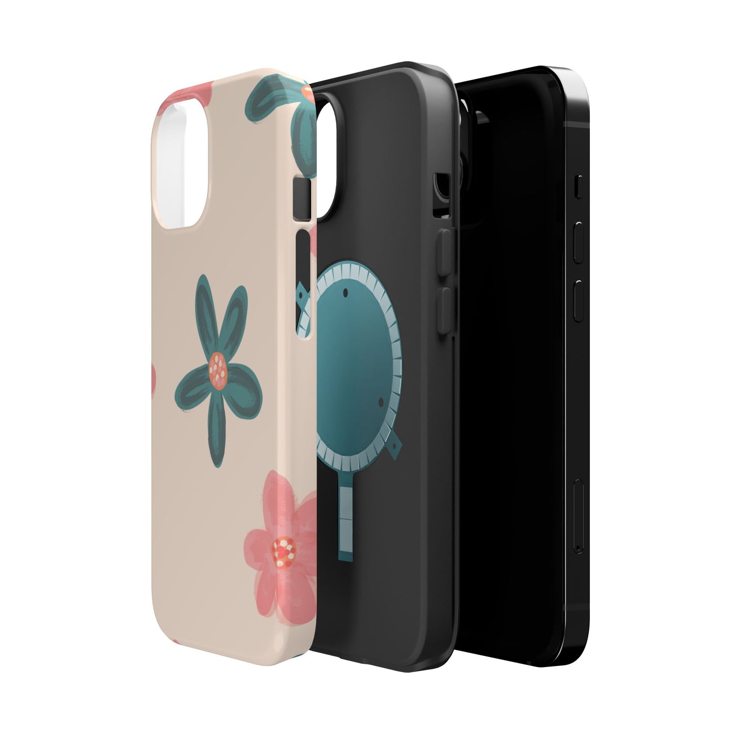 Elevate your phone’s style with our Vintage Floral Tough MagSafe  iPhone Case, featuring a charming hand-painted pattern of blush pink and deep teal flowers set against a creamy beige background. The blend of soft pastel hues and playful brushstroke texture creates a nostalgic, boho-inspired vibe, perfect for those who love a touch of vintage charm. Built for durability, this case combines a rugged polycarbonate outer shell with a shock-absorbing TPU liner to protect your phone from everyday bumps and drops. The smooth matte finish adds to its elegance while providing a secure, non-slip grip.