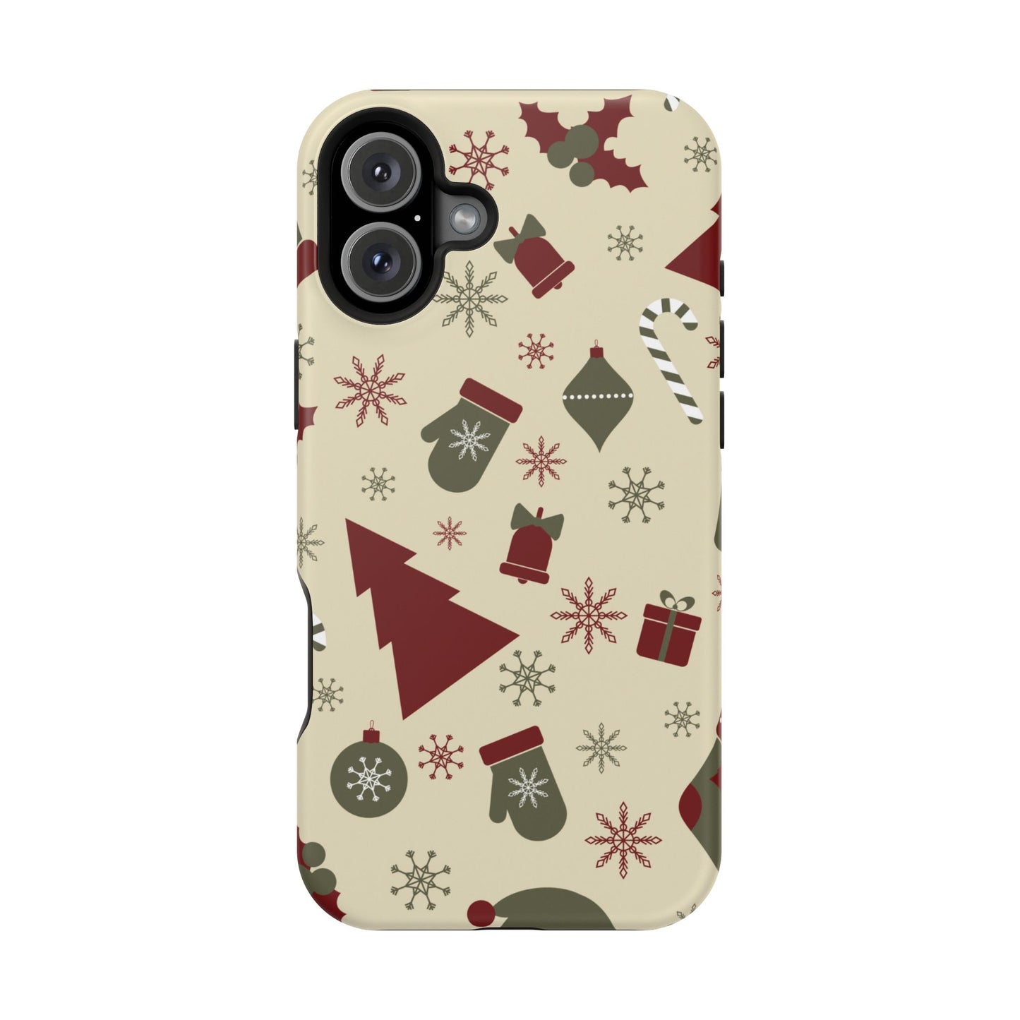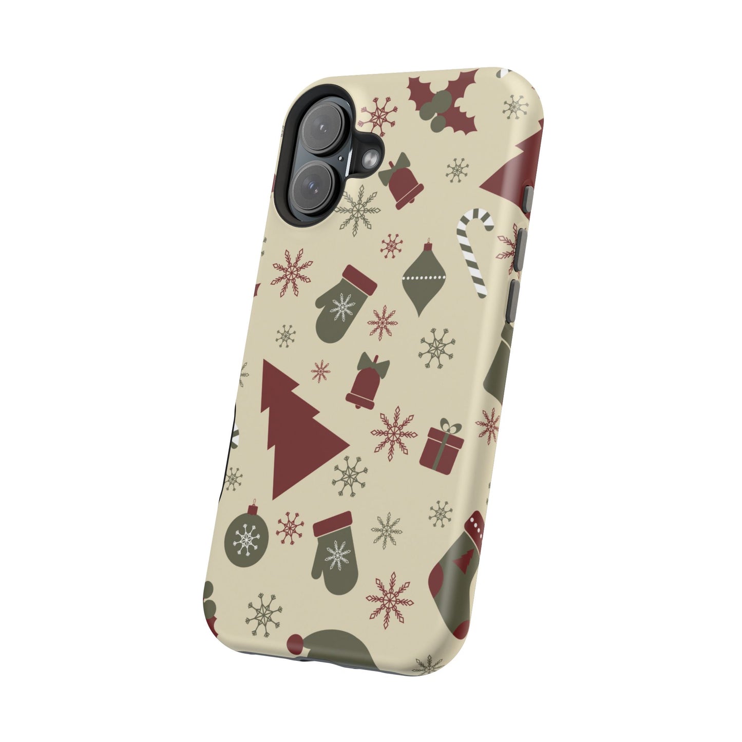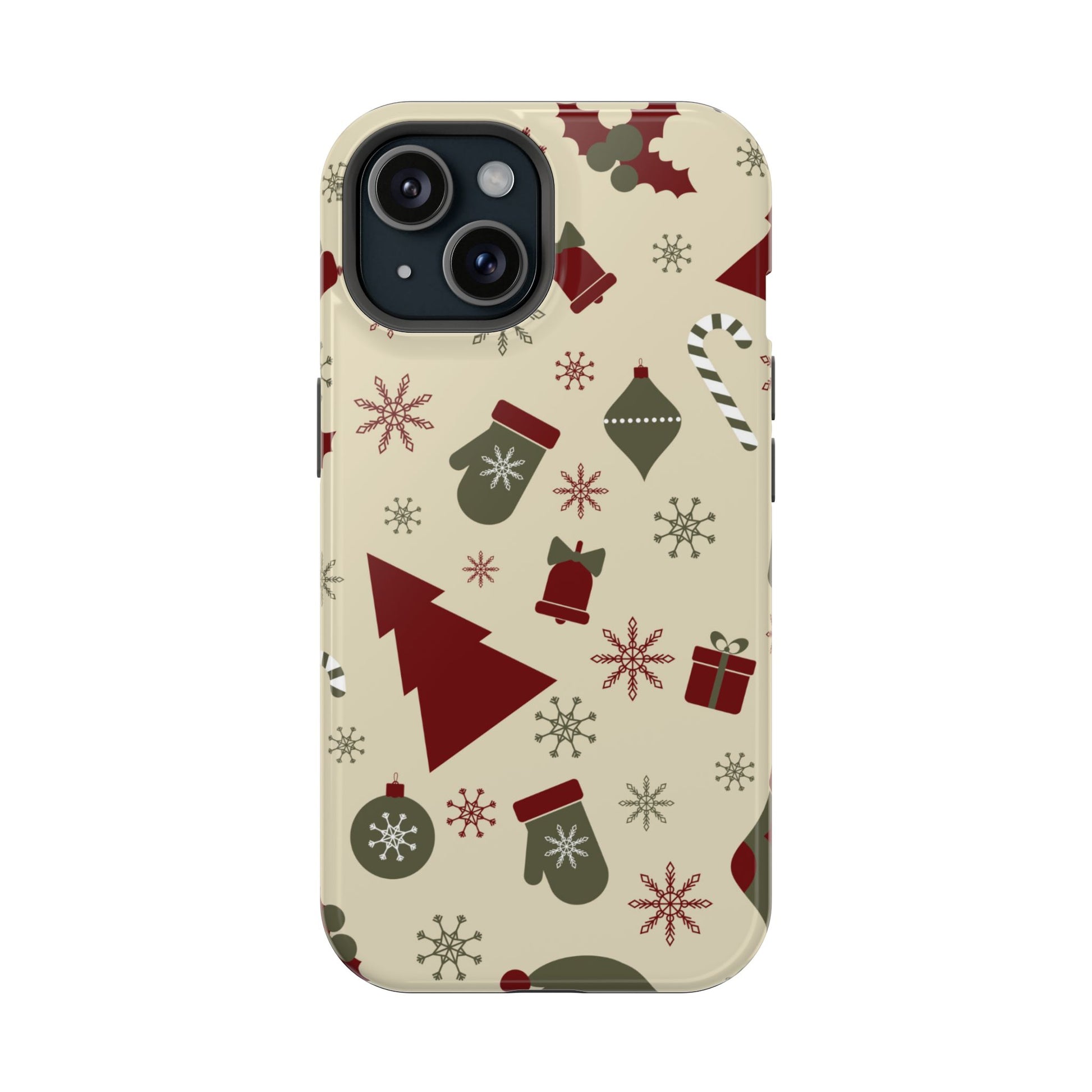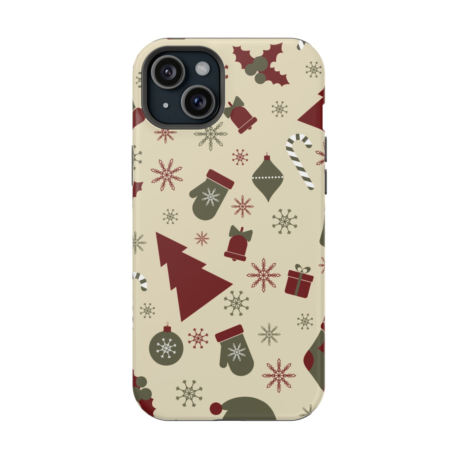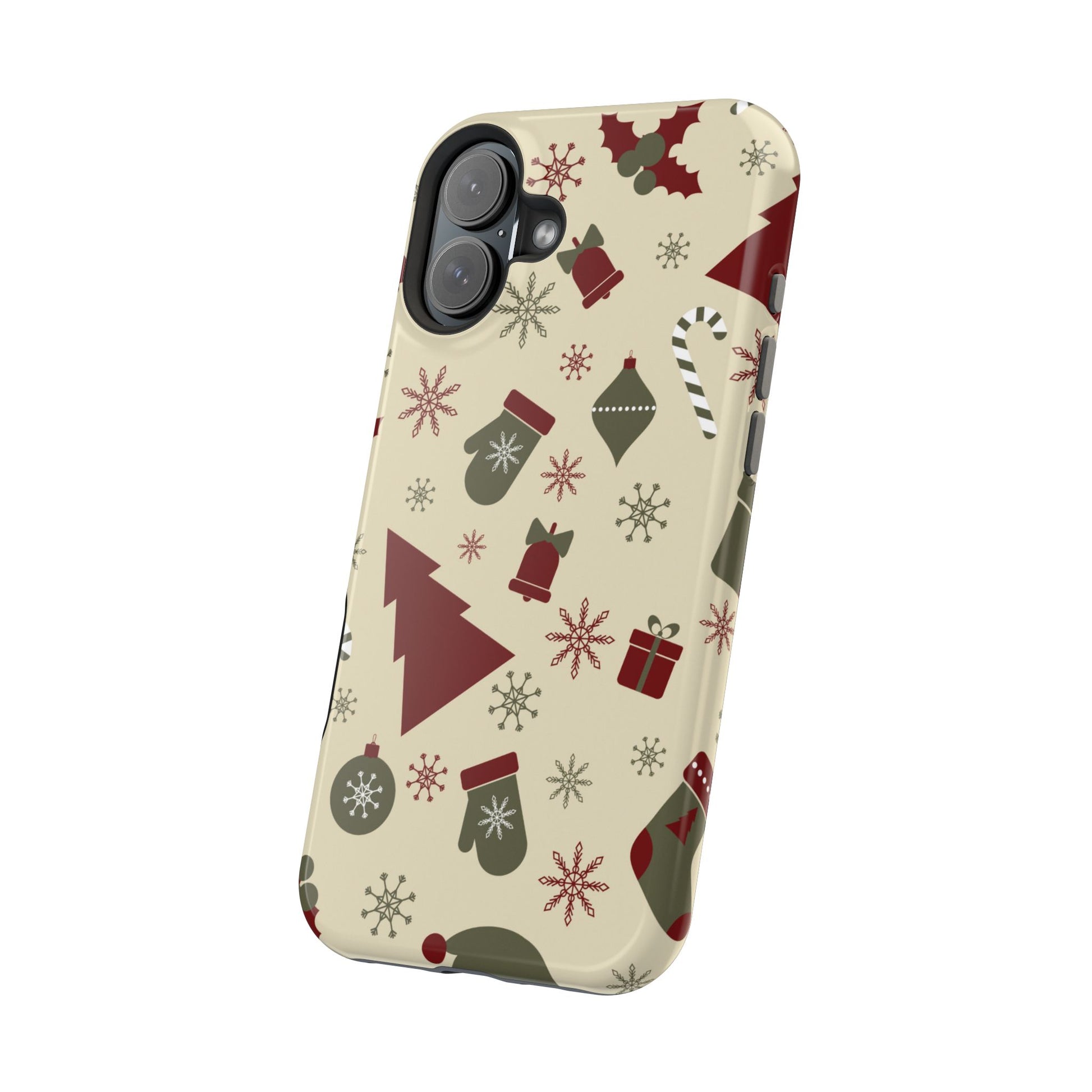 Embrace the spirit of the season with our Vintage Holiday Cheer MagSafe iPhone Case! This charming design showcases festive icons in classic red, green, and cream tones, including snowflakes, Christmas trees, candy canes, and gift boxes, all set on a warm, beige background. Perfect for adding a touch of retro holiday style to your phone, this case brings nostalgic holiday vibes wherever you go. Crafted from durable materials, it provides reliable protection against everyday bumps and scratches while keeping your phone lightweight and sleek. Celebrate the holidays in style with this festive, functional case!