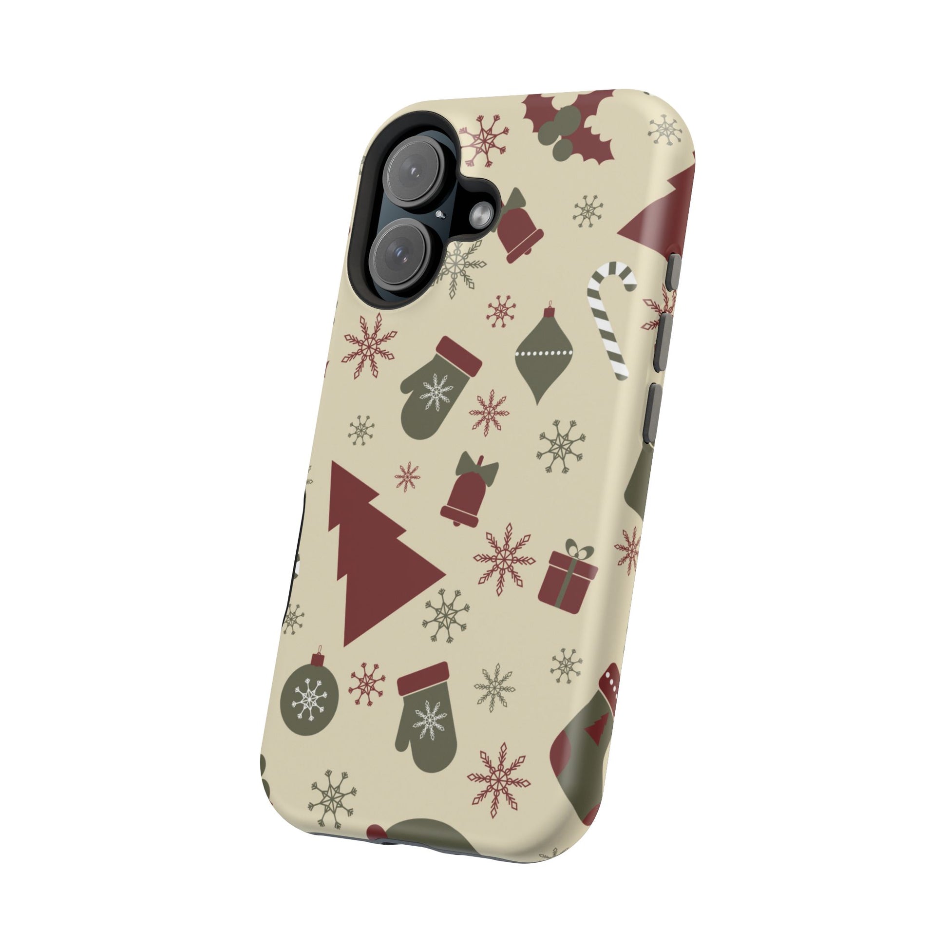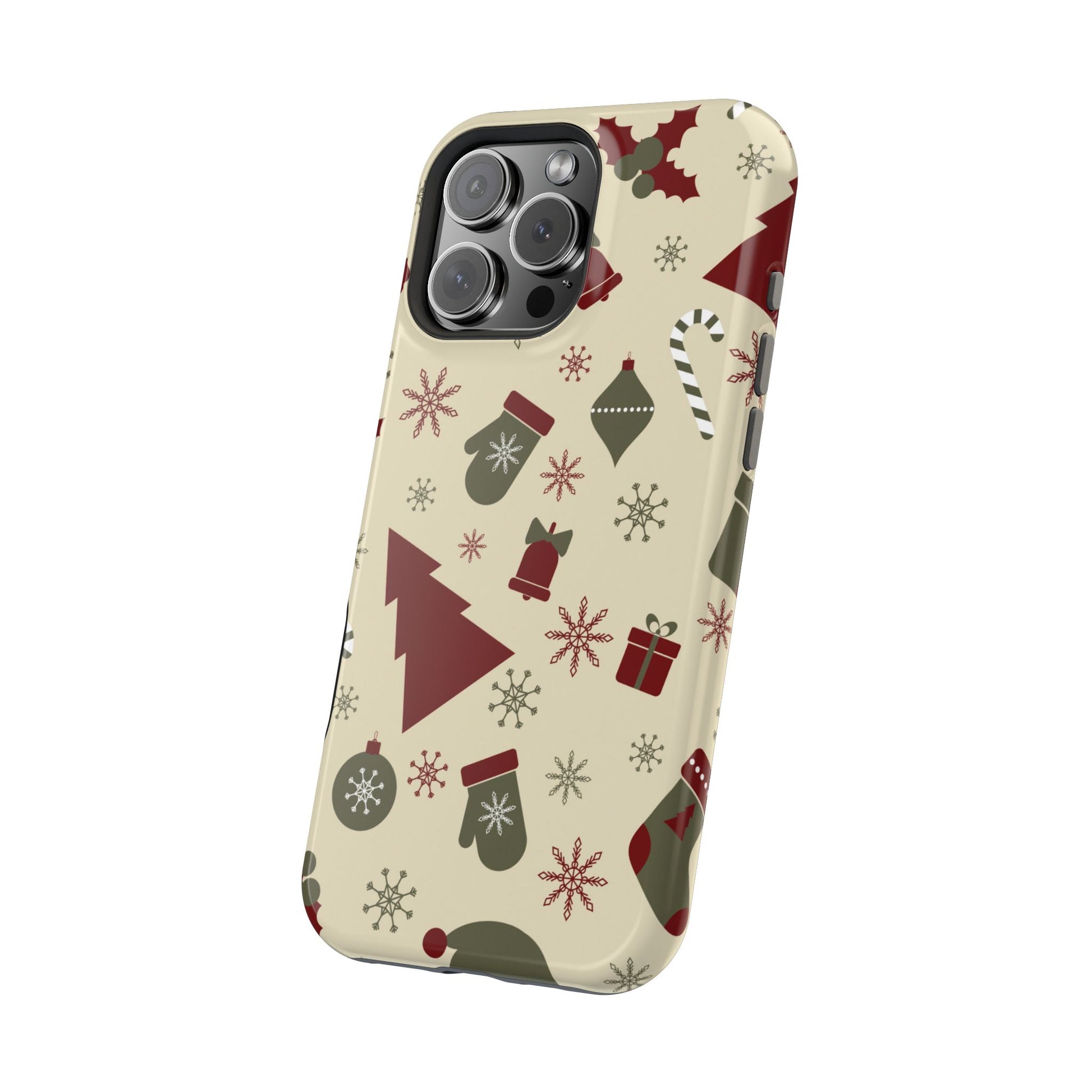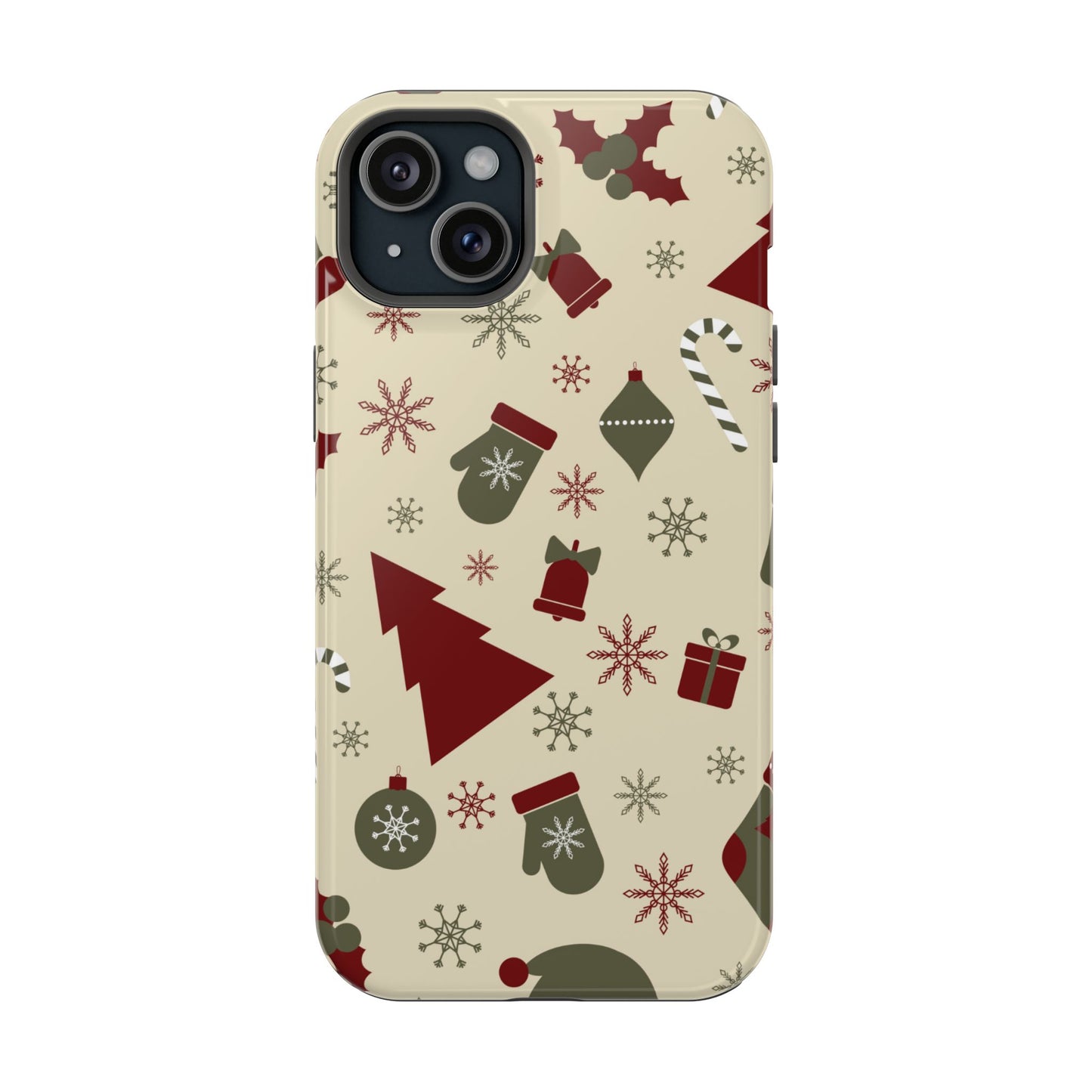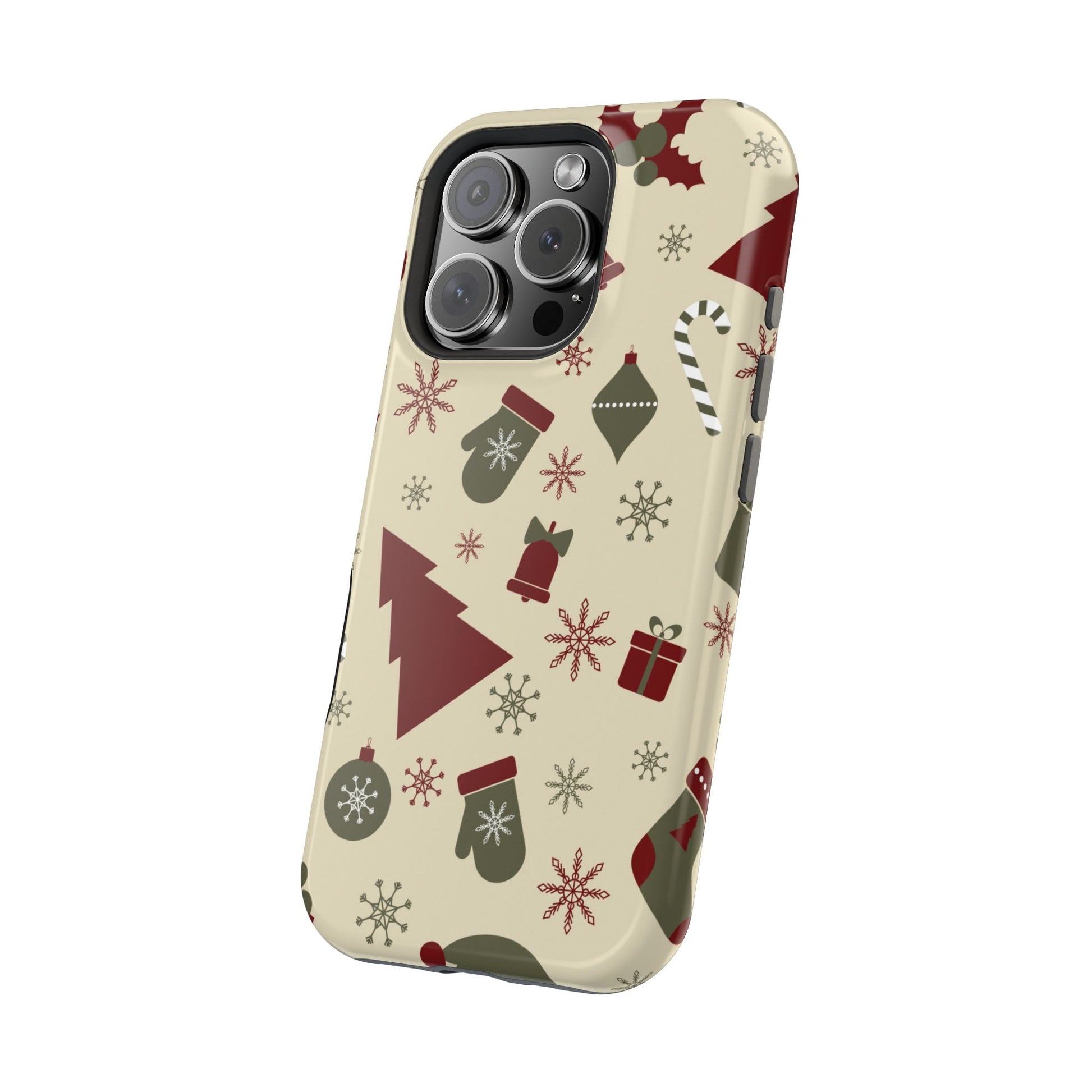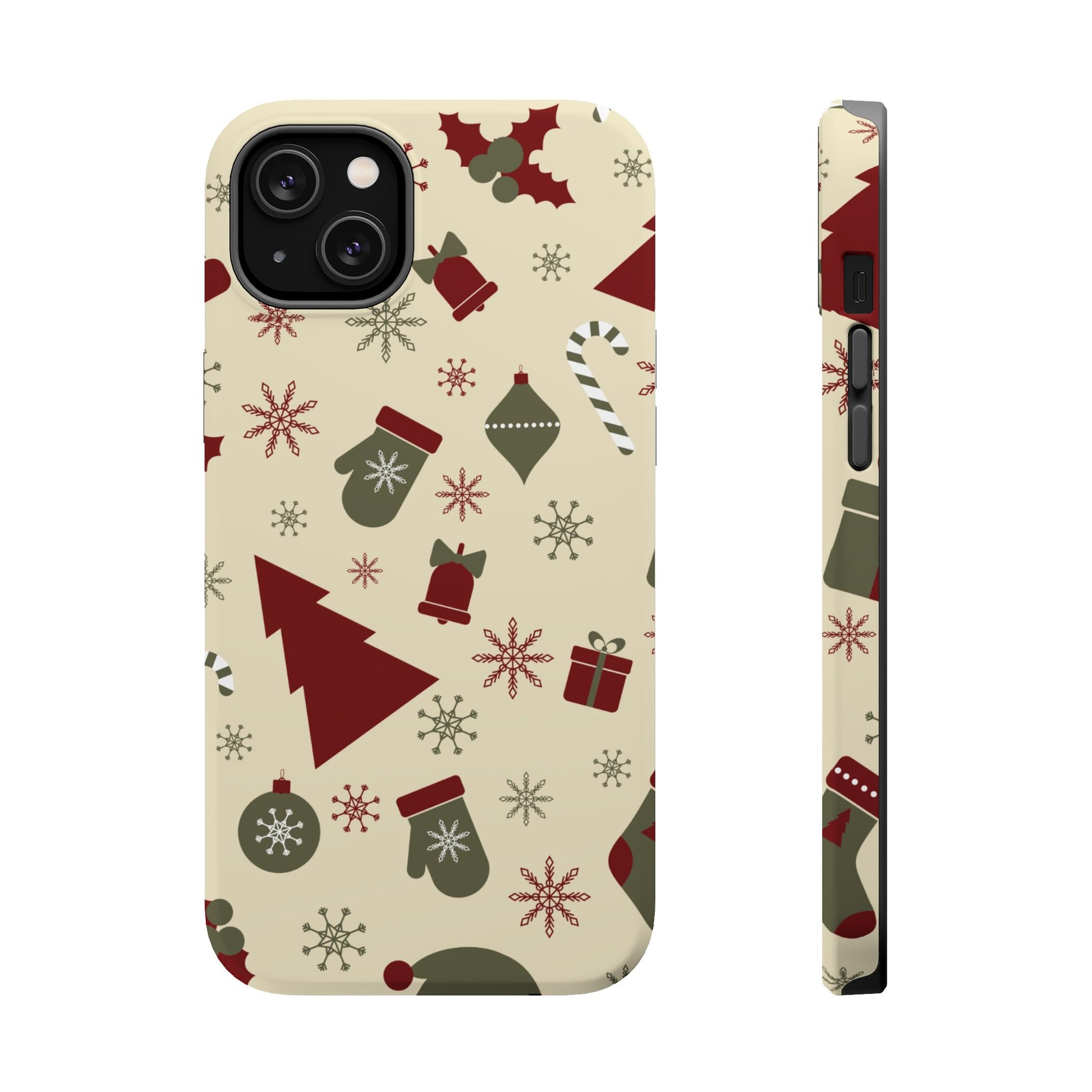Embrace the spirit of the season with our Vintage Holiday Cheer MagSafe iPhone Case! This charming design showcases festive icons in classic red, green, and cream tones, including snowflakes, Christmas trees, candy canes, and gift boxes, all set on a warm, beige background. Perfect for adding a touch of retro holiday style to your phone, this case brings nostalgic holiday vibes wherever you go. Crafted from durable materials, it provides reliable protection against everyday bumps and scratches while keeping your phone lightweight and sleek. Celebrate the holidays in style with this festive, functional case!
