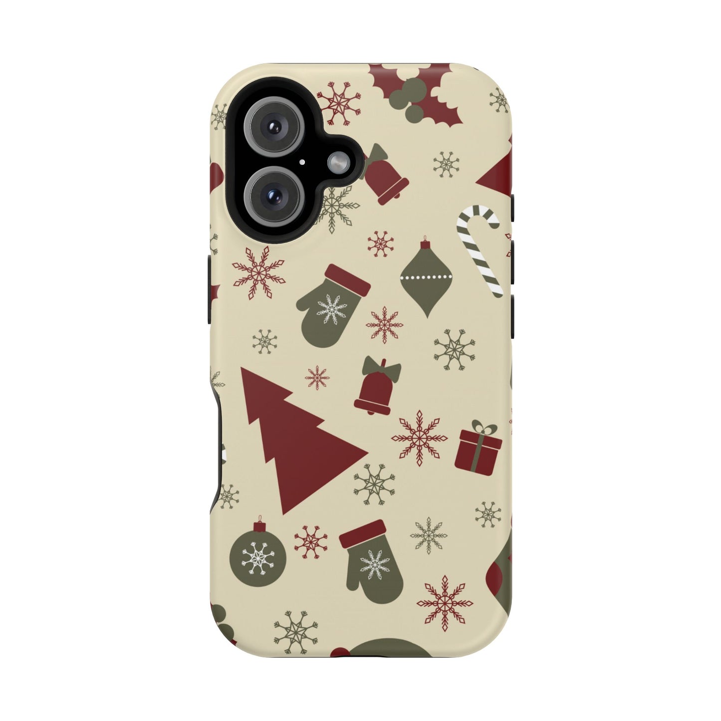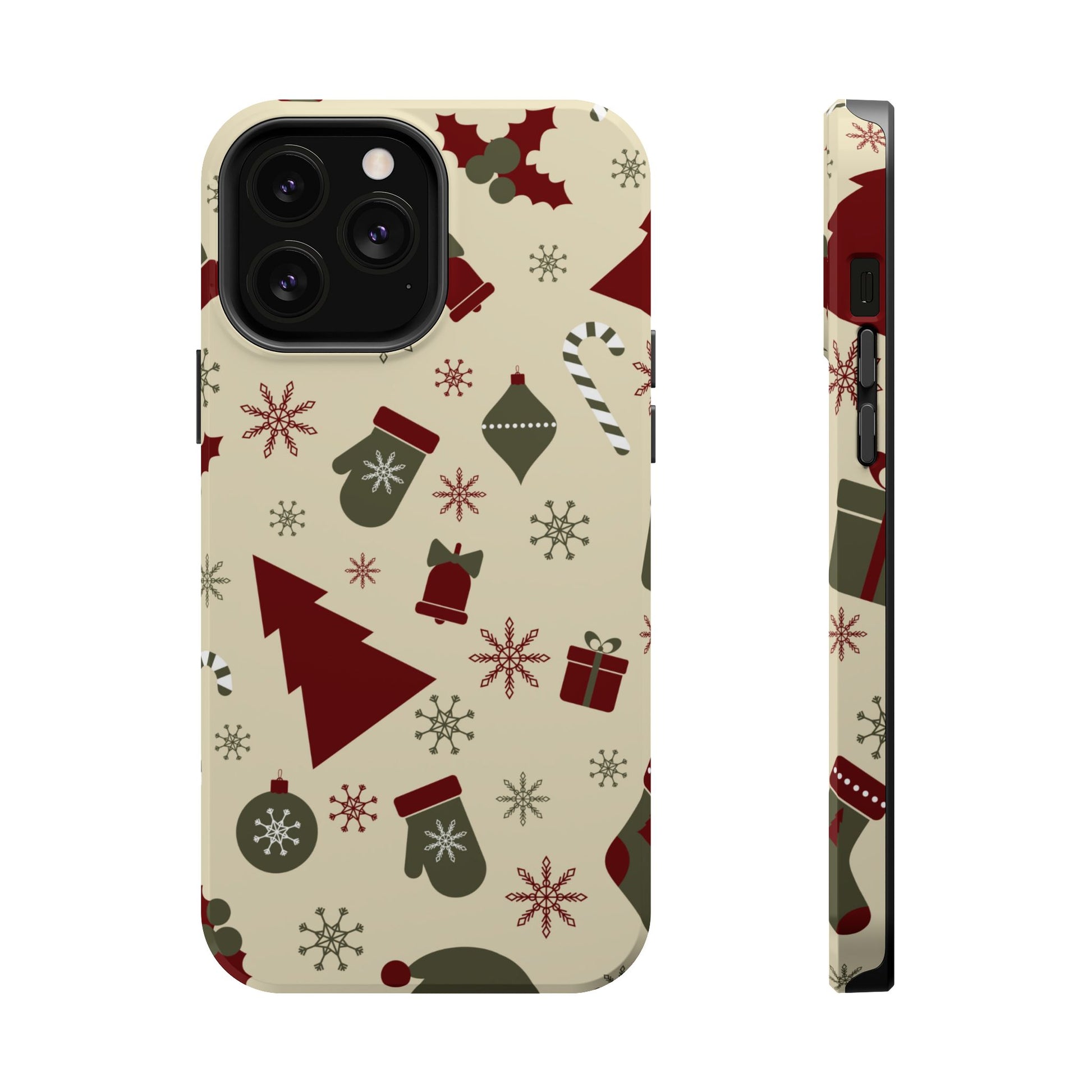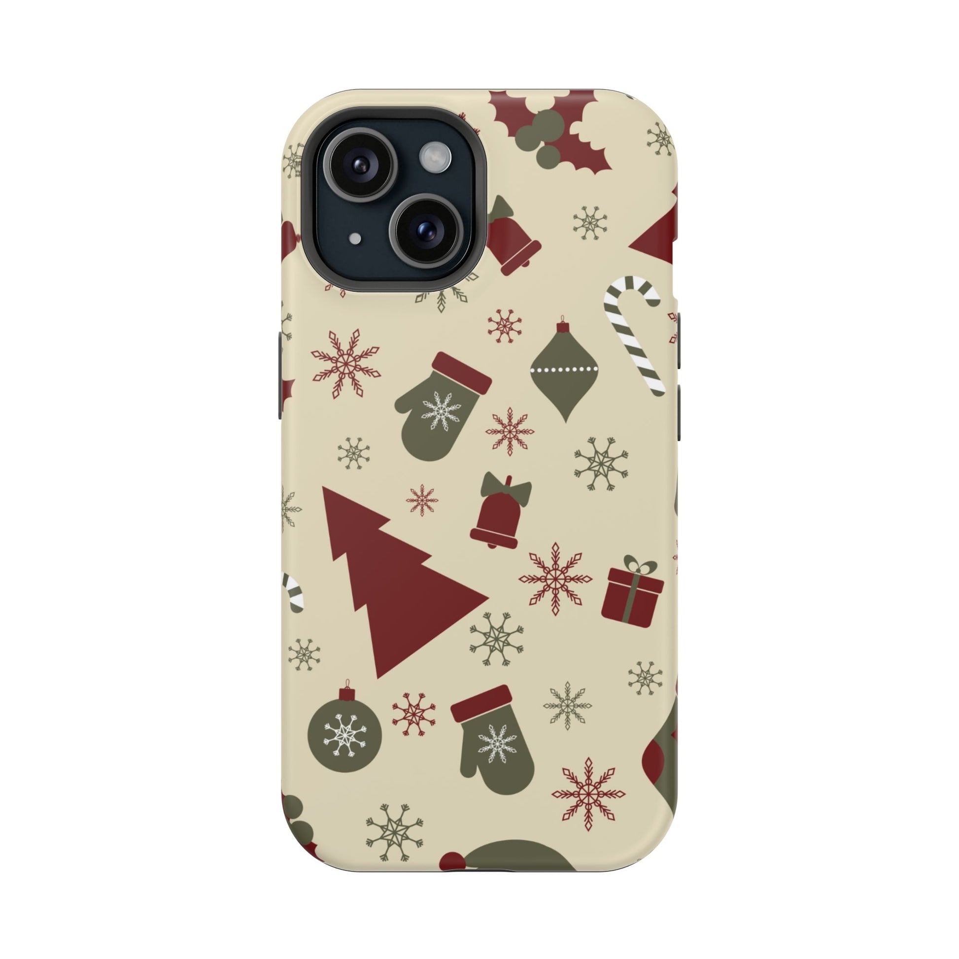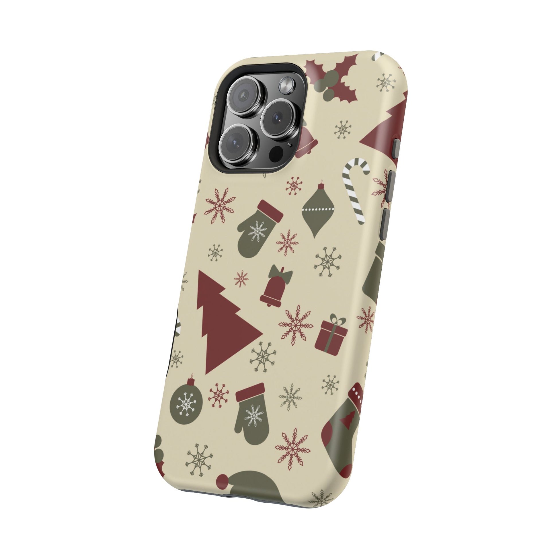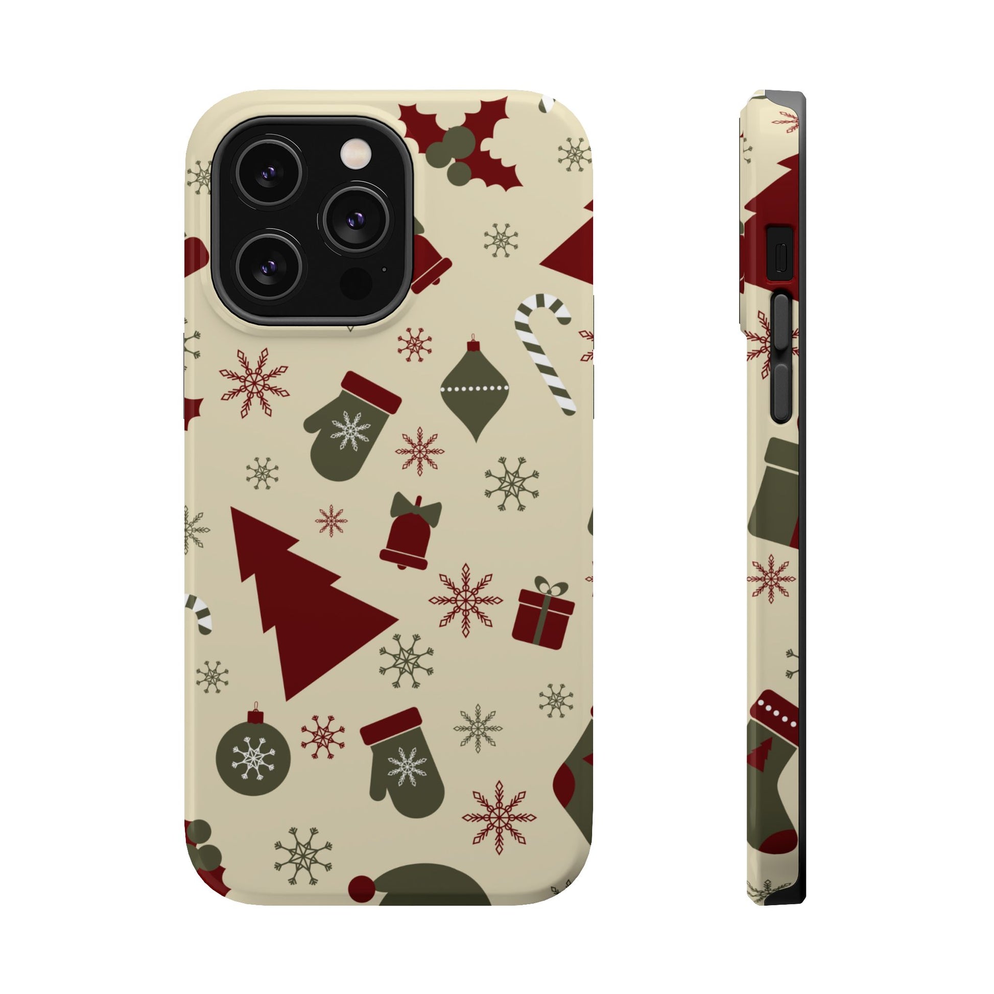 Embrace the spirit of the season with our Vintage Holiday Cheer MagSafe iPhone Case! This charming design showcases festive icons in classic red, green, and cream tones, including snowflakes, Christmas trees, candy canes, and gift boxes, all set on a warm, beige background. Perfect for adding a touch of retro holiday style to your phone, this case brings nostalgic holiday vibes wherever you go. Crafted from durable materials, it provides reliable protection against everyday bumps and scratches while keeping your phone lightweight and sleek. Celebrate the holidays in style with this festive, functional case!