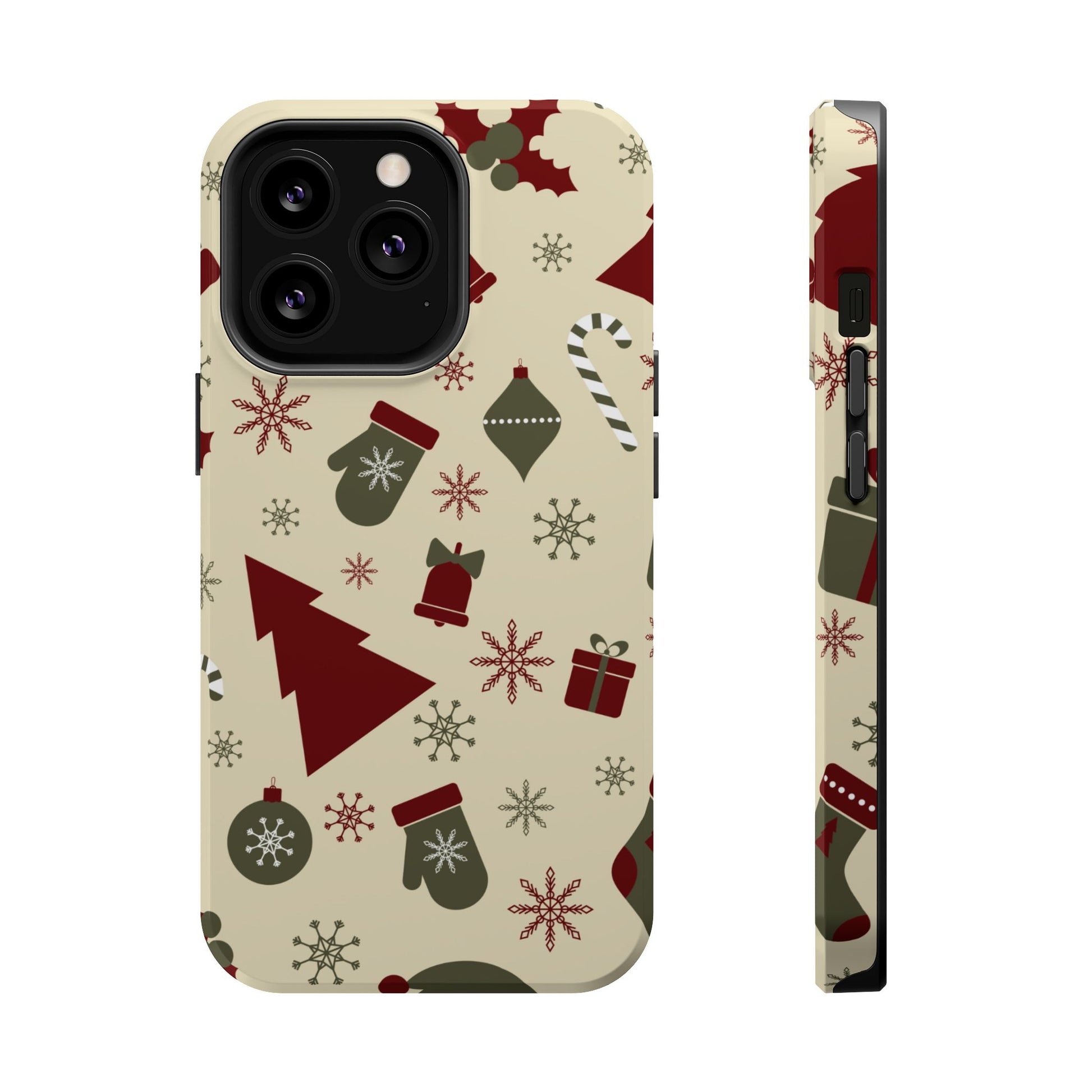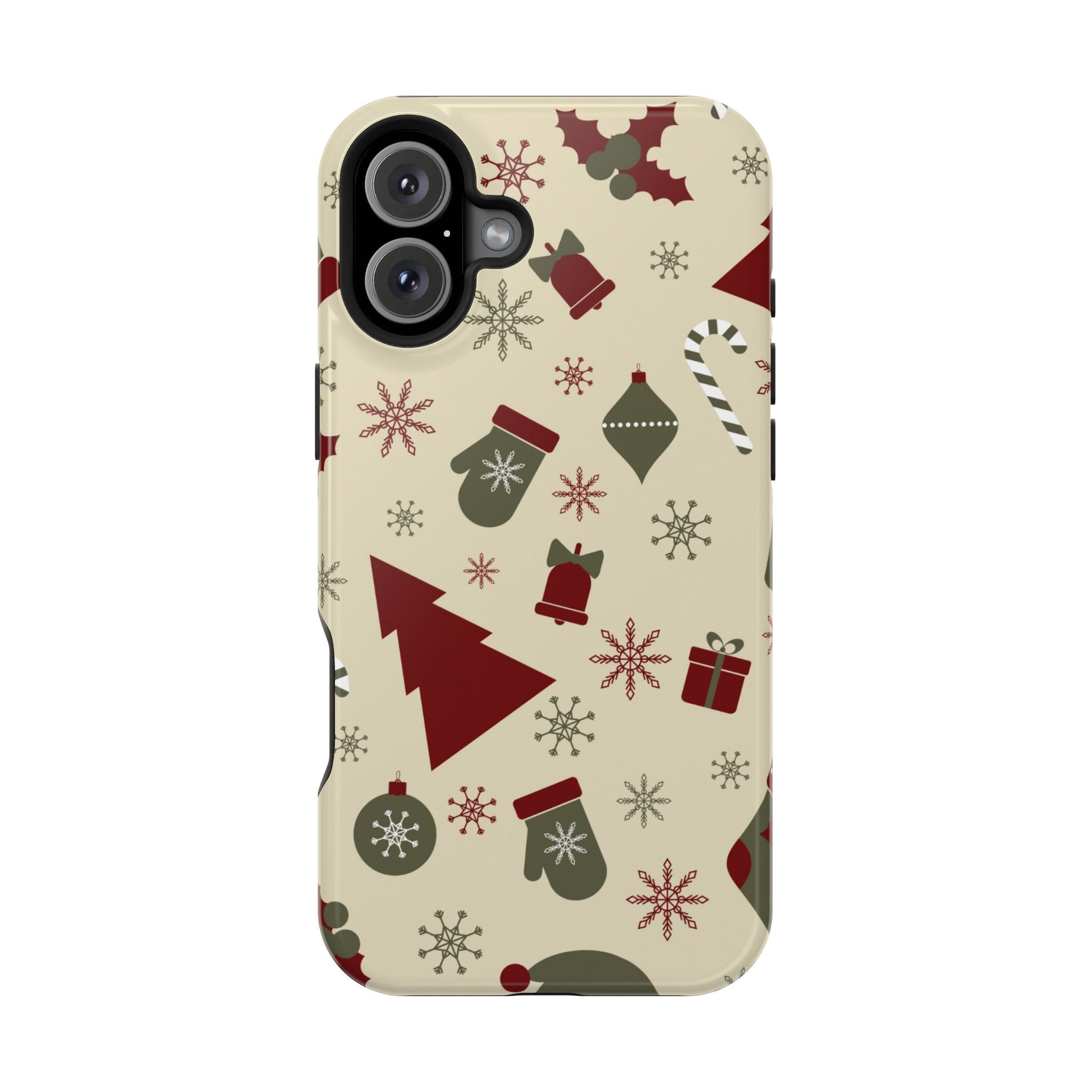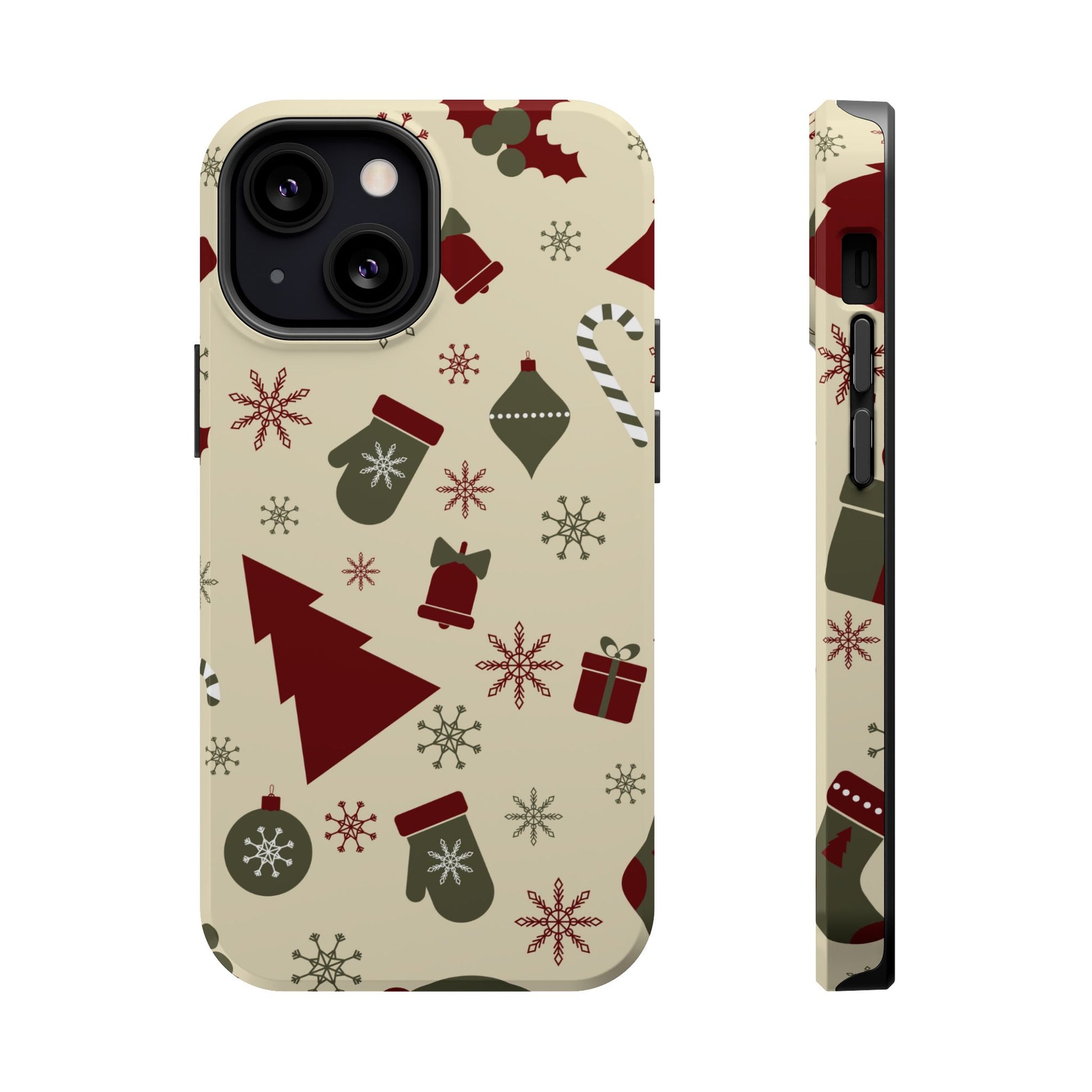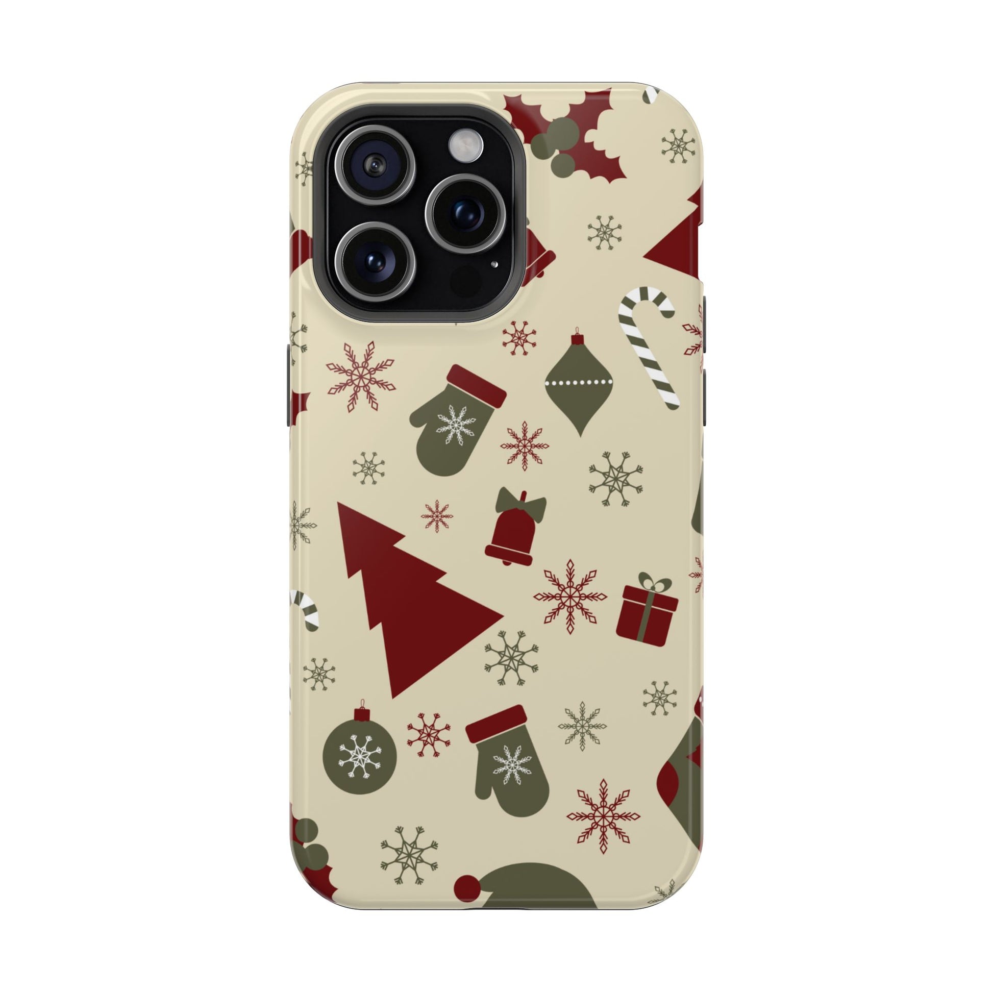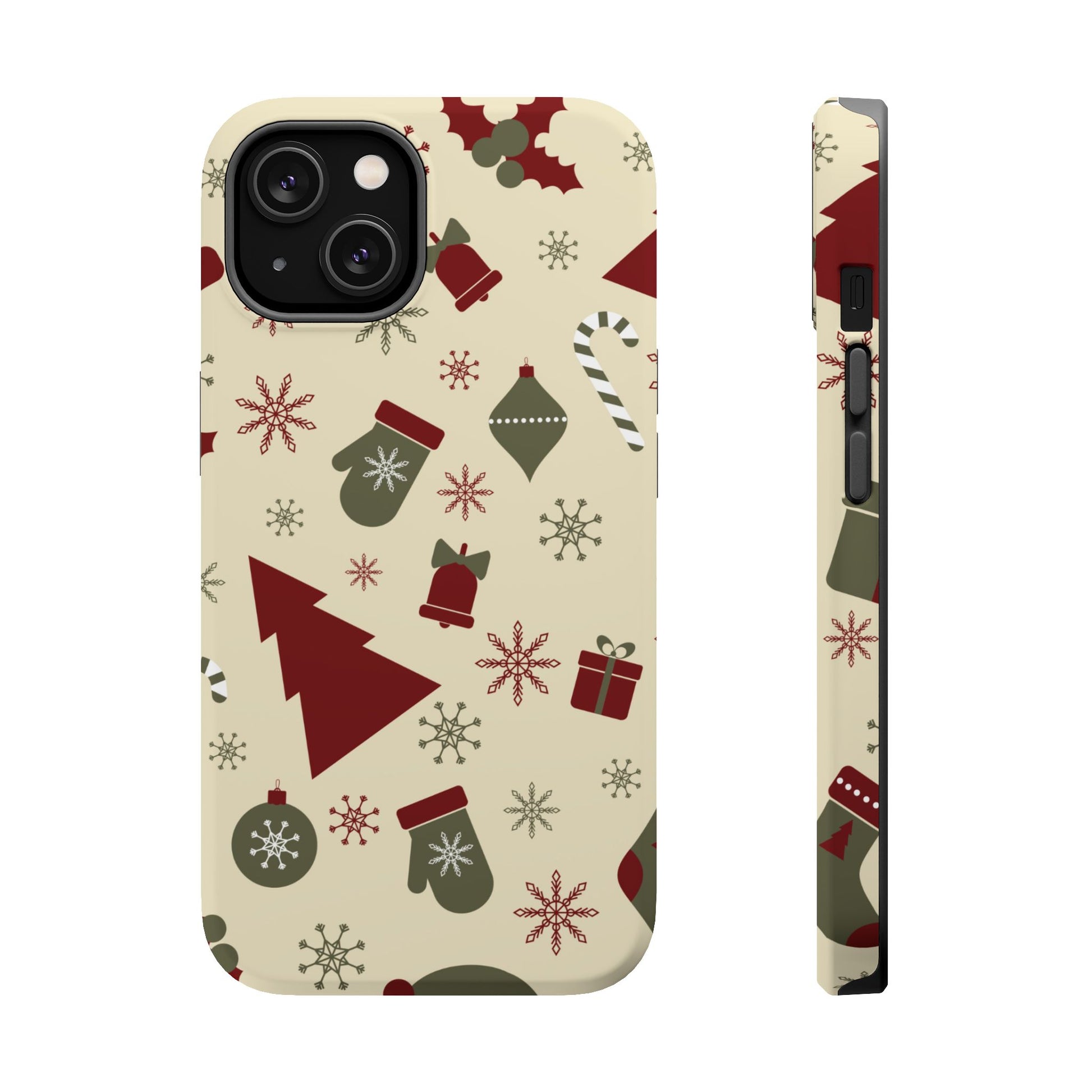 Embrace the spirit of the season with our Vintage Holiday Cheer MagSafe iPhone Case! This charming design showcases festive icons in classic red, green, and cream tones, including snowflakes, Christmas trees, candy canes, and gift boxes, all set on a warm, beige background. Perfect for adding a touch of retro holiday style to your phone, this case brings nostalgic holiday vibes wherever you go. Crafted from durable materials, it provides reliable protection against everyday bumps and scratches while keeping your phone lightweight and sleek. Celebrate the holidays in style with this festive, functional case!