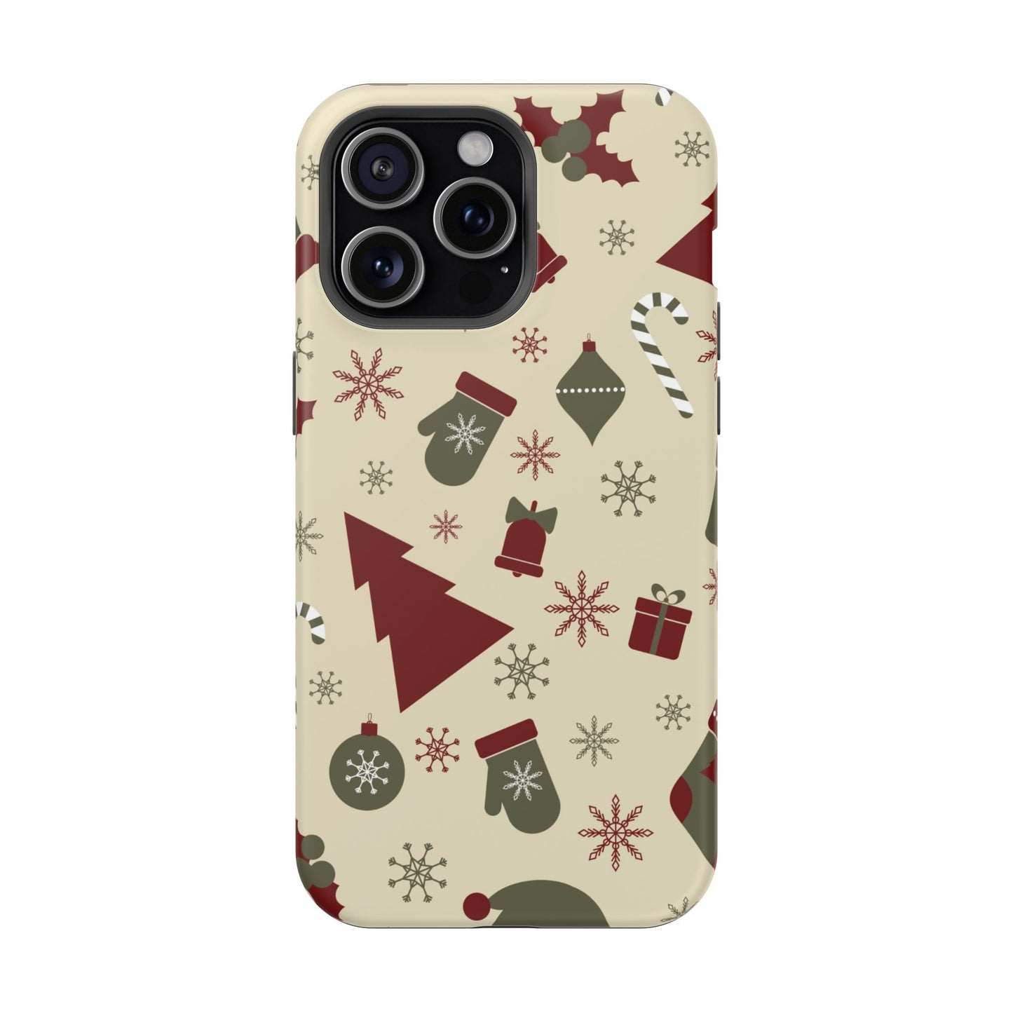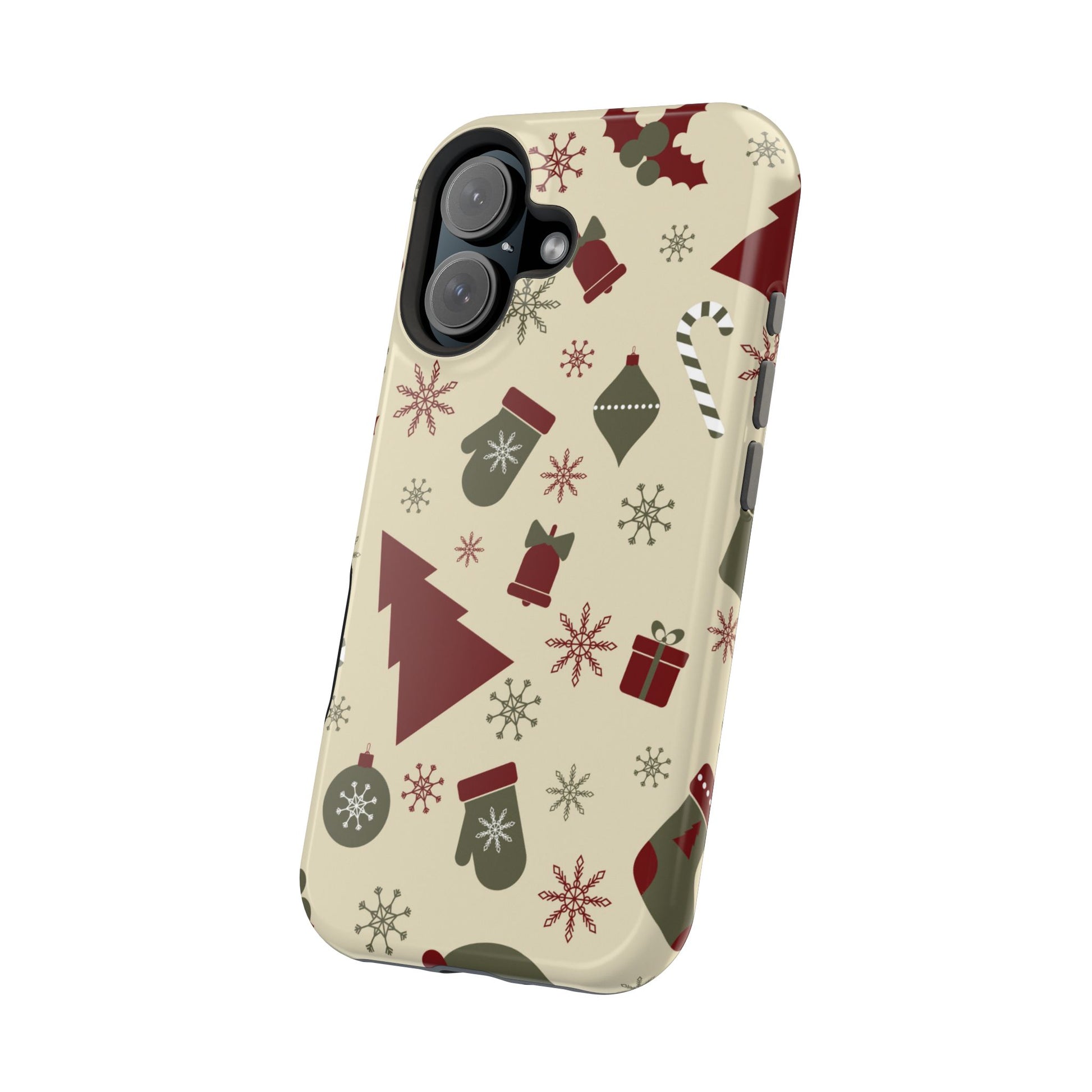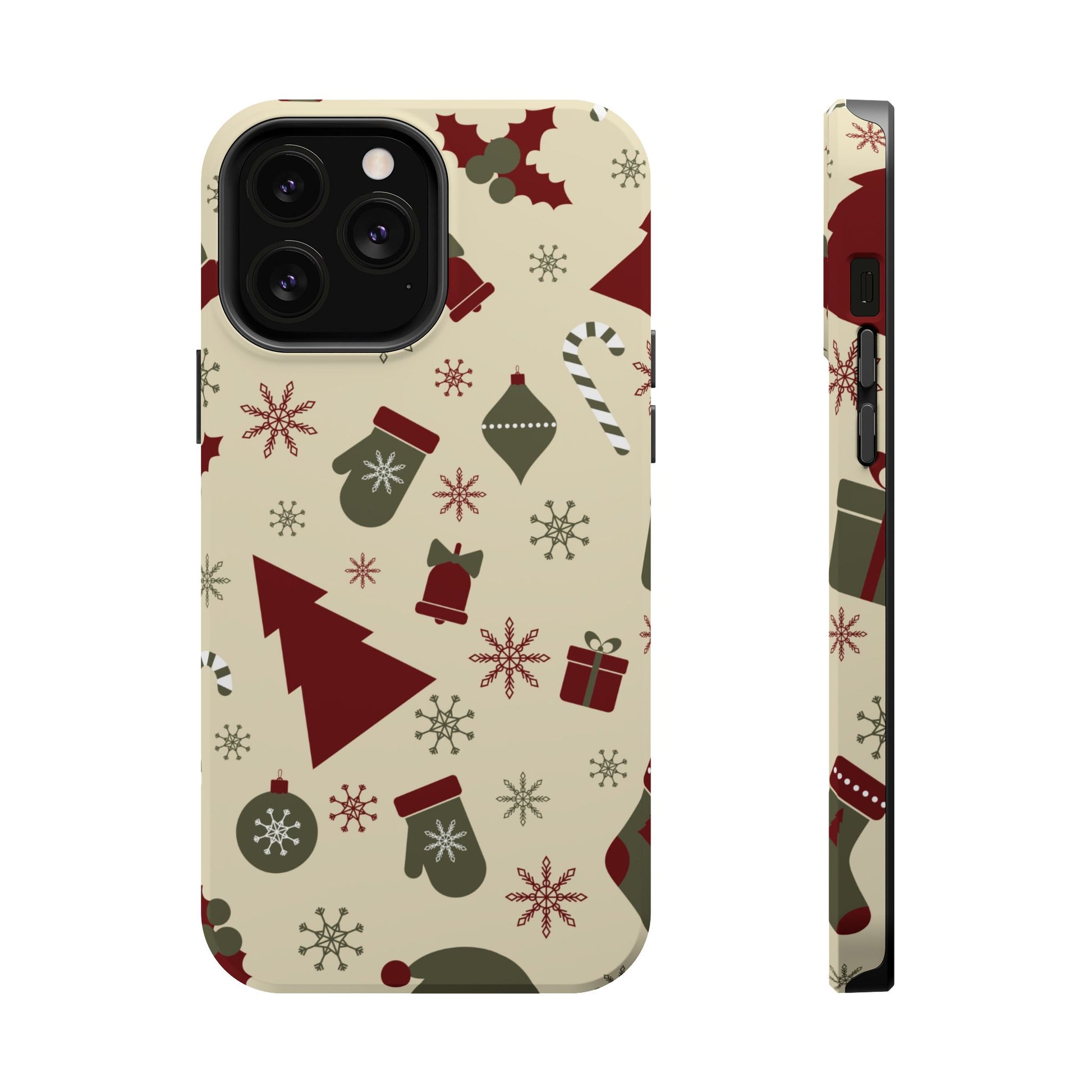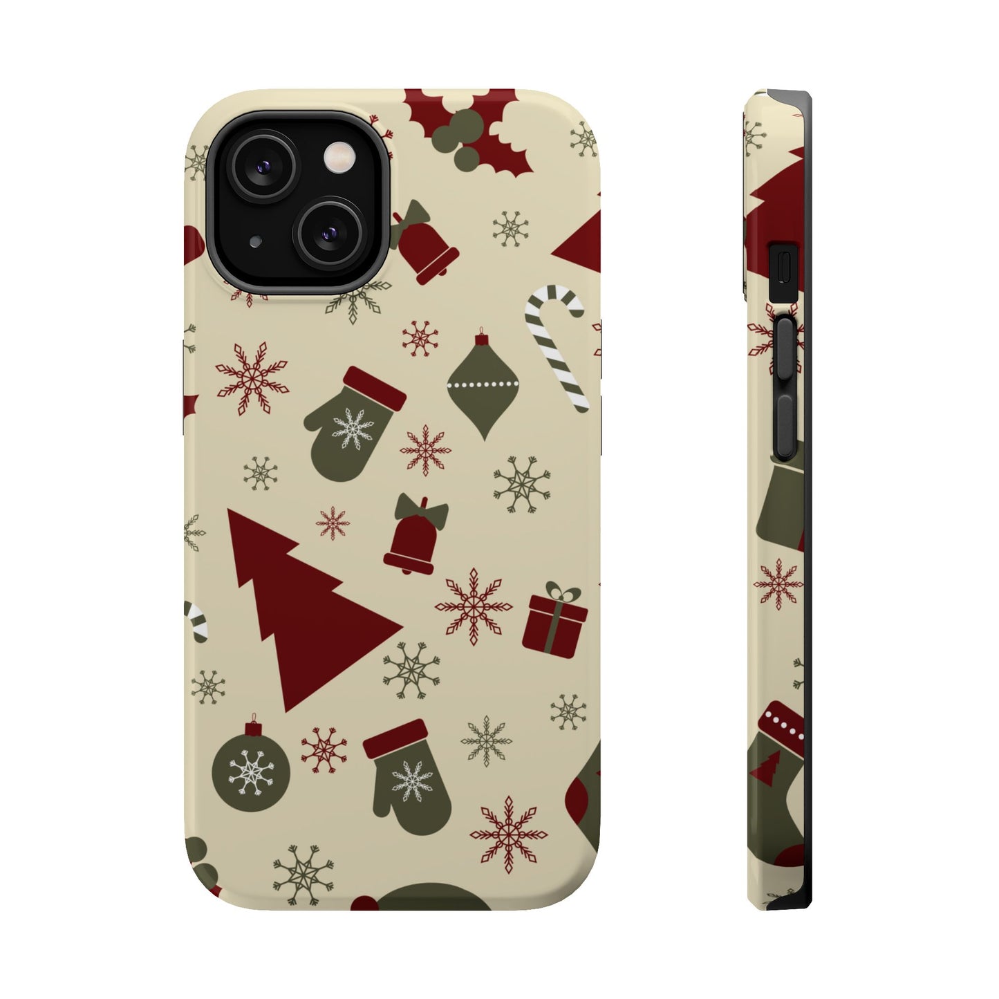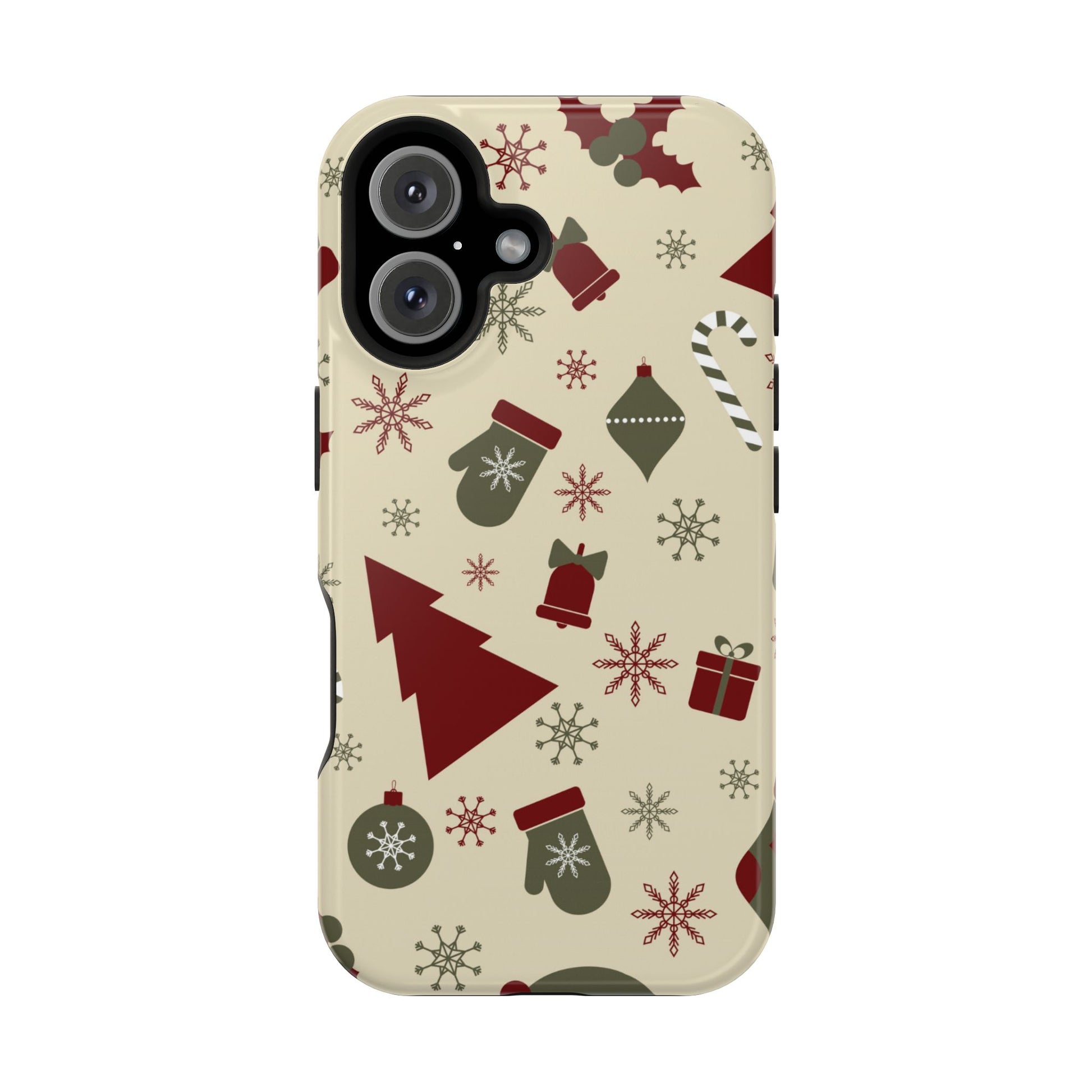 Embrace the spirit of the season with our Vintage Holiday Cheer MagSafe iPhone Case! This charming design showcases festive icons in classic red, green, and cream tones, including snowflakes, Christmas trees, candy canes, and gift boxes, all set on a warm, beige background. Perfect for adding a touch of retro holiday style to your phone, this case brings nostalgic holiday vibes wherever you go. Crafted from durable materials, it provides reliable protection against everyday bumps and scratches while keeping your phone lightweight and sleek. Celebrate the holidays in style with this festive, functional case!