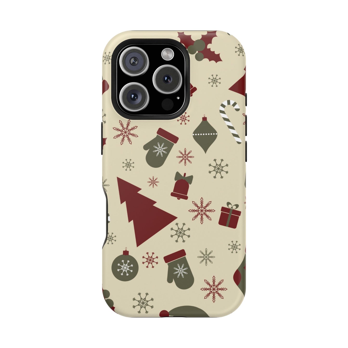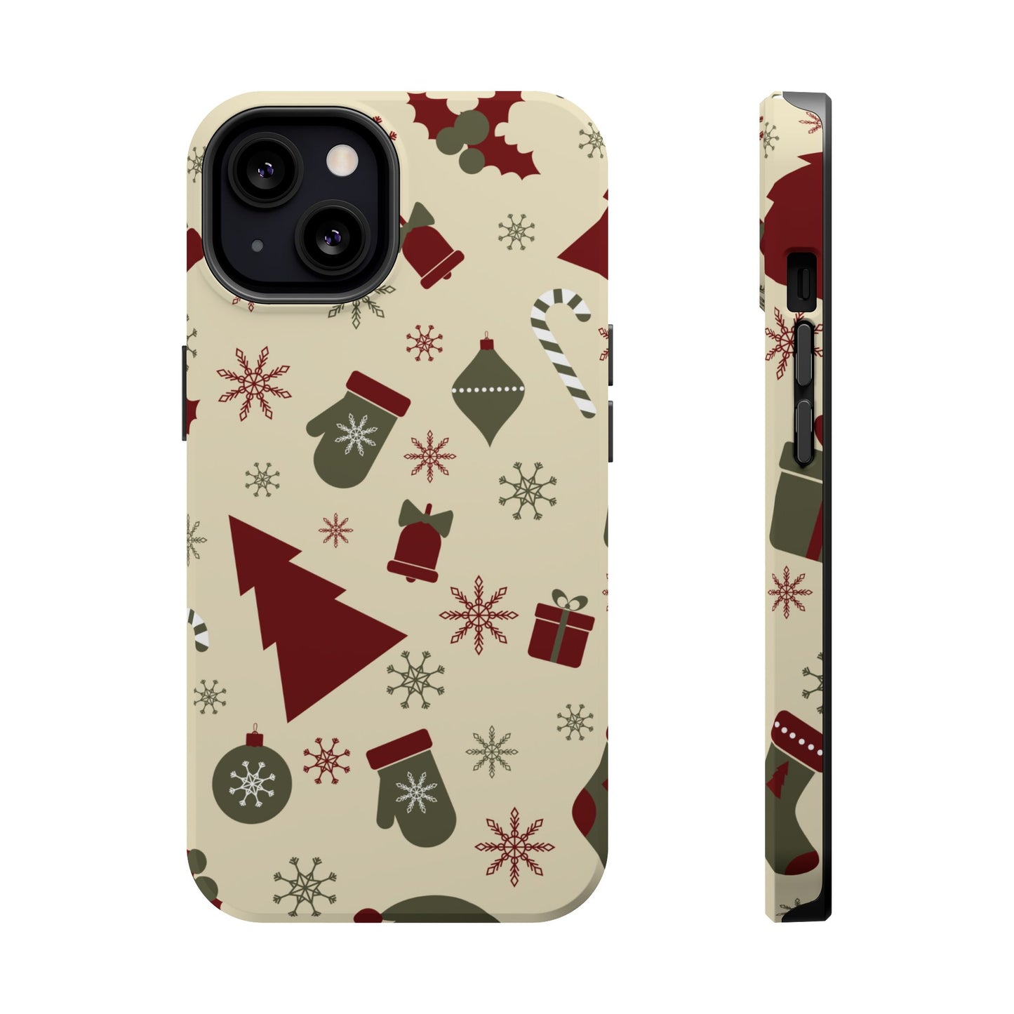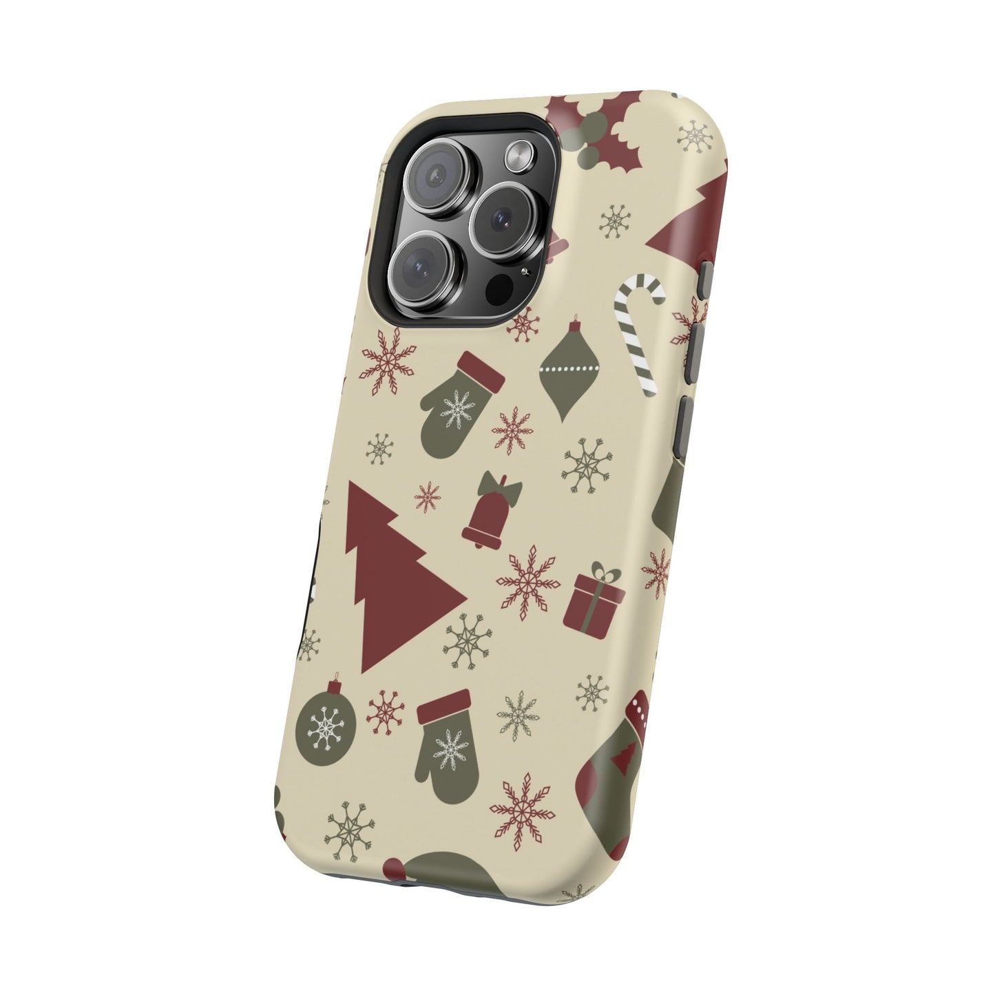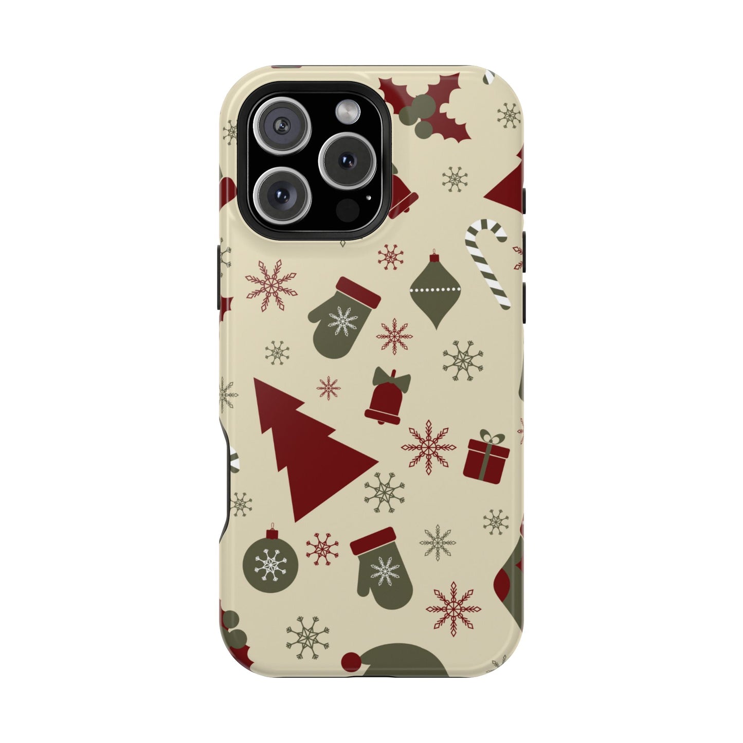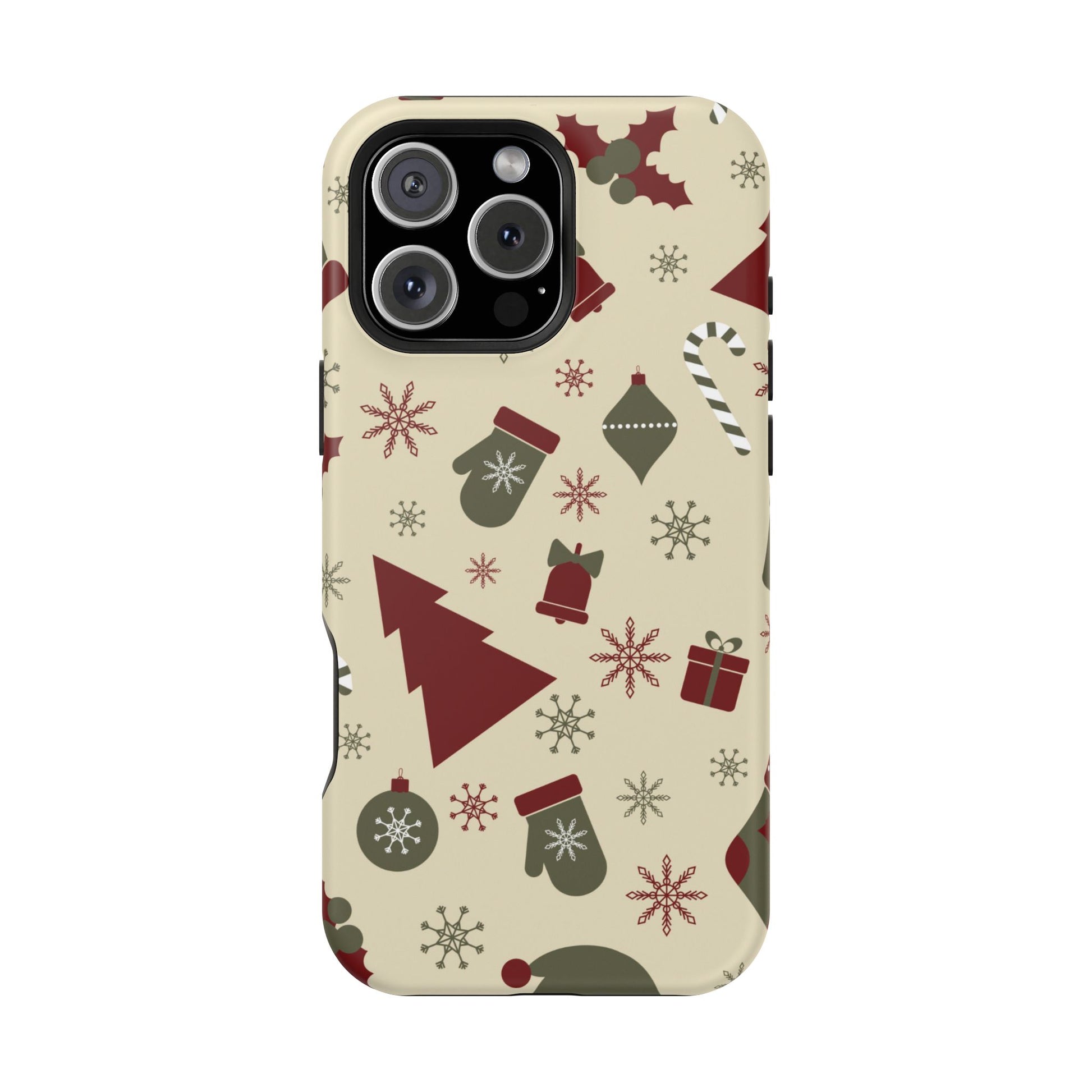 Embrace the spirit of the season with our Vintage Holiday Cheer MagSafe iPhone Case! This charming design showcases festive icons in classic red, green, and cream tones, including snowflakes, Christmas trees, candy canes, and gift boxes, all set on a warm, beige background. Perfect for adding a touch of retro holiday style to your phone, this case brings nostalgic holiday vibes wherever you go. Crafted from durable materials, it provides reliable protection against everyday bumps and scratches while keeping your phone lightweight and sleek. Celebrate the holidays in style with this festive, functional case!