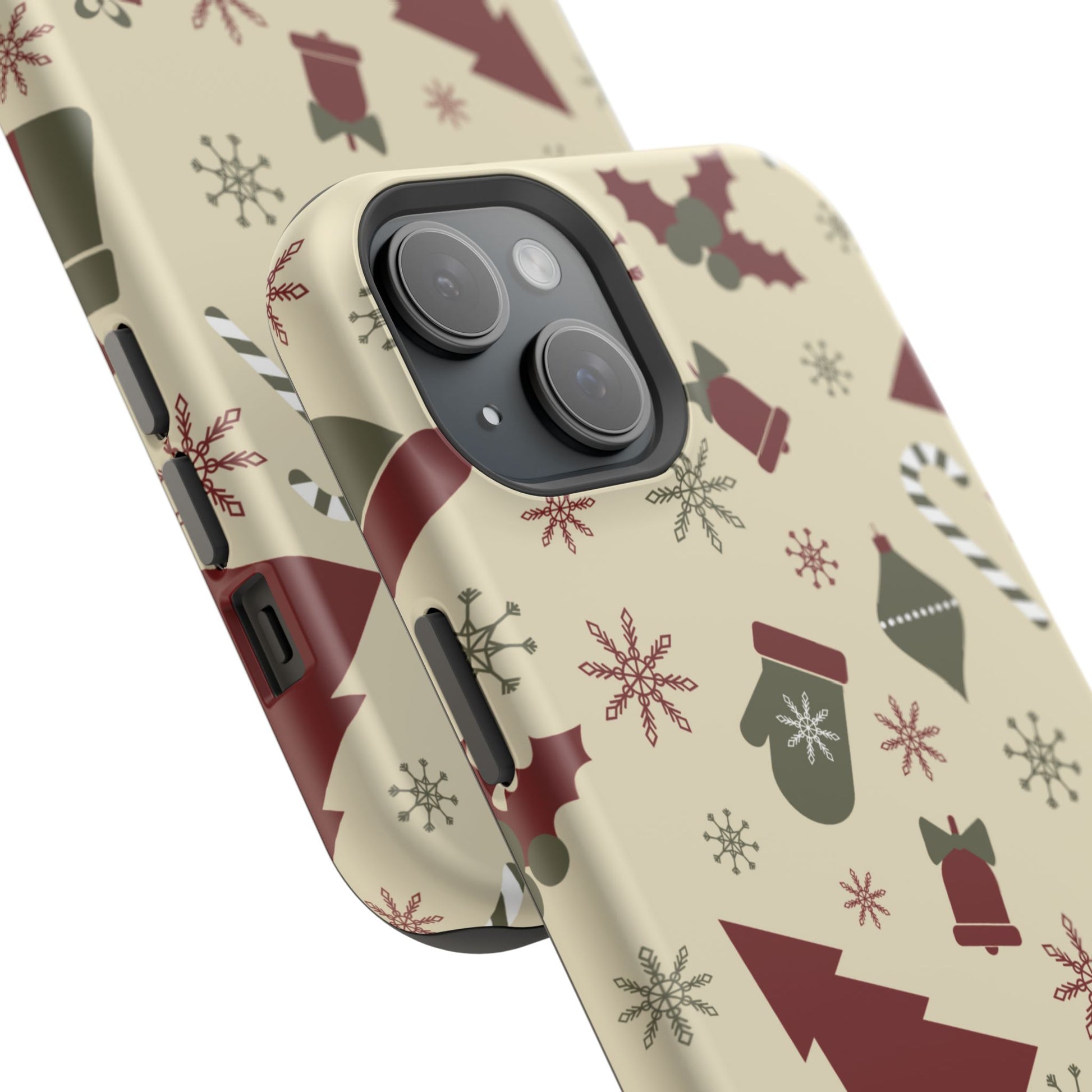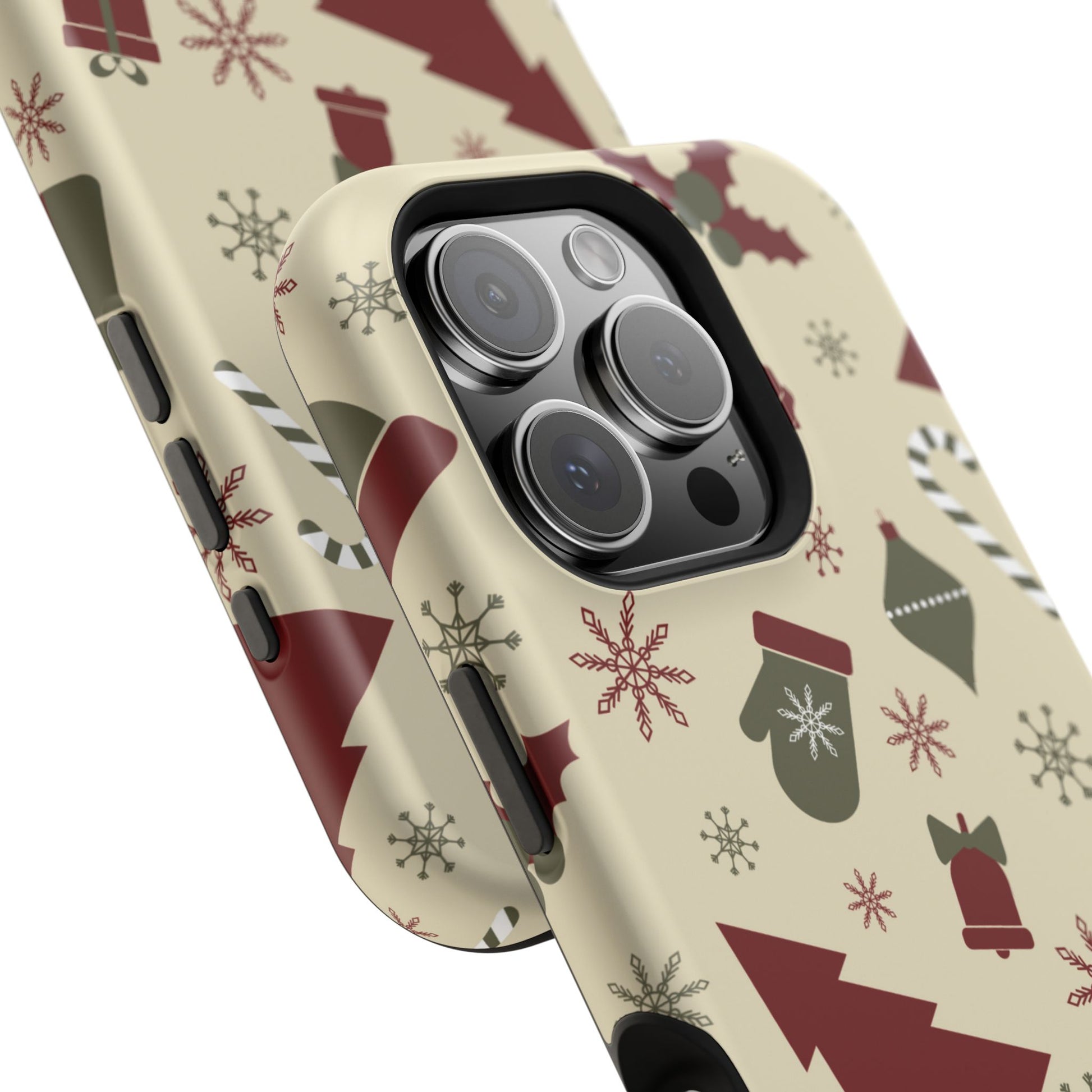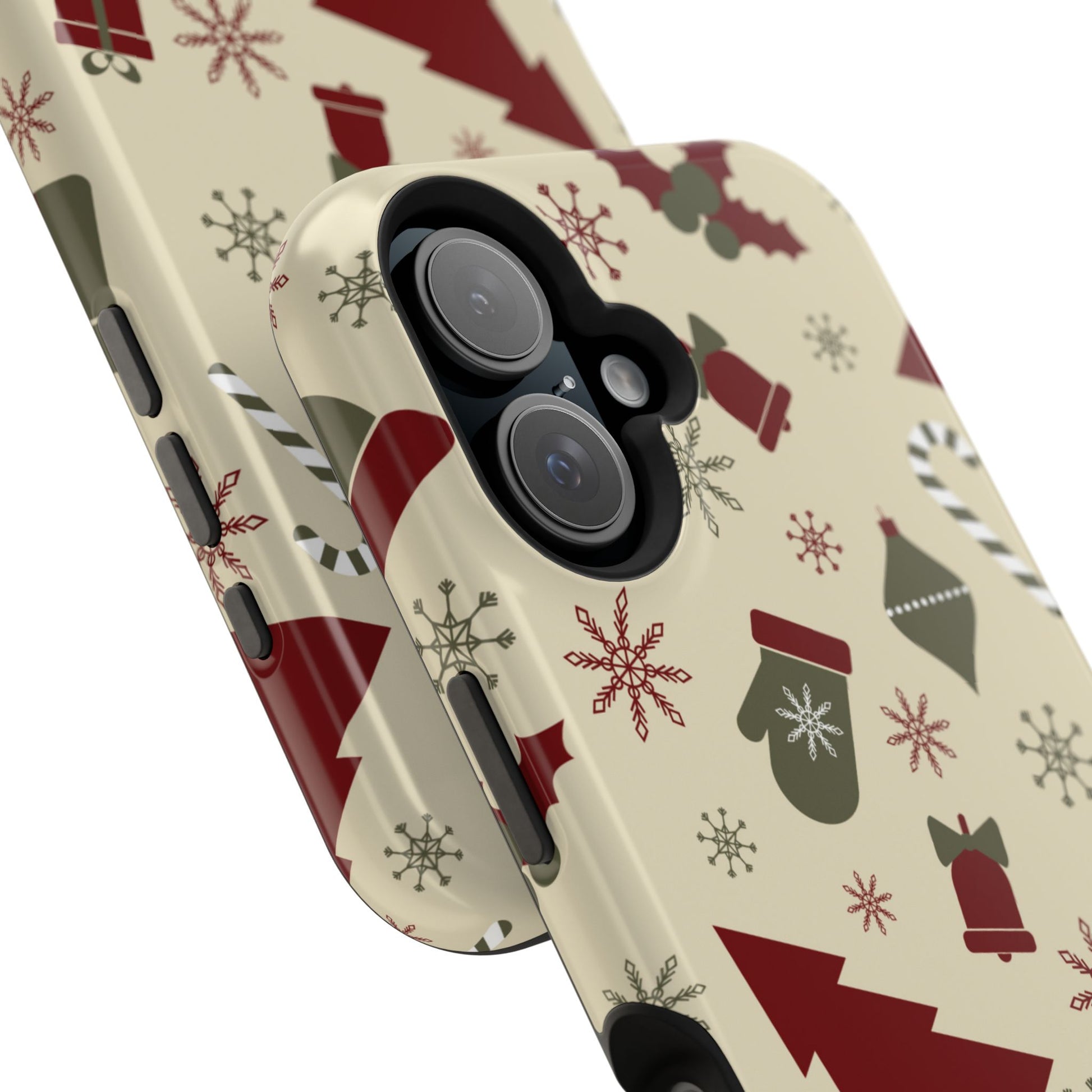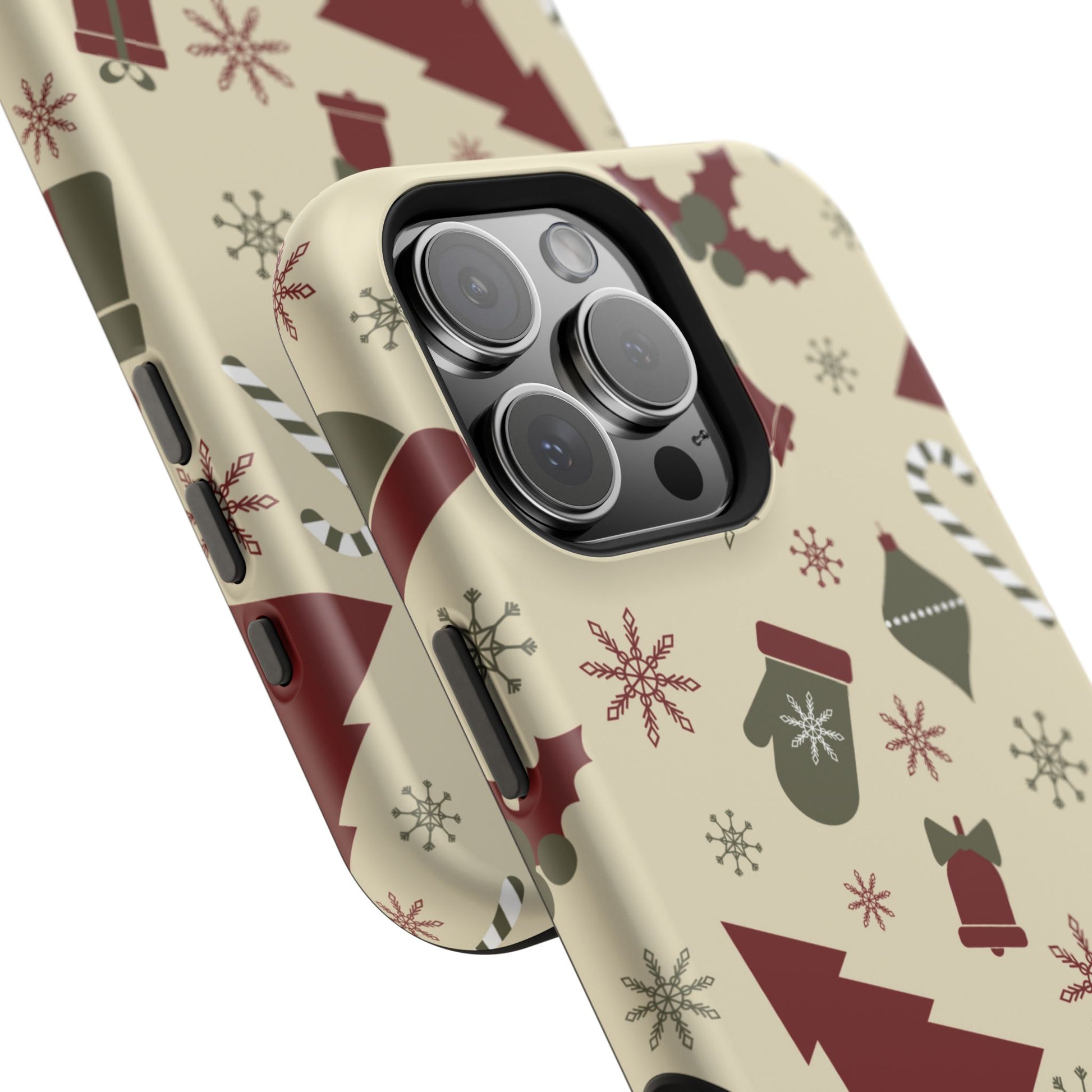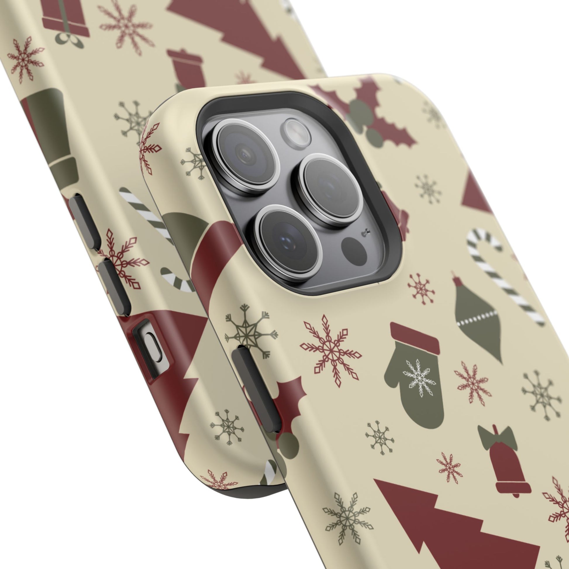 Embrace the spirit of the season with our Vintage Holiday Cheer MagSafe iPhone Case! This charming design showcases festive icons in classic red, green, and cream tones, including snowflakes, Christmas trees, candy canes, and gift boxes, all set on a warm, beige background. Perfect for adding a touch of retro holiday style to your phone, this case brings nostalgic holiday vibes wherever you go. Crafted from durable materials, it provides reliable protection against everyday bumps and scratches while keeping your phone lightweight and sleek. Celebrate the holidays in style with this festive, functional case!